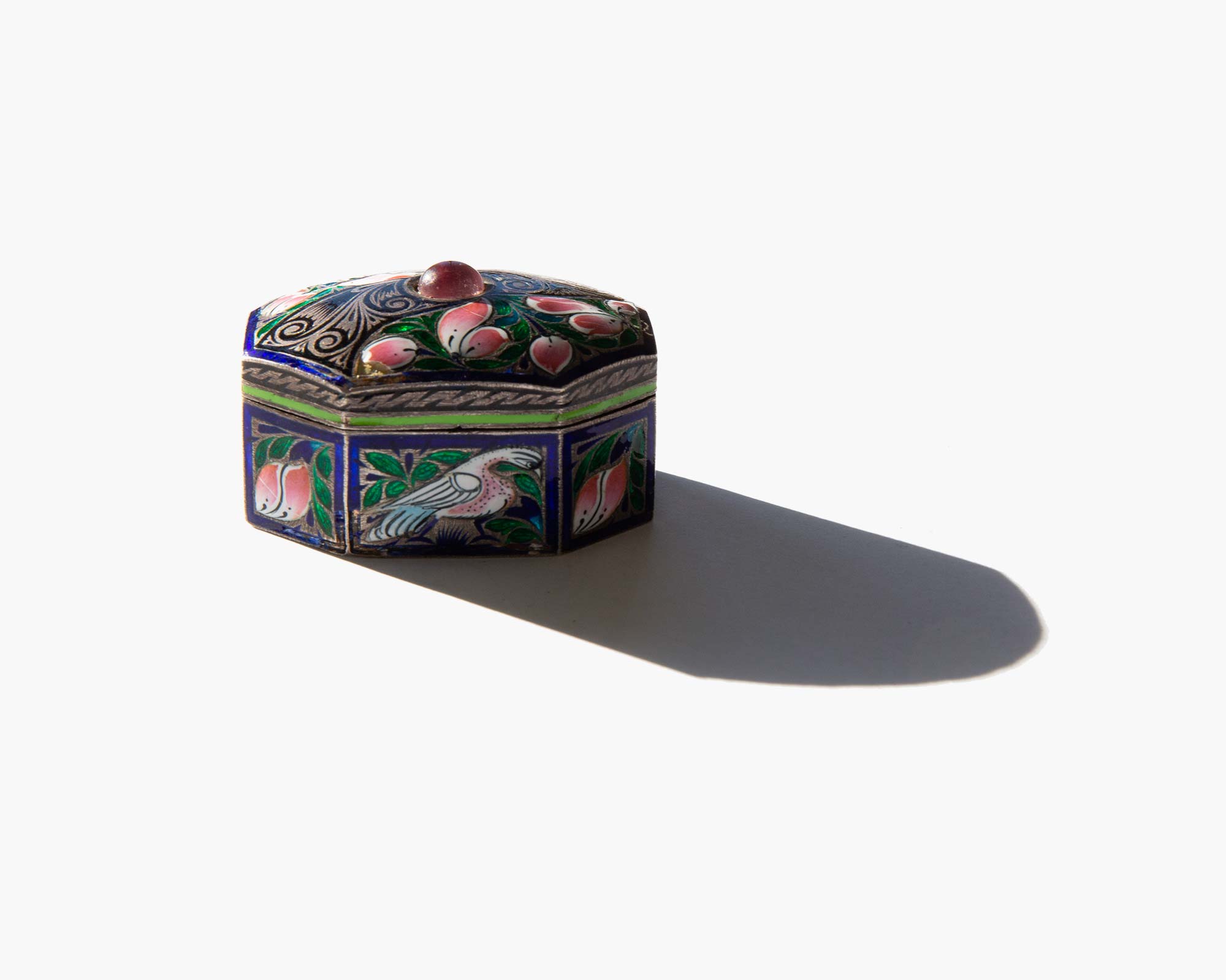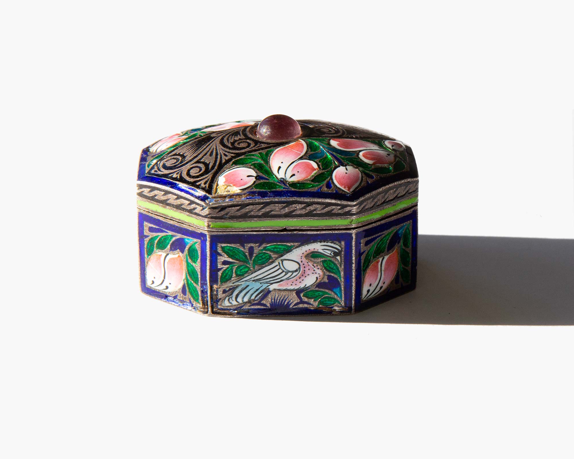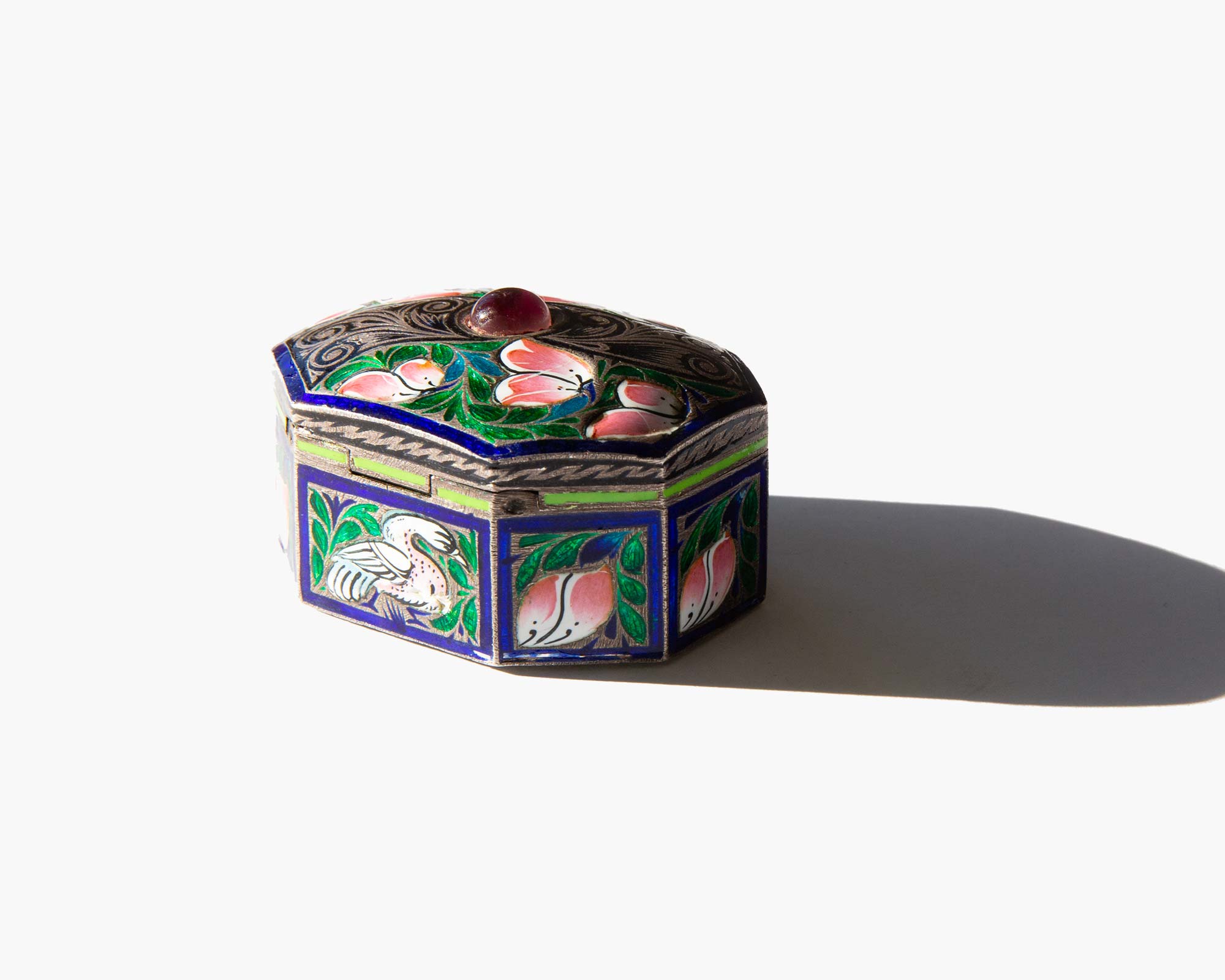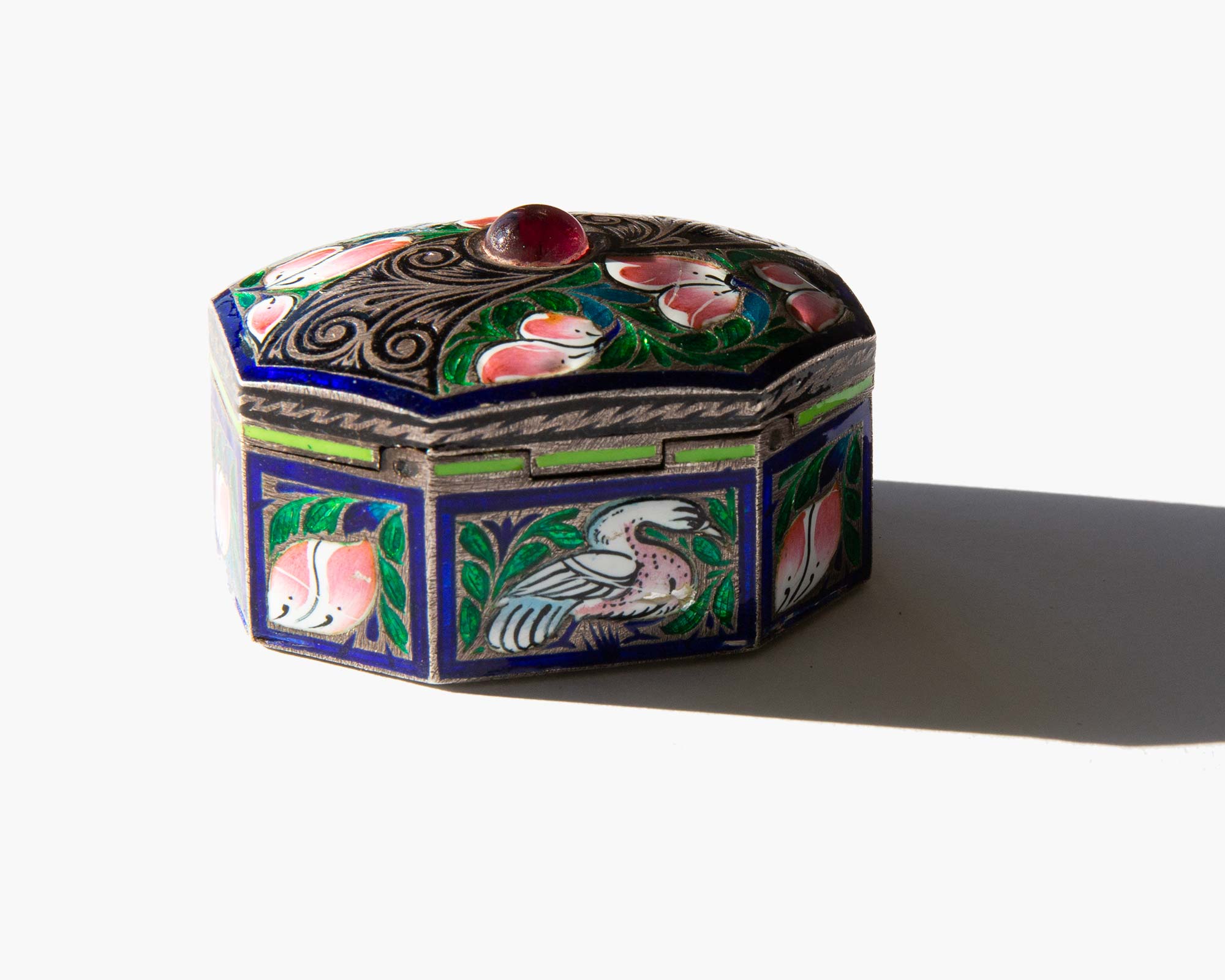 Small, antique solid sterling silver Indian cloisonné box embellished with colorful enamel.