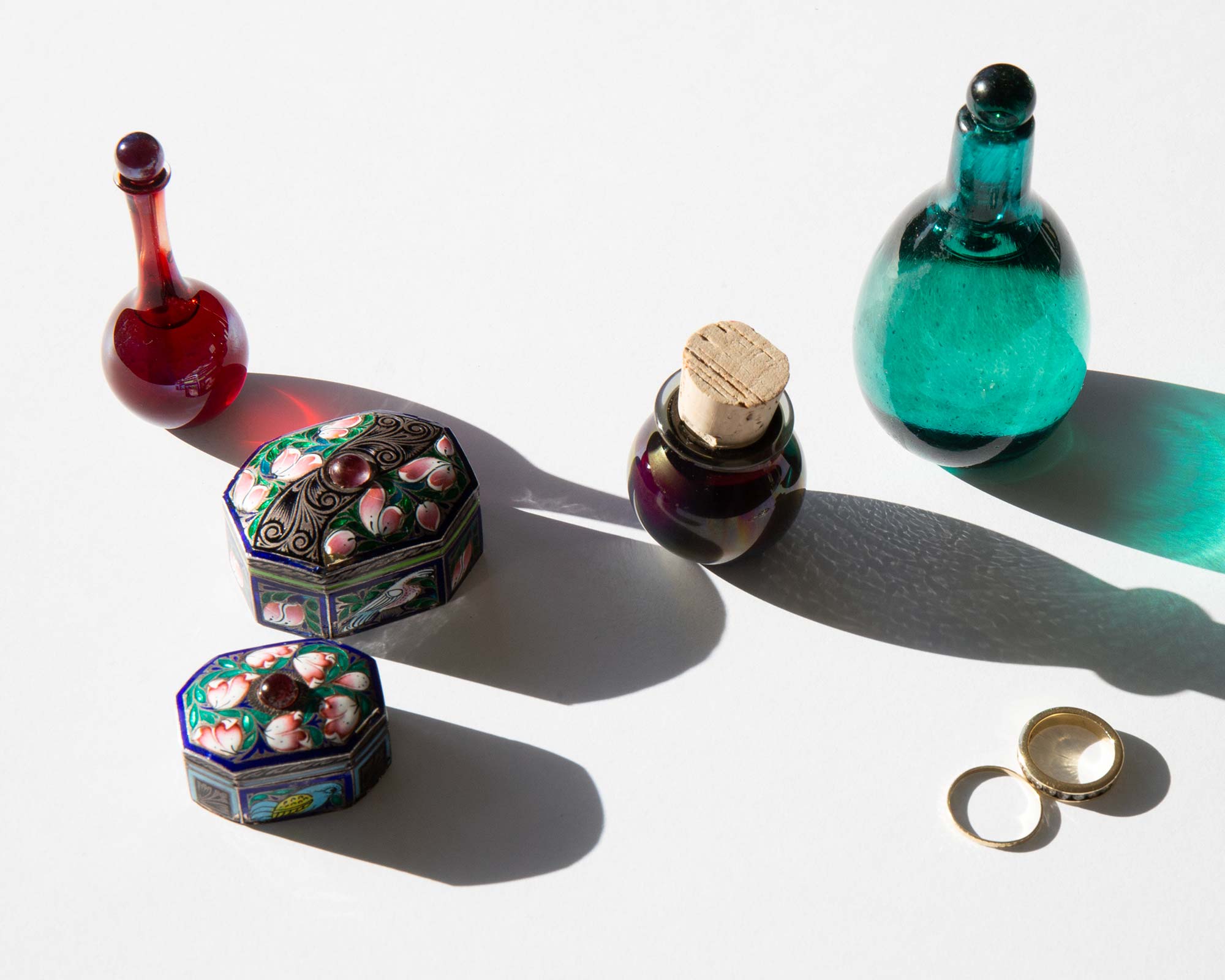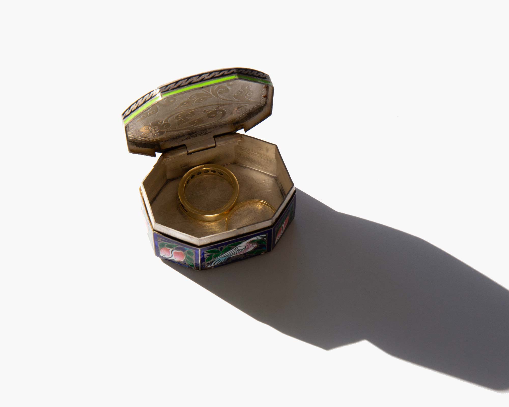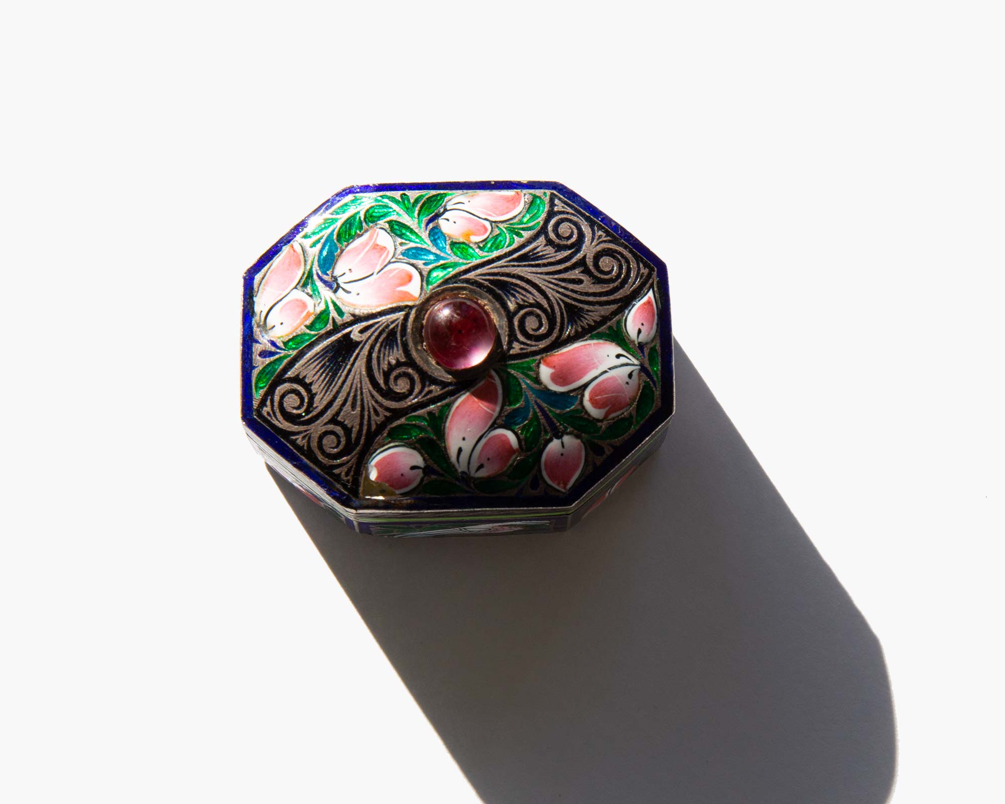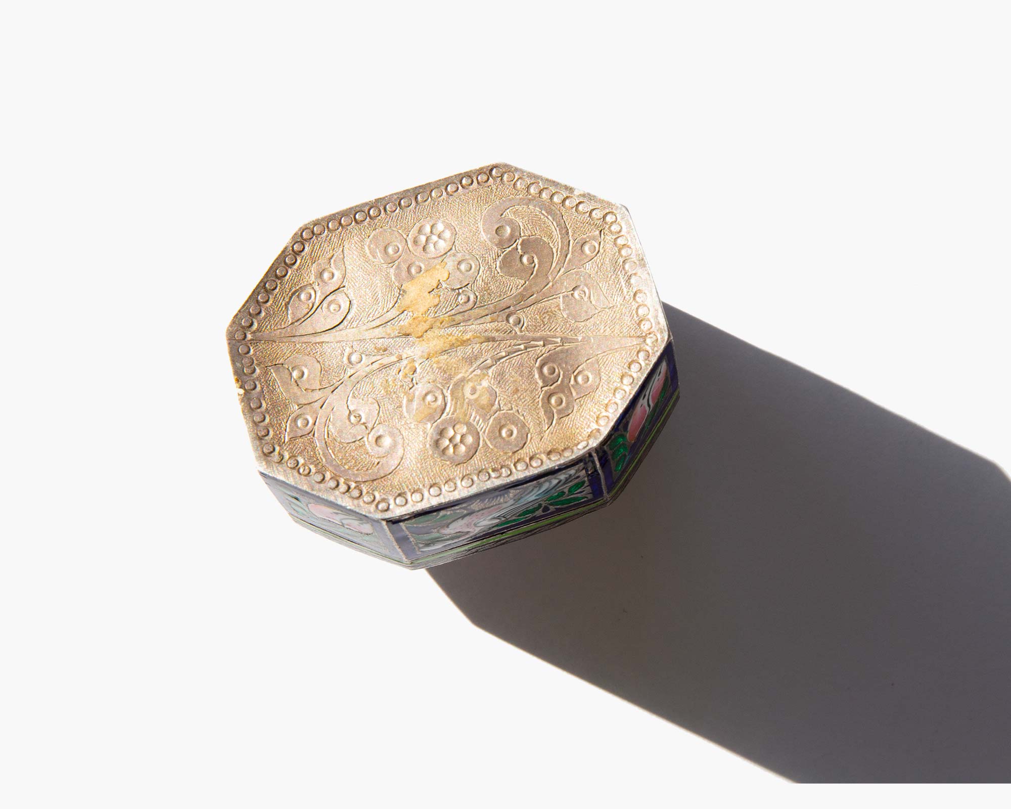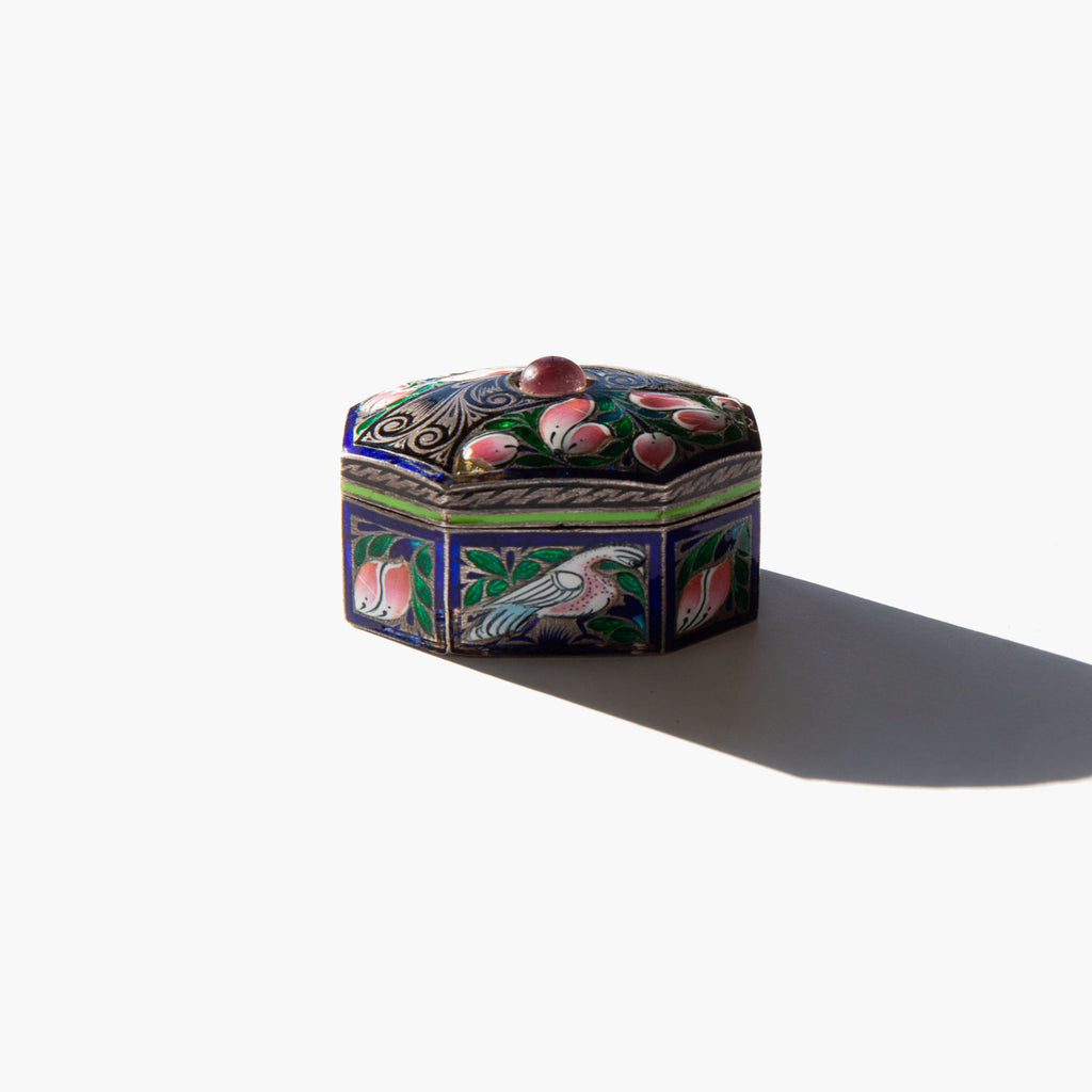 Small, antique solid sterling silver Indian cloisonné box embellished with colorful enamel.