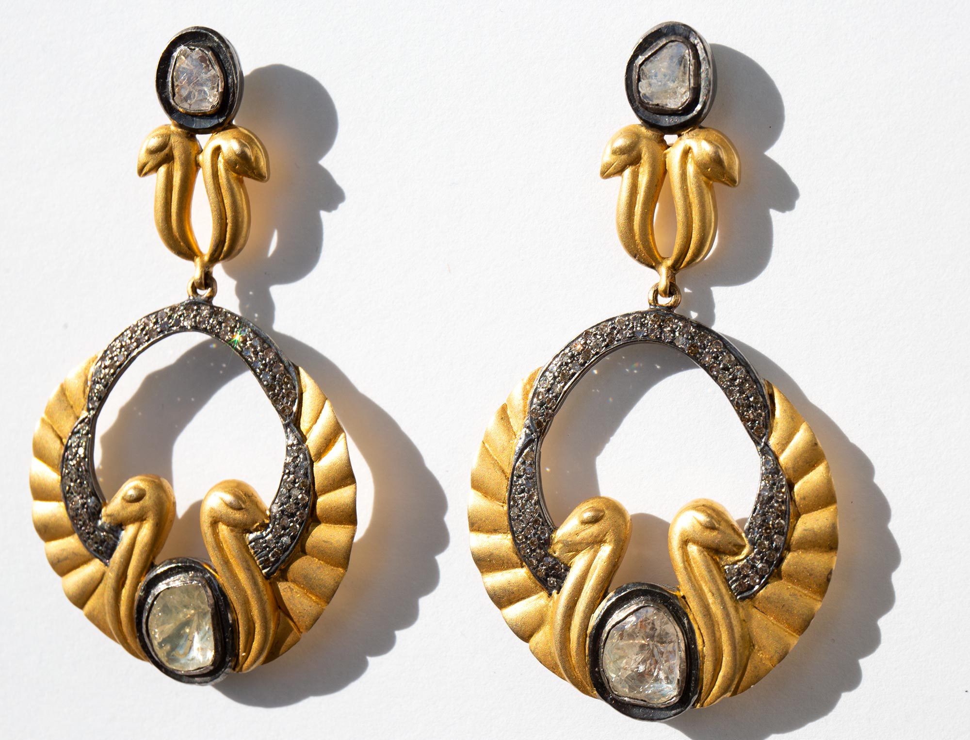 Stunning double snake statement earrings of 14k gold and oxidized sterling silver with a total of 2.4 carats of diamonds.