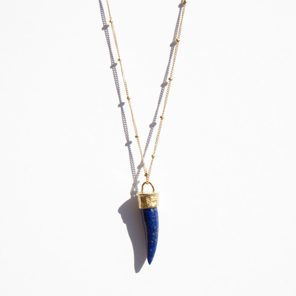 A custom cut natural lapis horn, set in a hand built 14K gold bale on a delicate 14K gold ball and link chain. Lapis has long been worn as protection against spirits of the darkness and all manner of evil but is also used to release stress and encourage peace and harmony. This item is made to order and ships in appx 2 weeks.