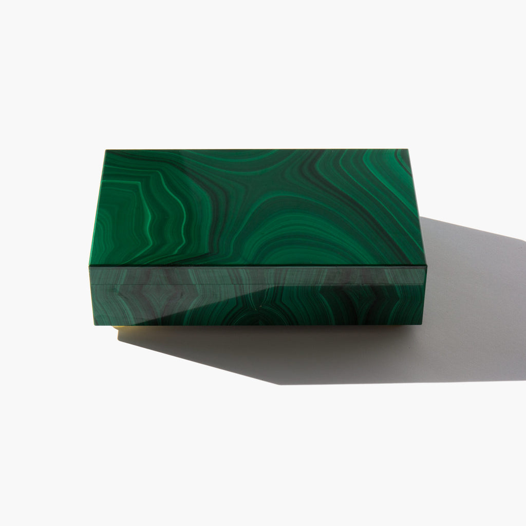 Exquisite malachite with onyx inlay mid-century Italian stone box for jewelry and all manner of secrets, trinkets, and treasures. Hinged lid made from gold tone solid 800 sterling silver with the maker's mark. From the Greek word malakos, meaning soft, malachite is said to be a stone that opens the heart, clears negative energy, and protects one from the evil eye and other detrimental and draining forces.
