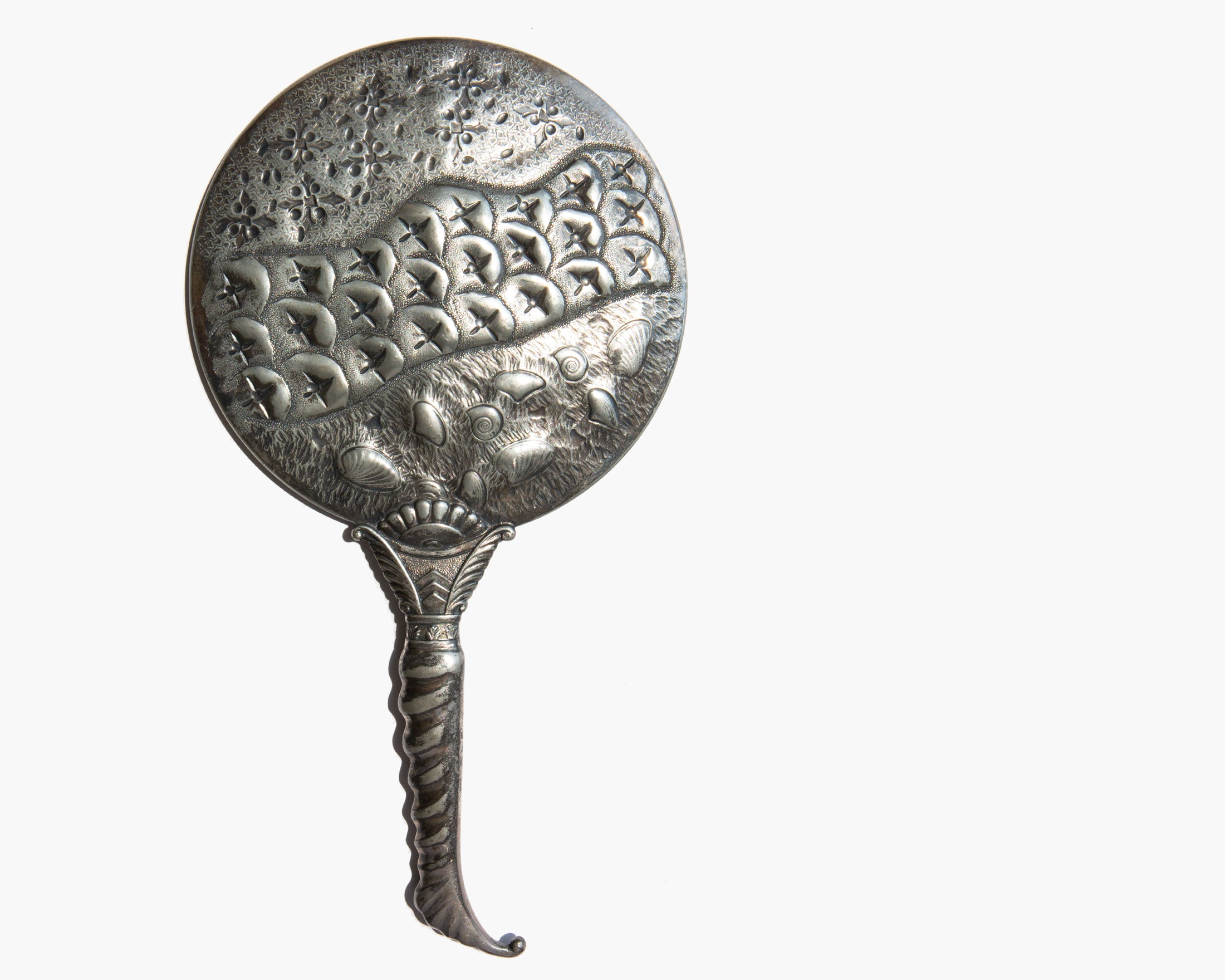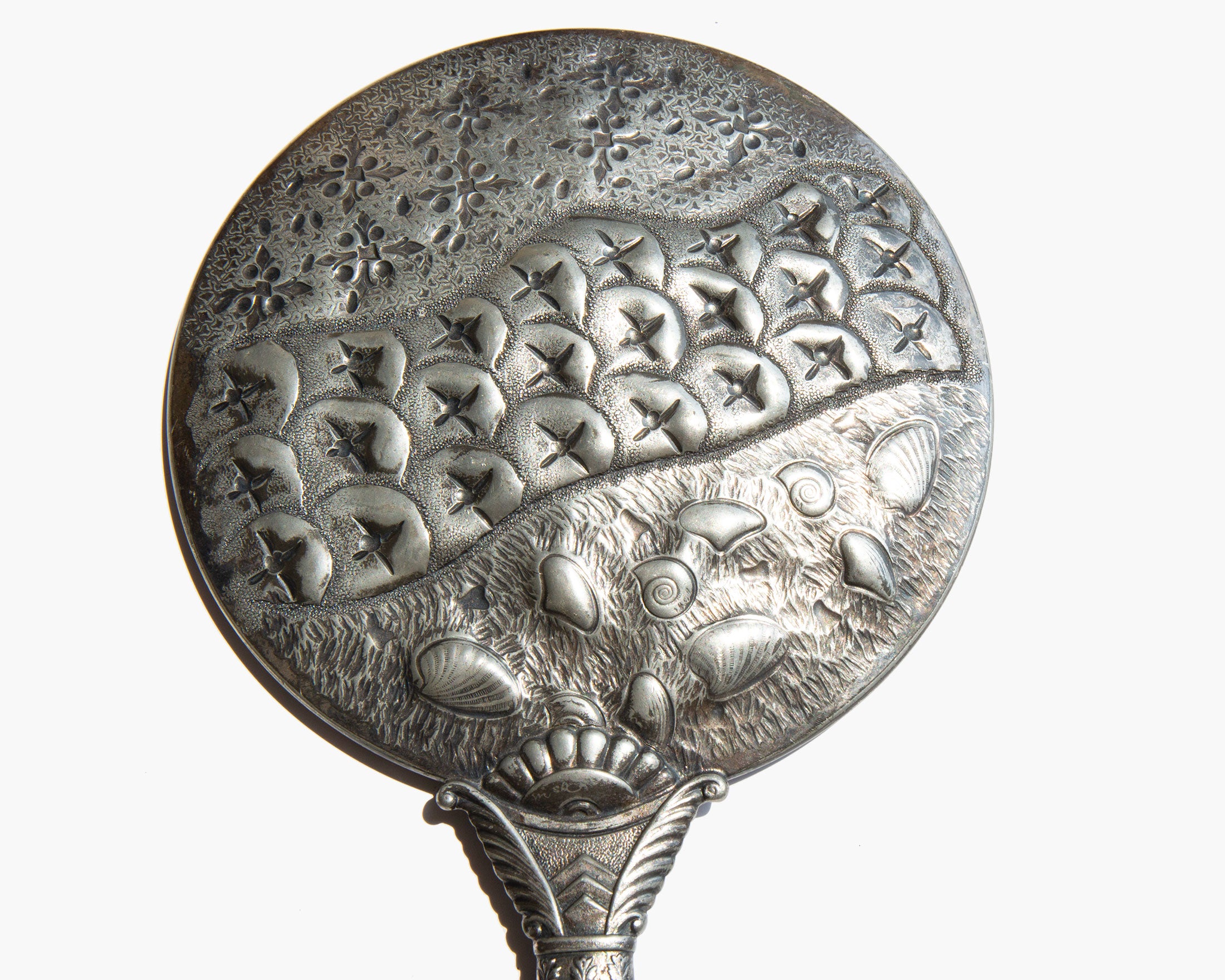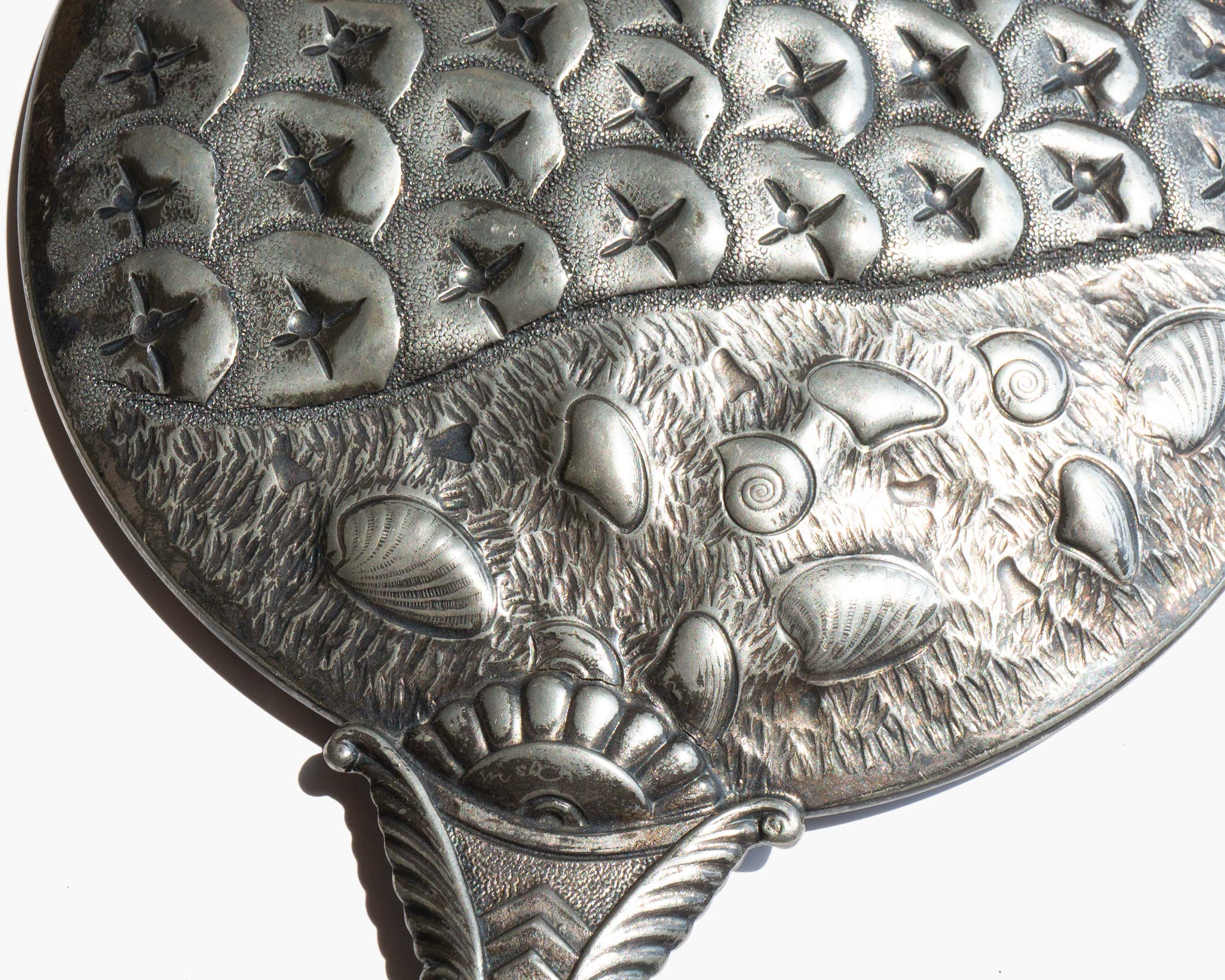 Mid century artisan made silver plated hand mirror with an abstract seashell design.