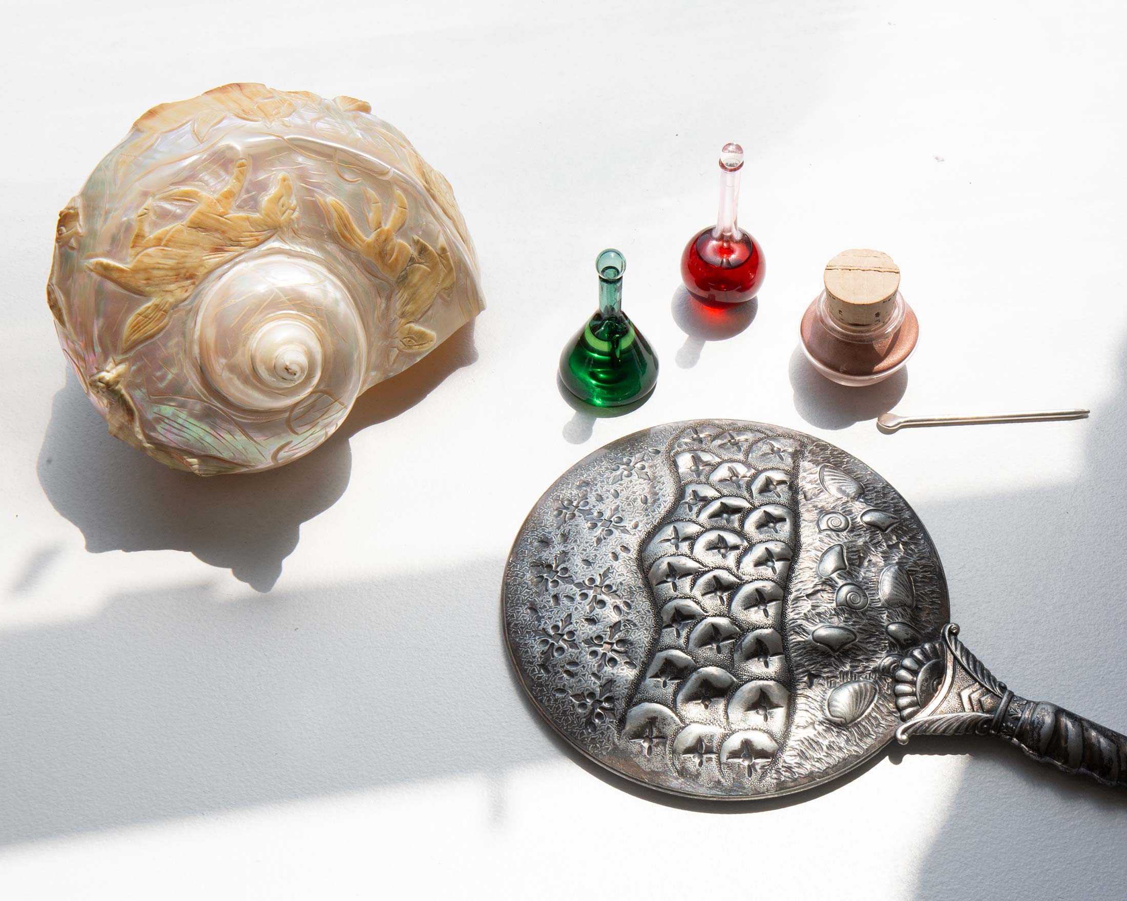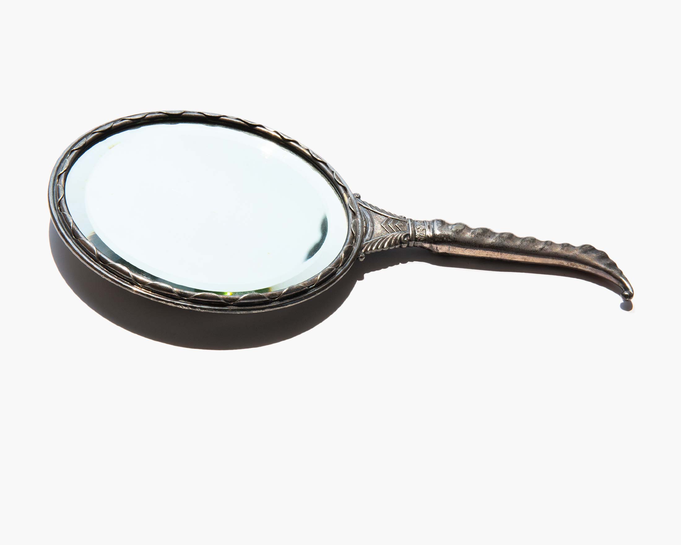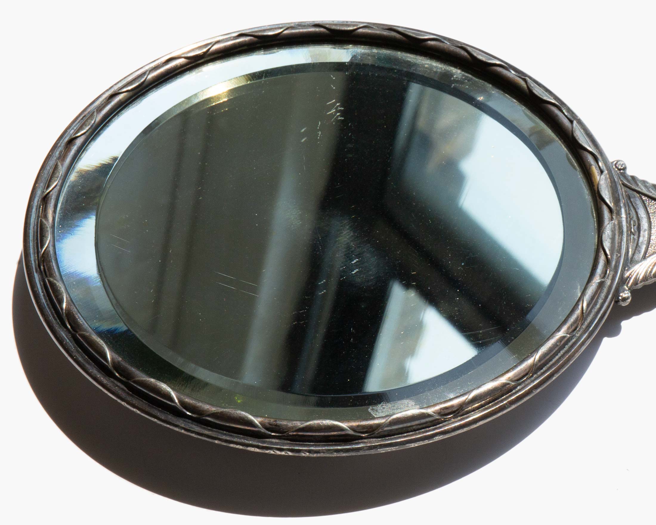 Mid century artisan made silver plated hand mirror with an abstract seashell design.