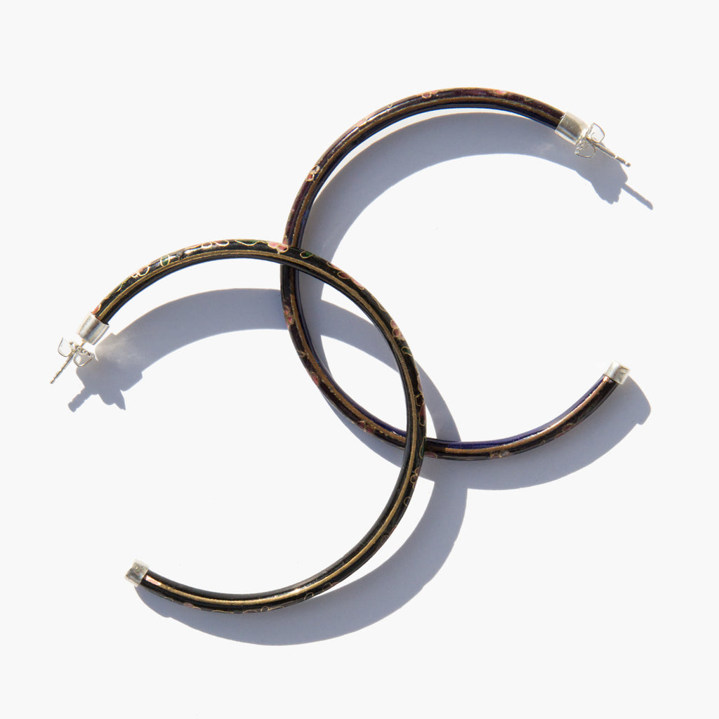 Falize Hoop earrings are handmade using re-purposed cloisonné bangles, and finished with sterling silver tips, posts, and backs. Midnight is a mixed set with one deep black and one deep plum hoop.