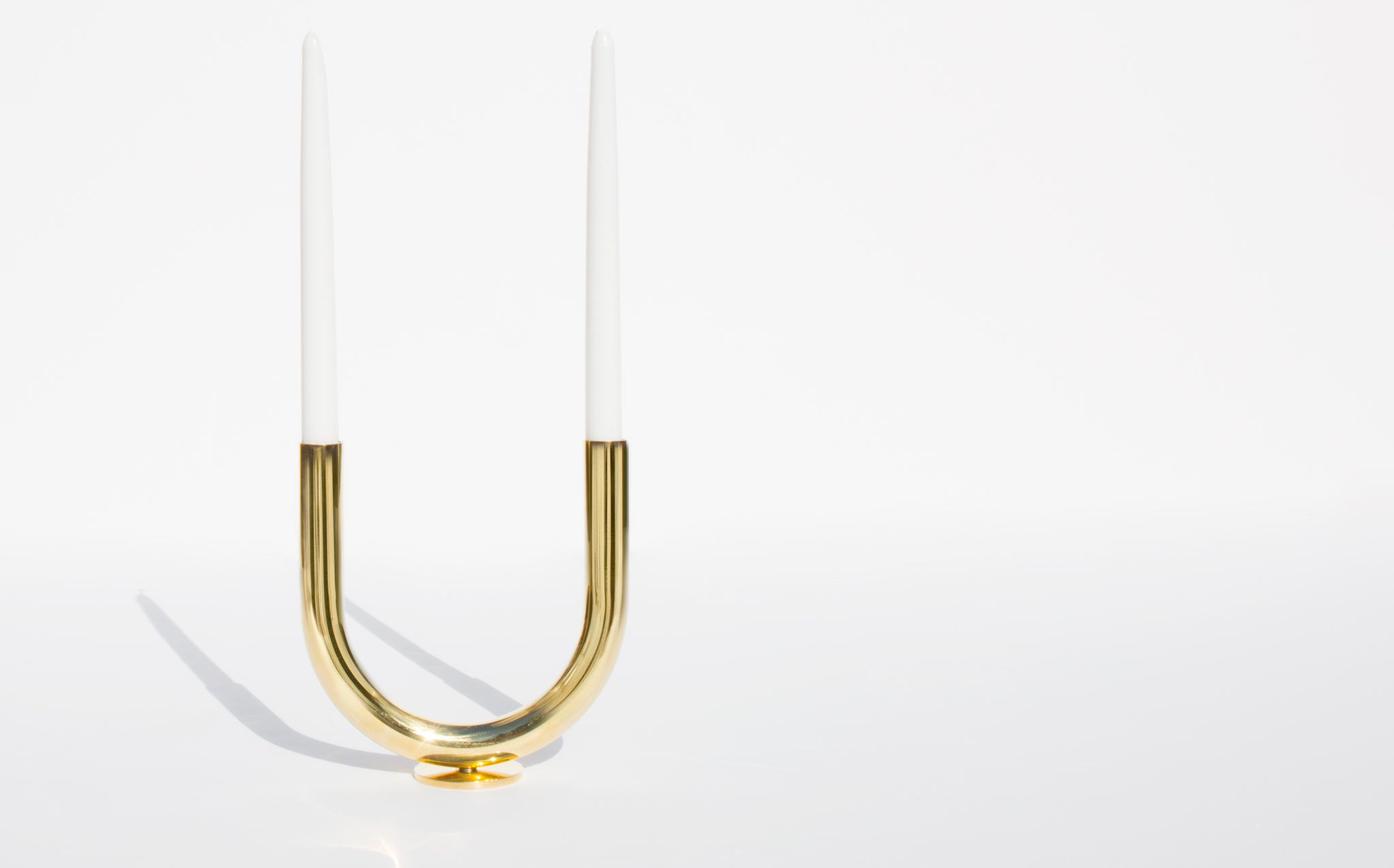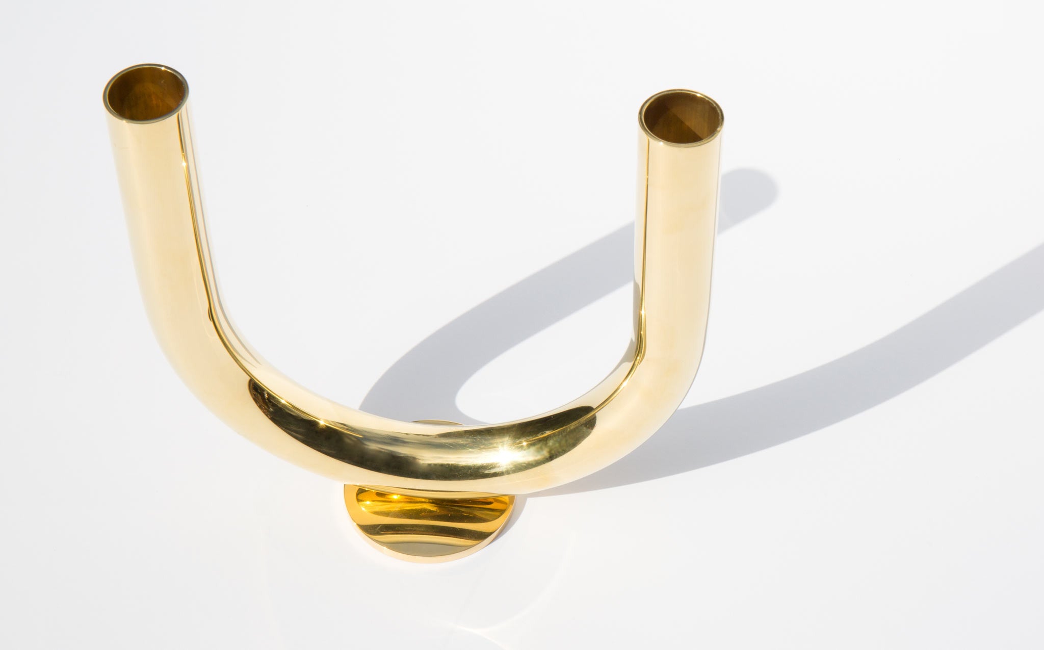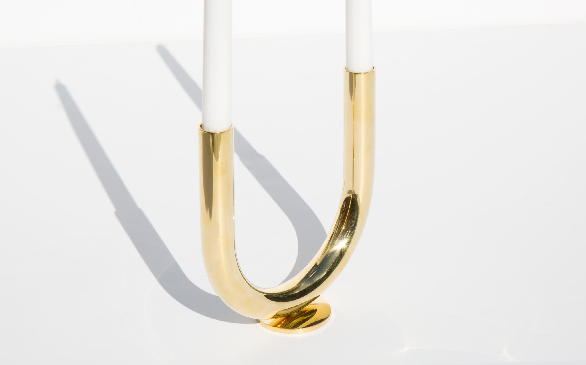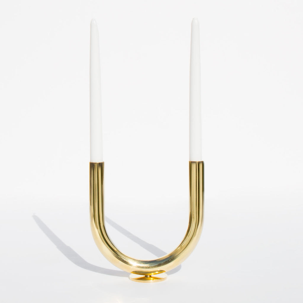 A simple candleholder, crafted in London and formed from a single length of U shaped brass tubing. Hand polished to a mirror finish, it is not lacquered or treated with chemicals in any way. This is to encourage attractive natural ageing characteristics that can be nurtured through use, or brought back to a shine with appropriate cloths and polishes – the choice is yours.