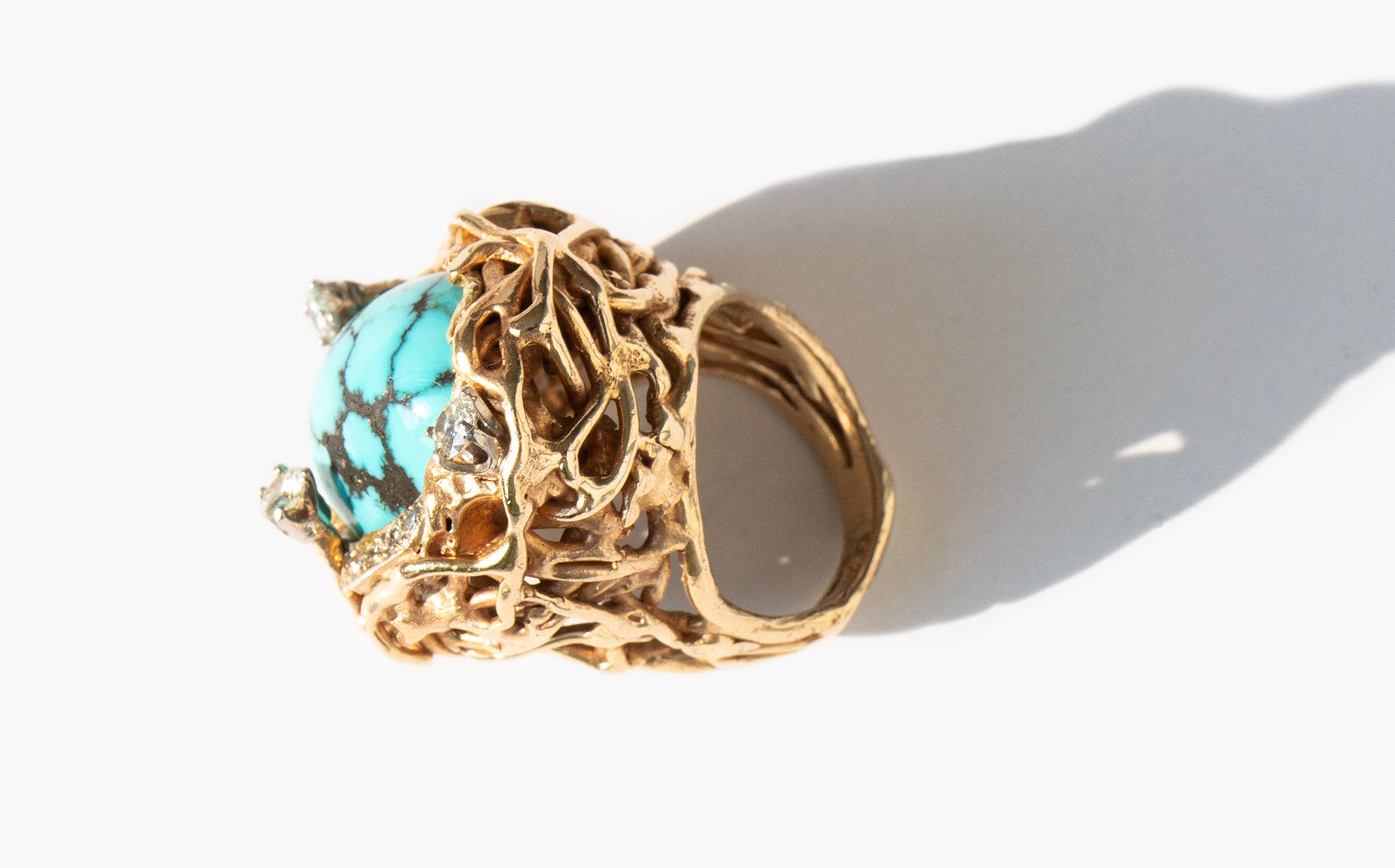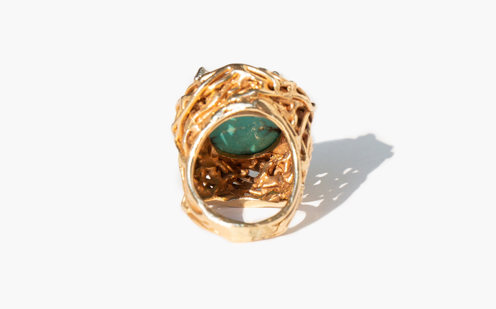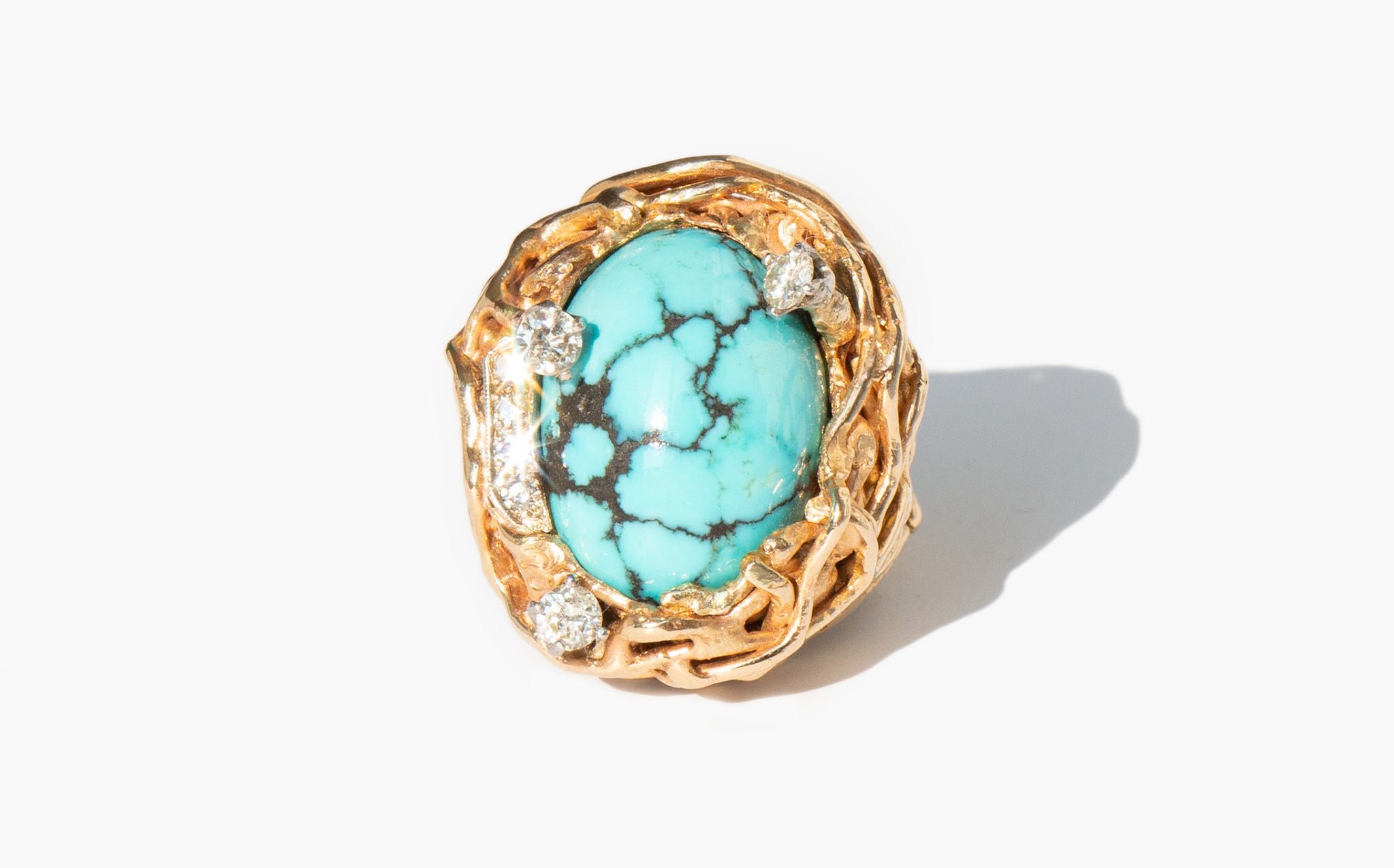Opulent and intricately designed 14k gold cocktail ring with a turquoise center cabochon accented with diamonds.