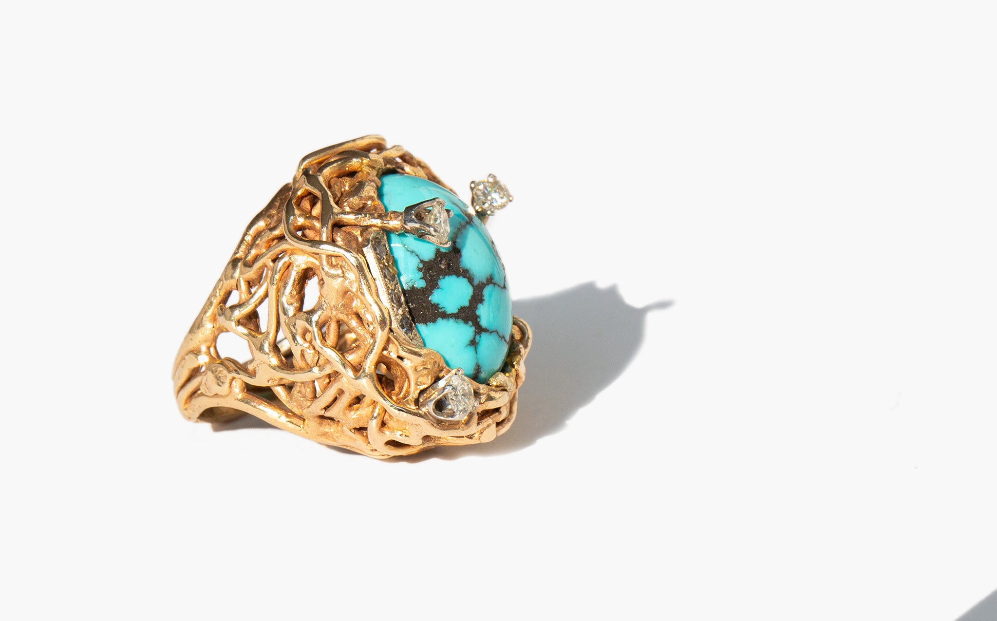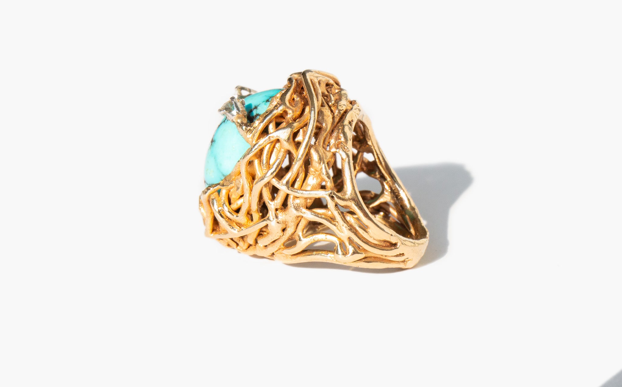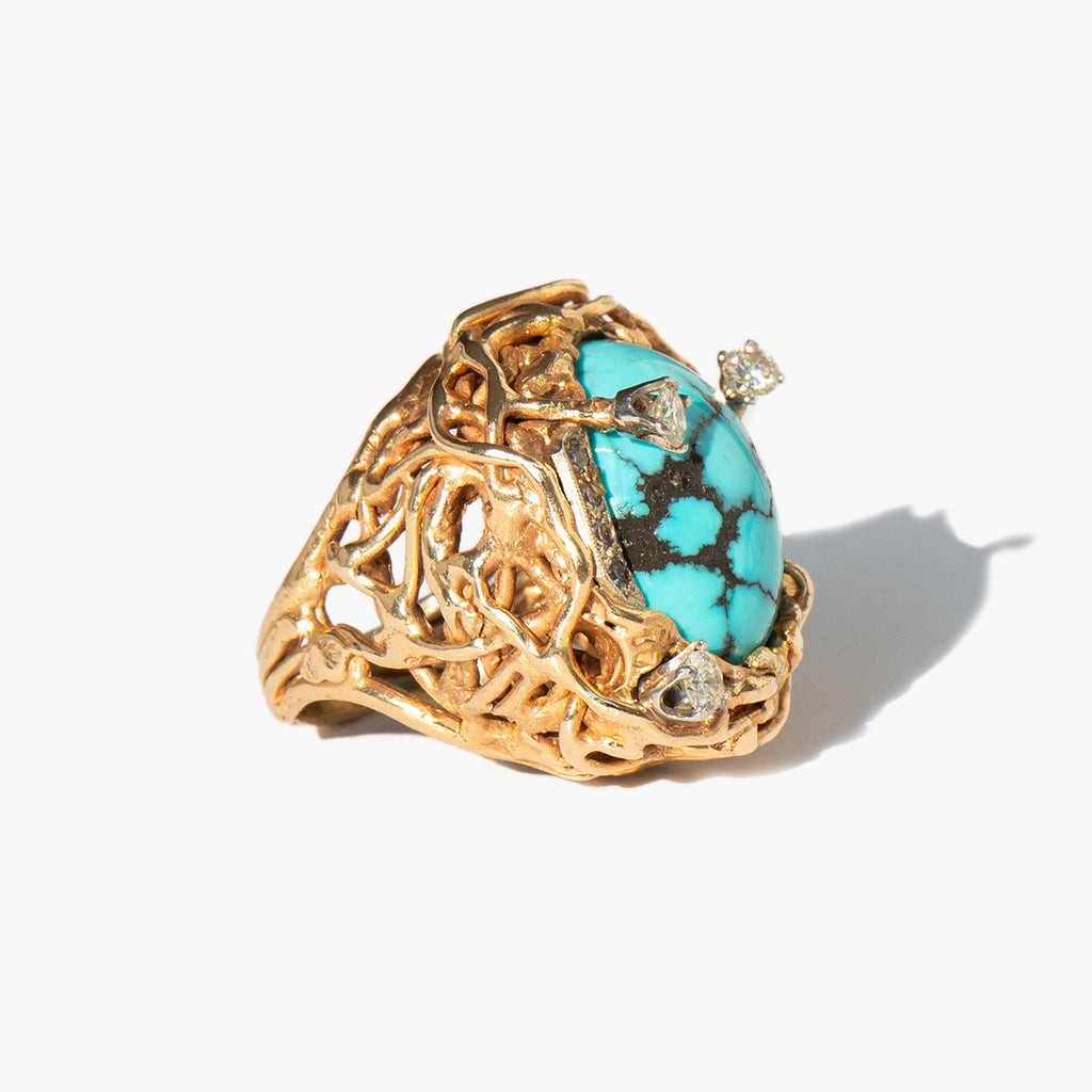 Opulent and intricately designed 14k gold cocktail ring with a turquoise center cabochon accented with diamonds.