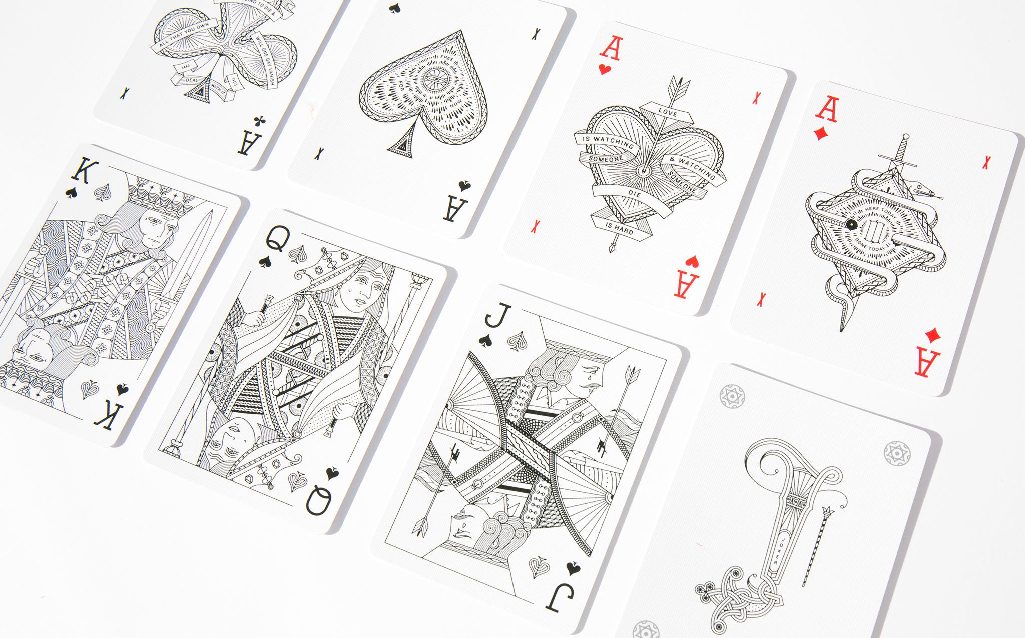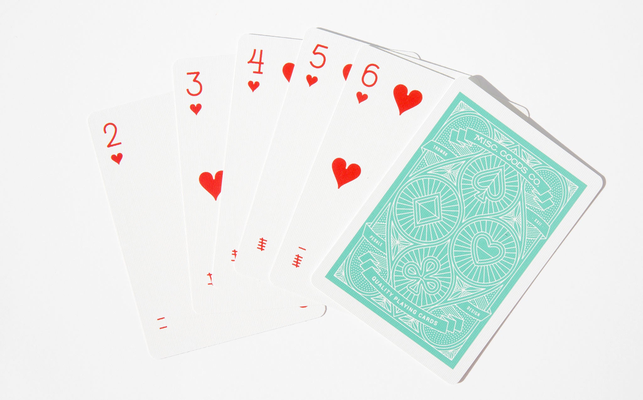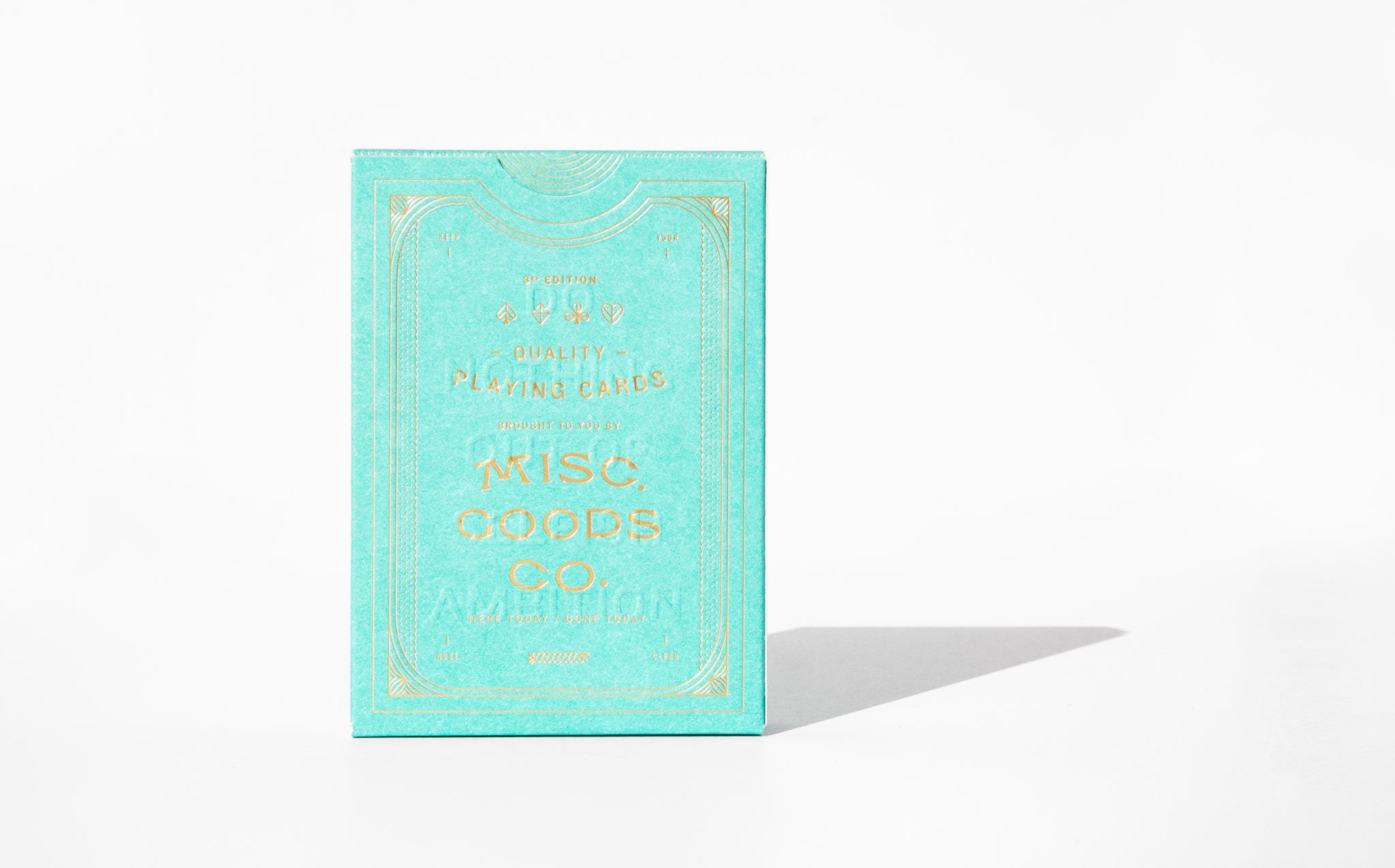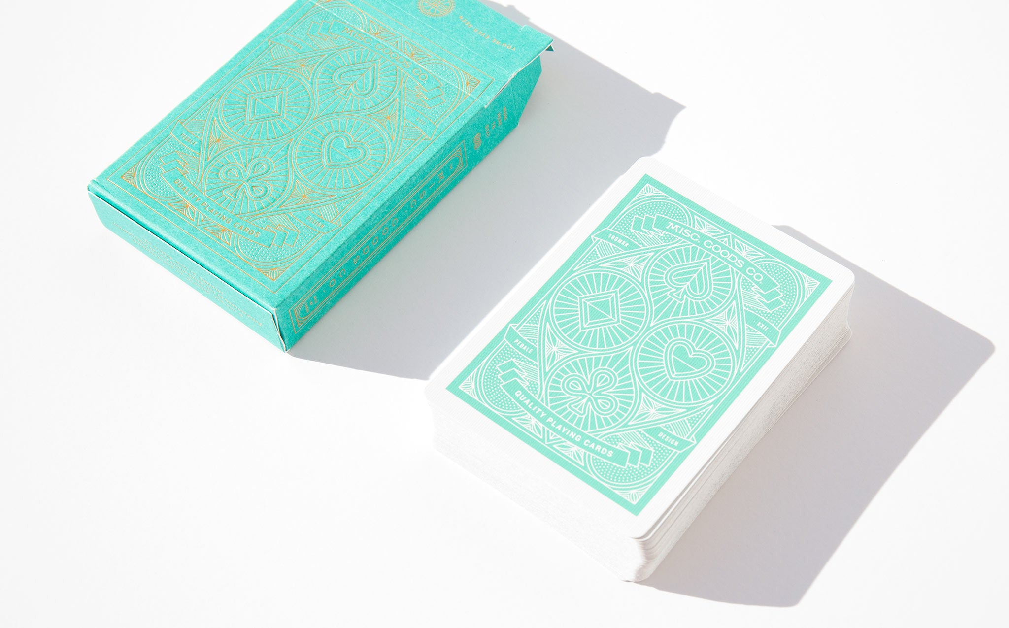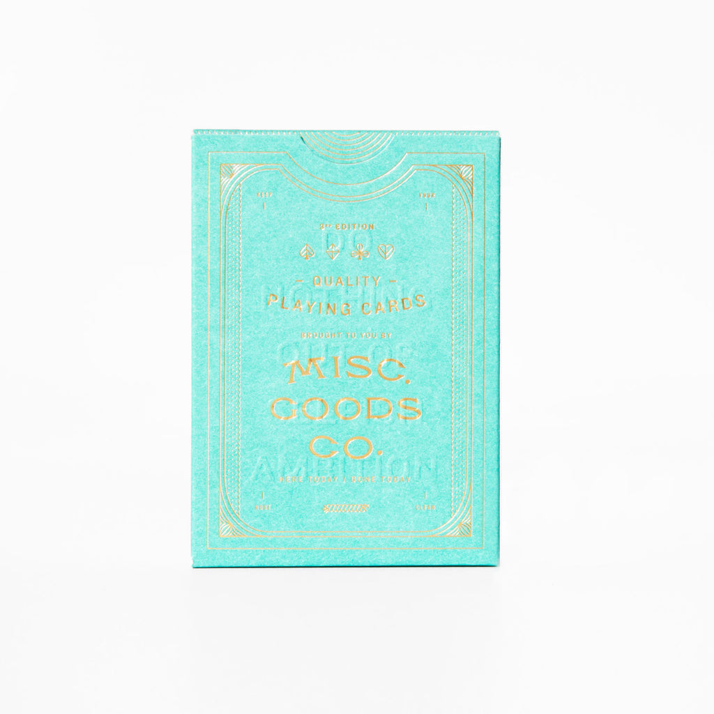 The MGCO Deck is a completely redesigned deck of playing cards. The artwork has been completely redone; the tuck case, every symbol, aces to spades and even the typography used on the cards. Designed by Tyler Deeb in Louisville, KT and printed by the United States Playing Card Co., of the famed Bicycle brand playing cards. Printed on Bee paper, the highest quality coated playing card stock in an embossed tuck case printed with sea green ink and gold foil.