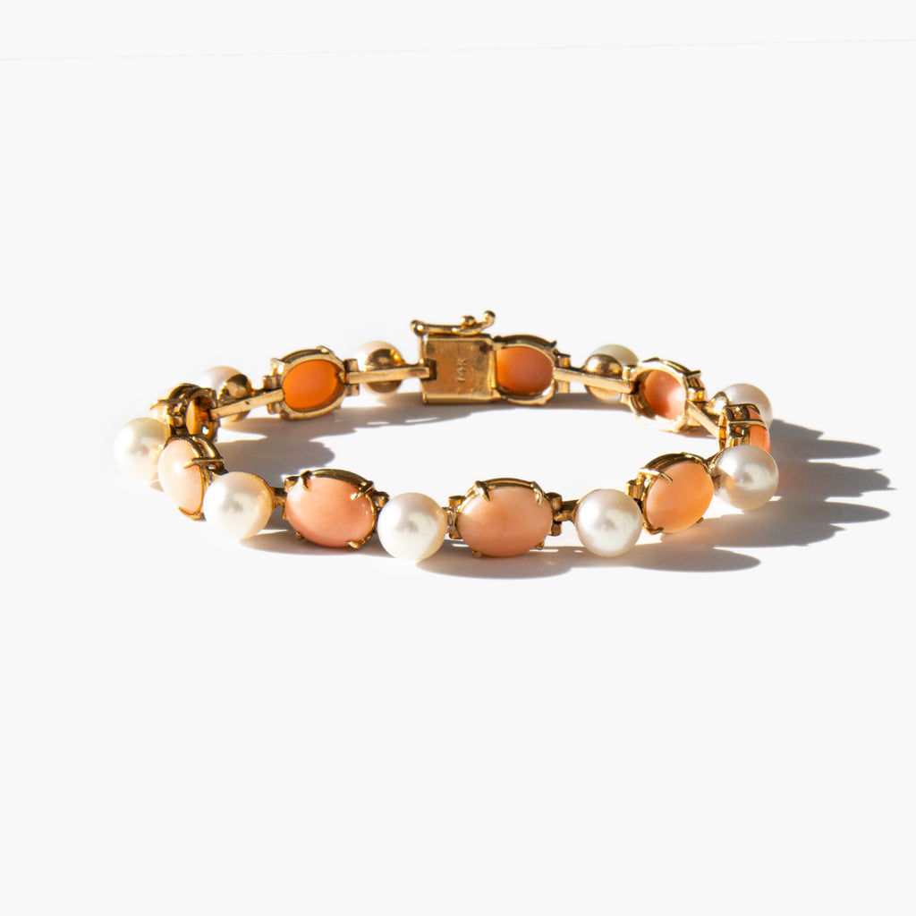 Classic and elegant 1960's coral and Japanese Akoya pearl bracelet set in 14k gold.
