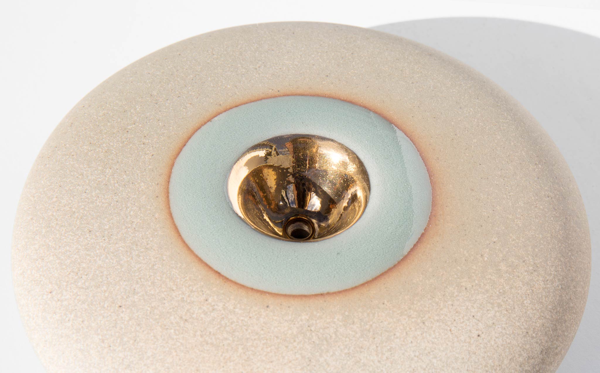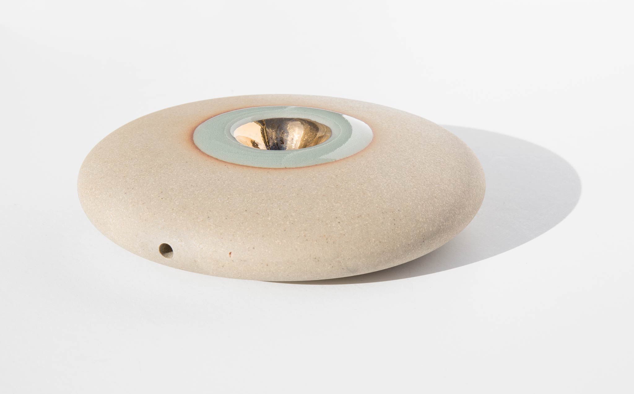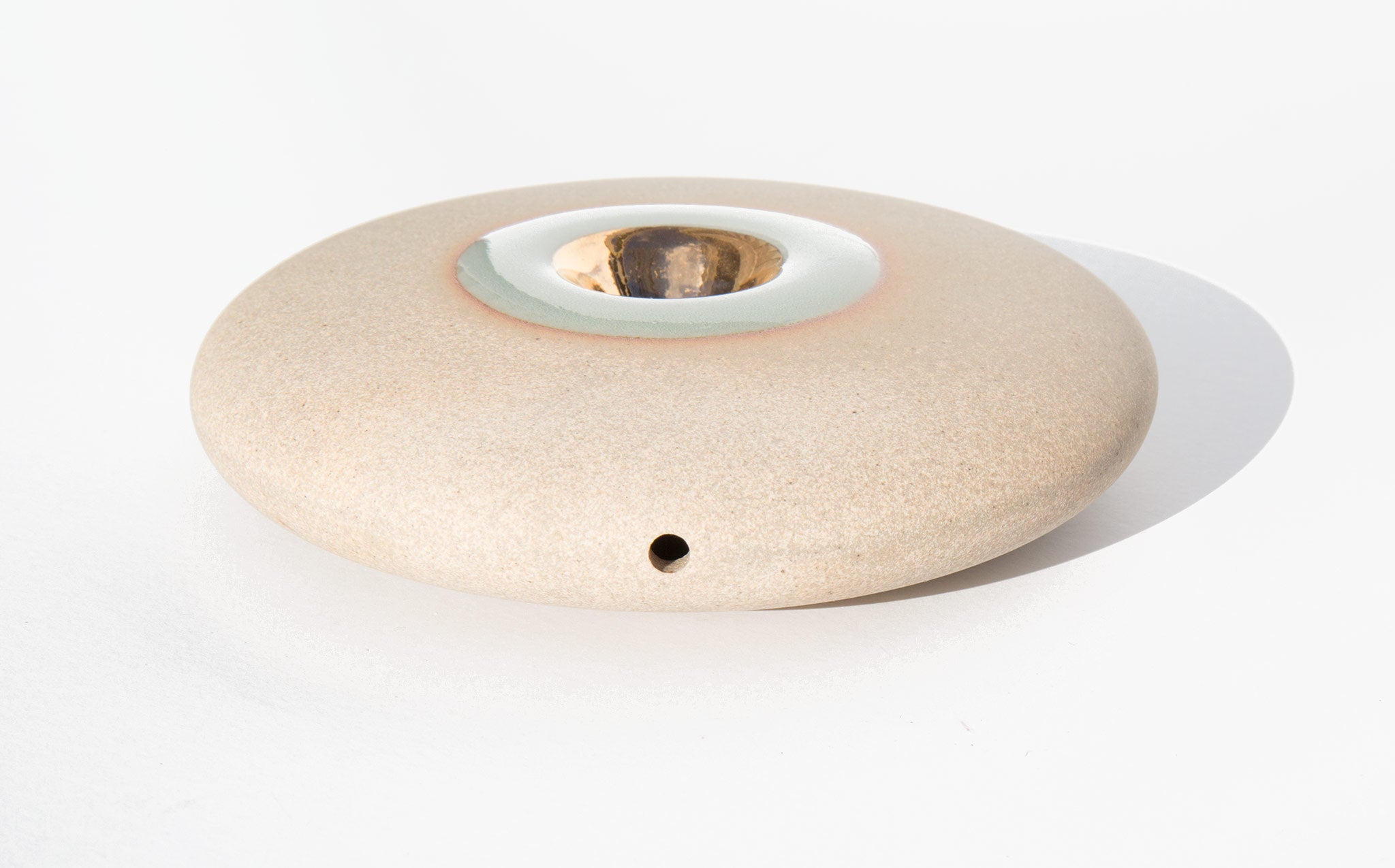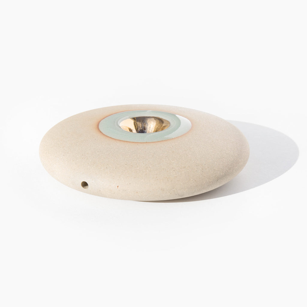 Pronounced nah-vay, spaceship in Spanish, the Miwak Junior Oro Nave is a large disk pipe, handmade of stoneware clay with a celadon glaze and 22K gold bowl.
