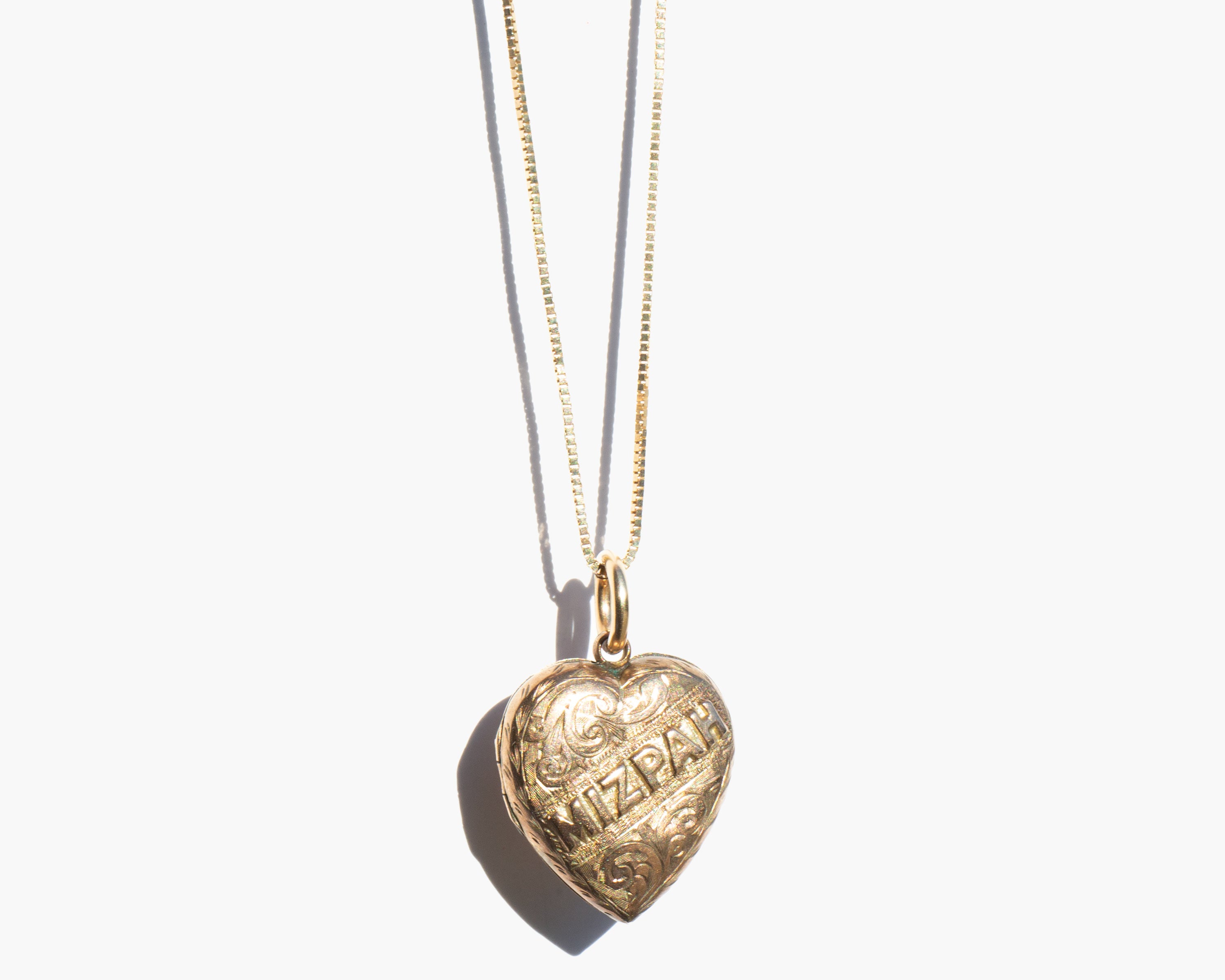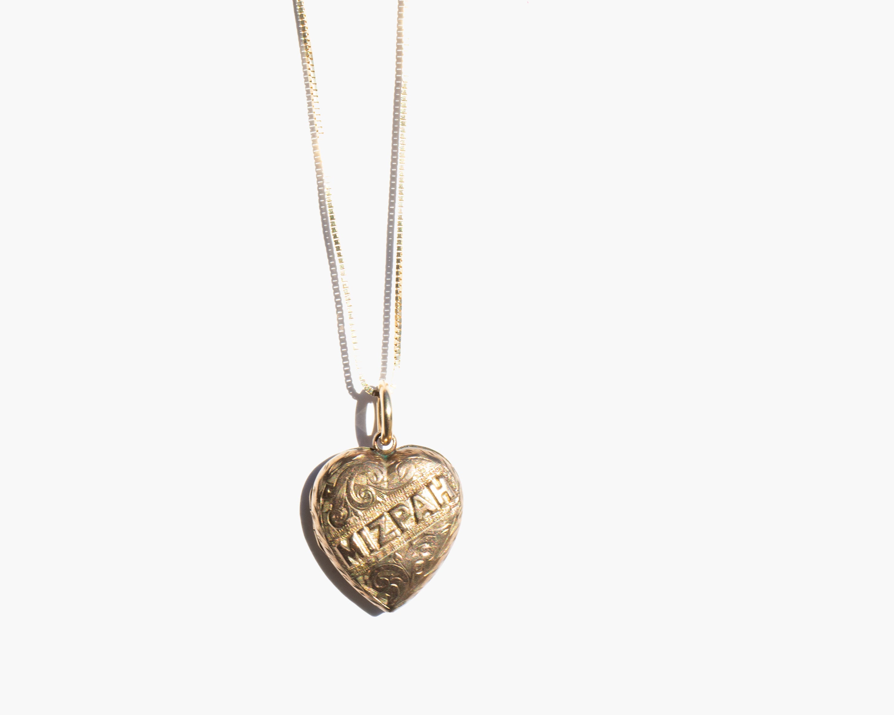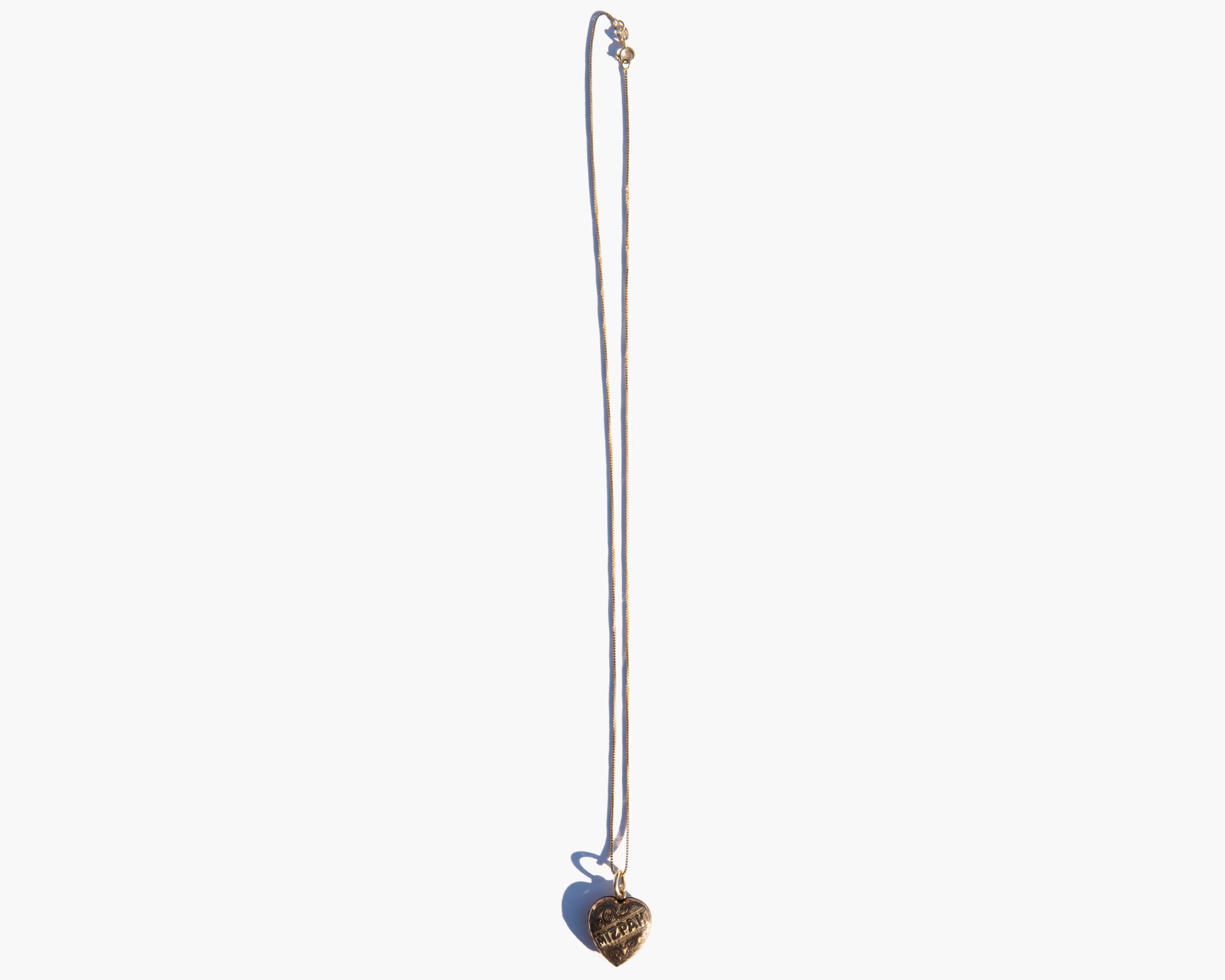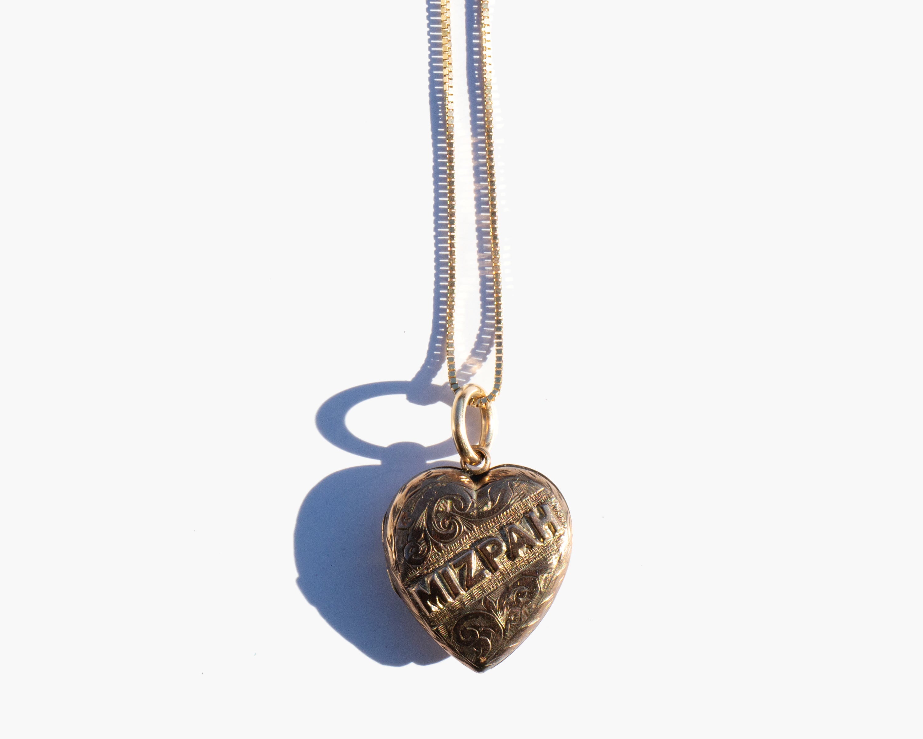 Antique English 9k gold Mizpah heart locket on a 14k gold chain. Engraving the Hebrew word Mizpah on jewelry gained popularity during the Victorian era. The word is directly translated as "watchtower" but was used to convey an emotional bond between two people, either as lovers or friends. This type of sentimental jewelry experienced a revival during the first world war when men leaving for combat gave them to loved ones as amulets of love and protection during the period of separation.