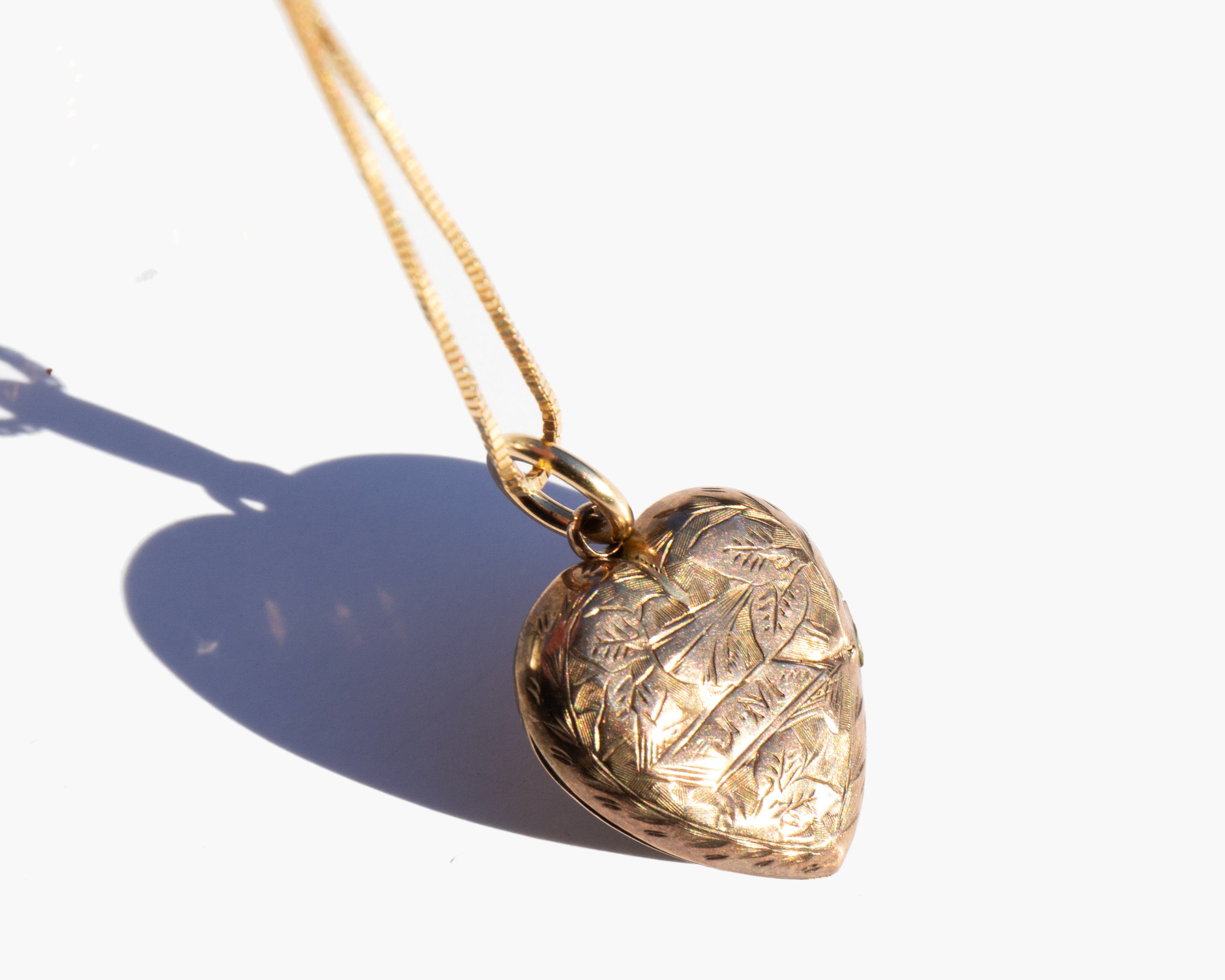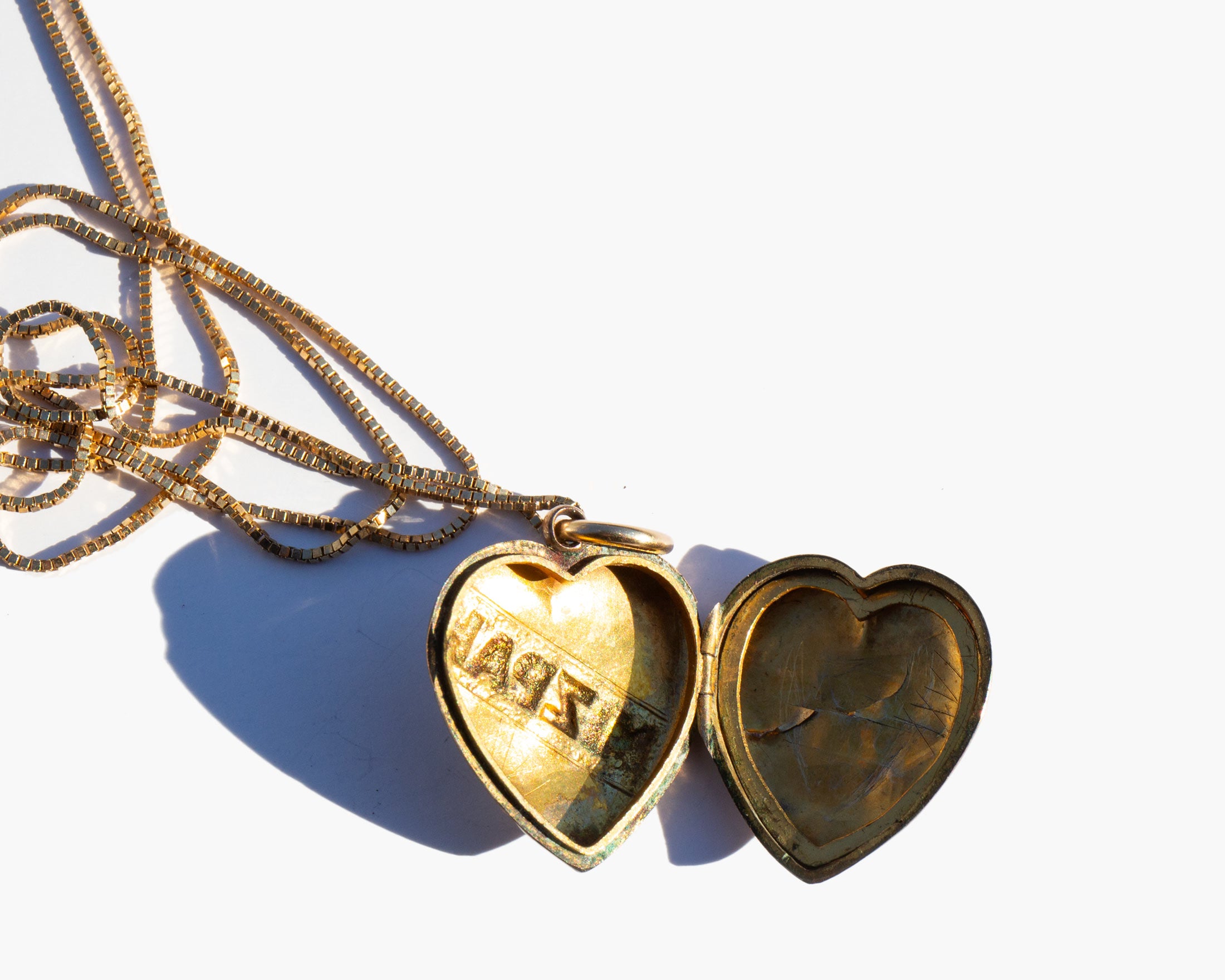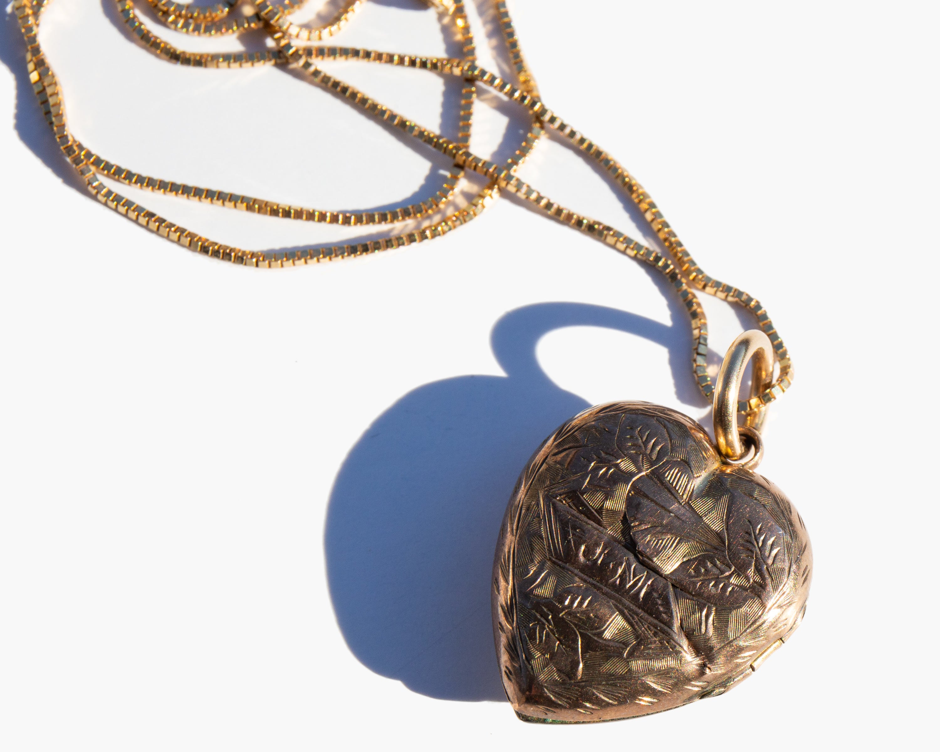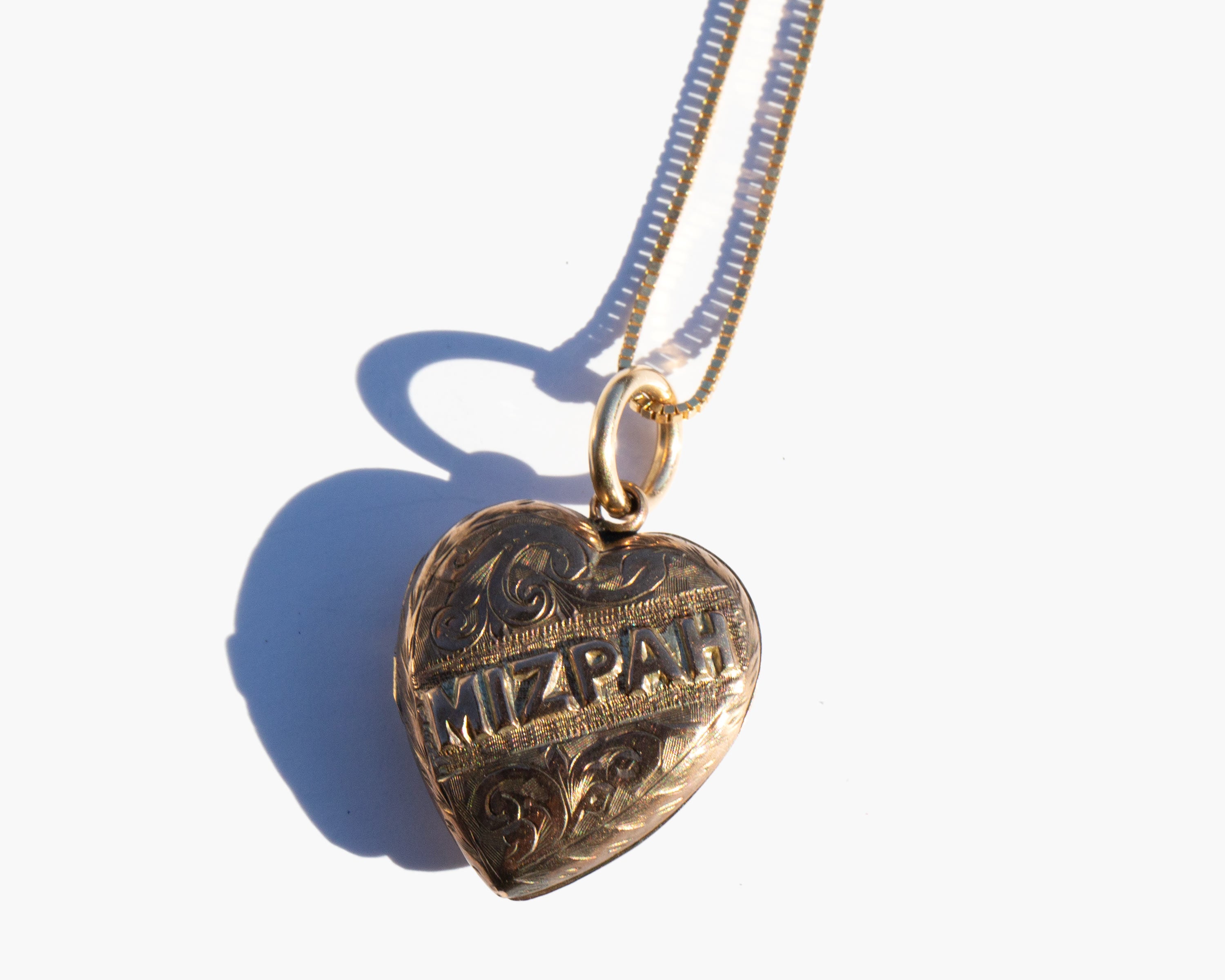 Antique English 9k gold Mizpah heart locket on a 14k gold chain. Engraving the Hebrew word Mizpah on jewelry gained popularity during the Victorian era. The word is directly translated as "watchtower" but was used to convey an emotional bond between two people, either as lovers or friends. This type of sentimental jewelry experienced a revival during the first world war when men leaving for combat gave them to loved ones as amulets of love and protection during the period of separation.