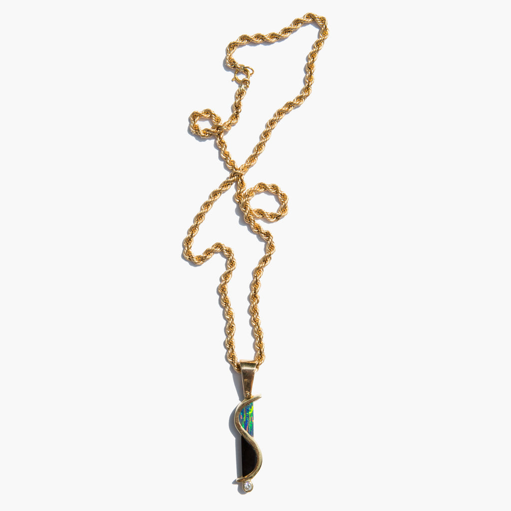 An unexpected 10k gold charm with opal, onyx, and diamond accents strung on a solid 14k gold rope chain.