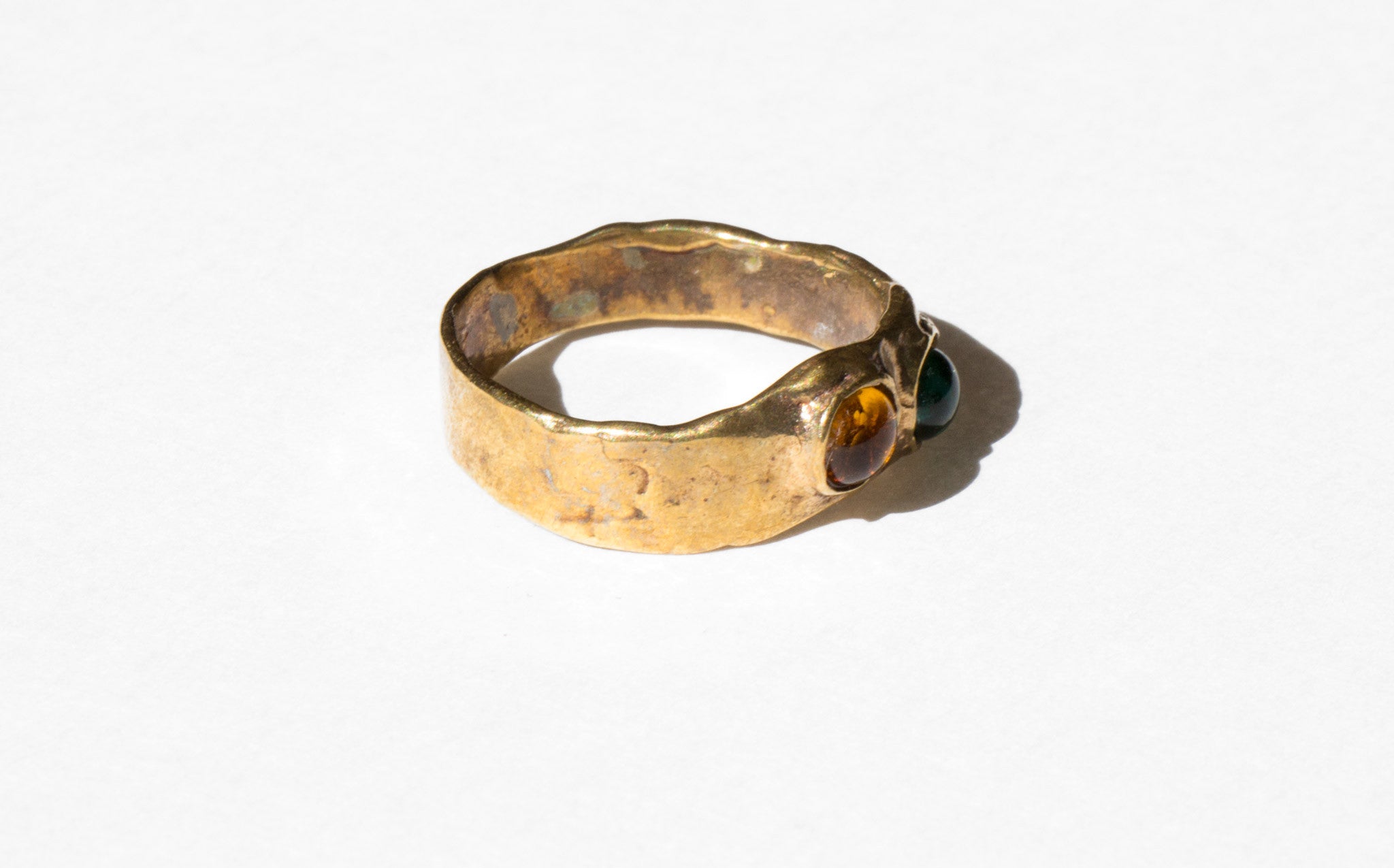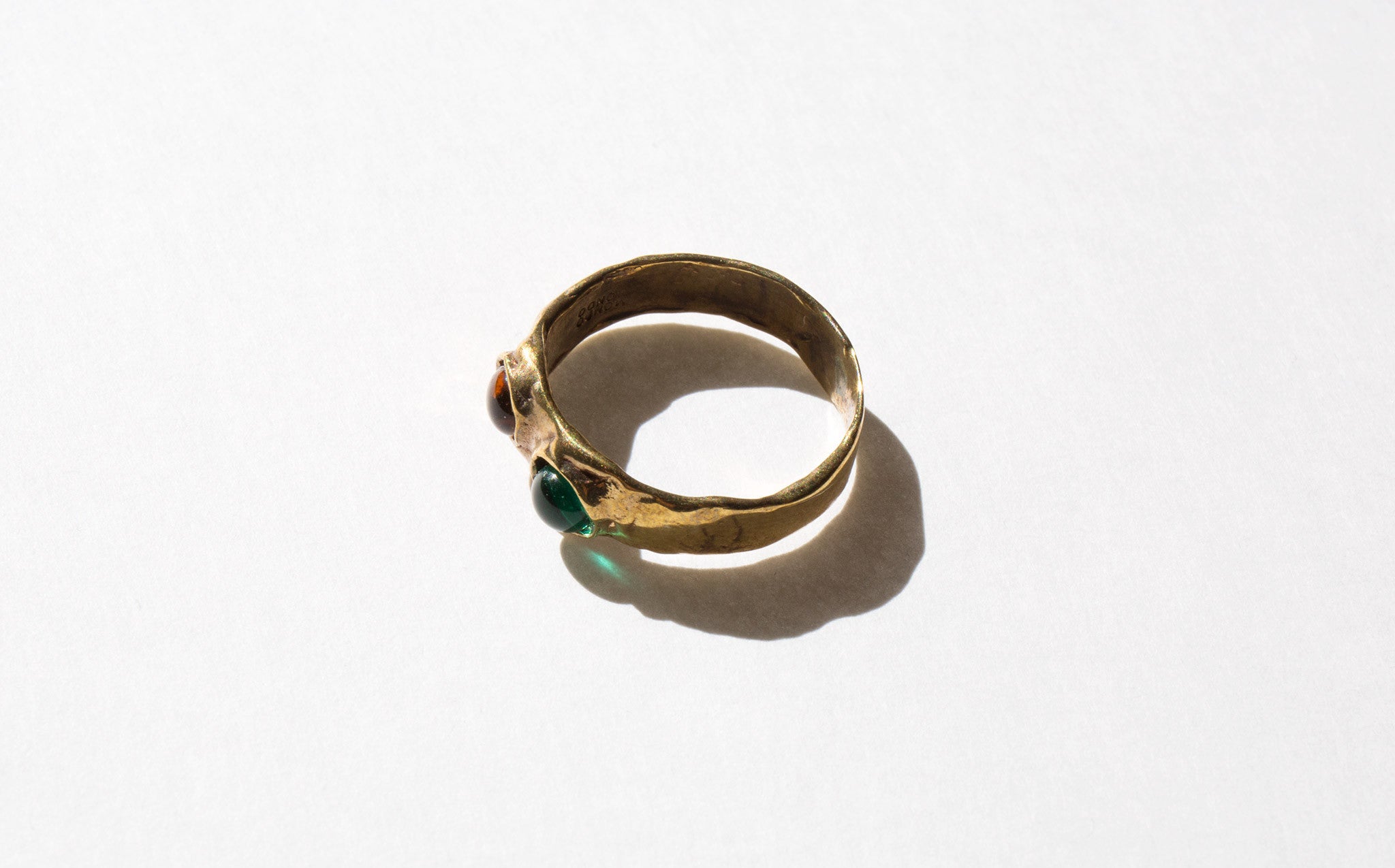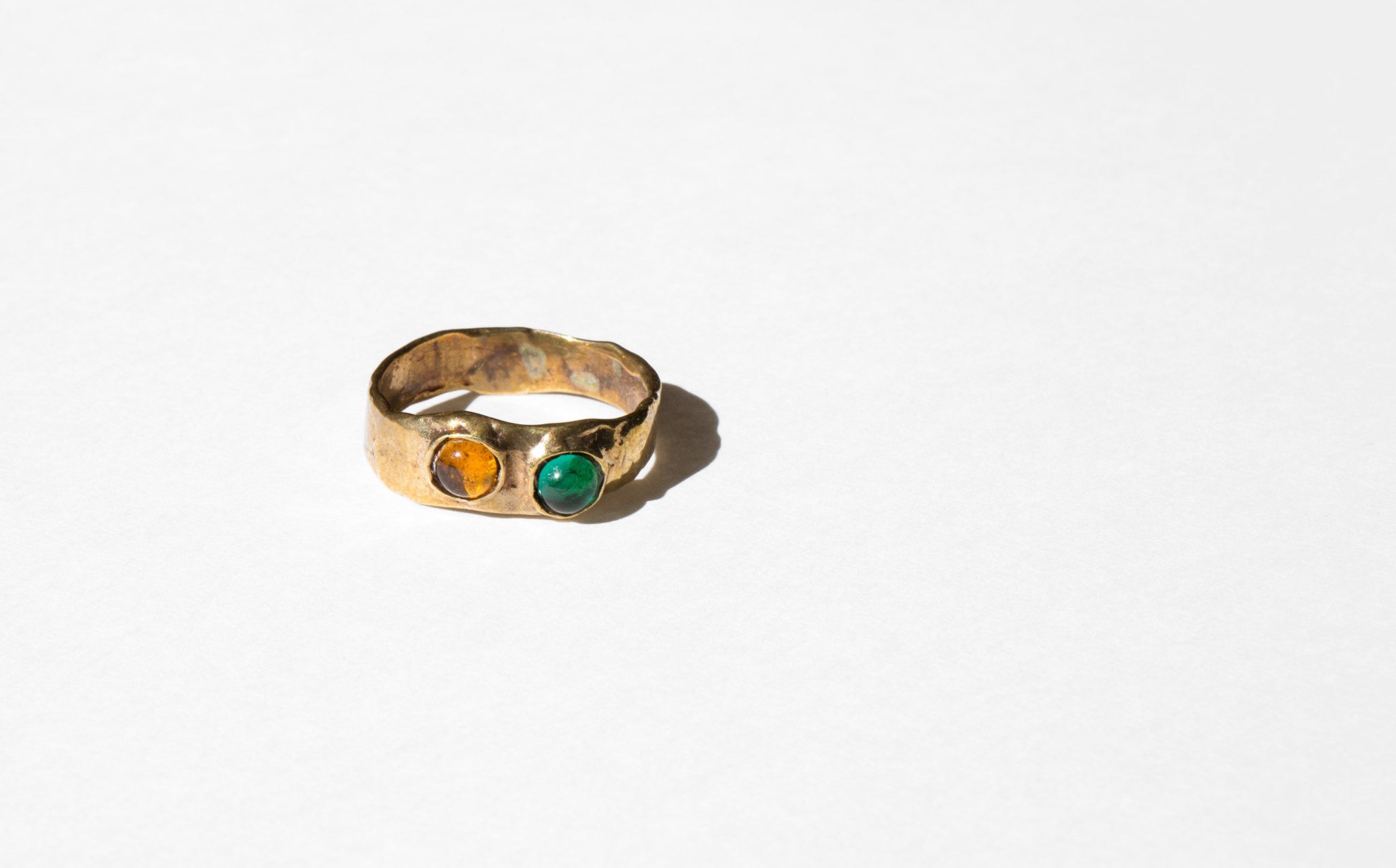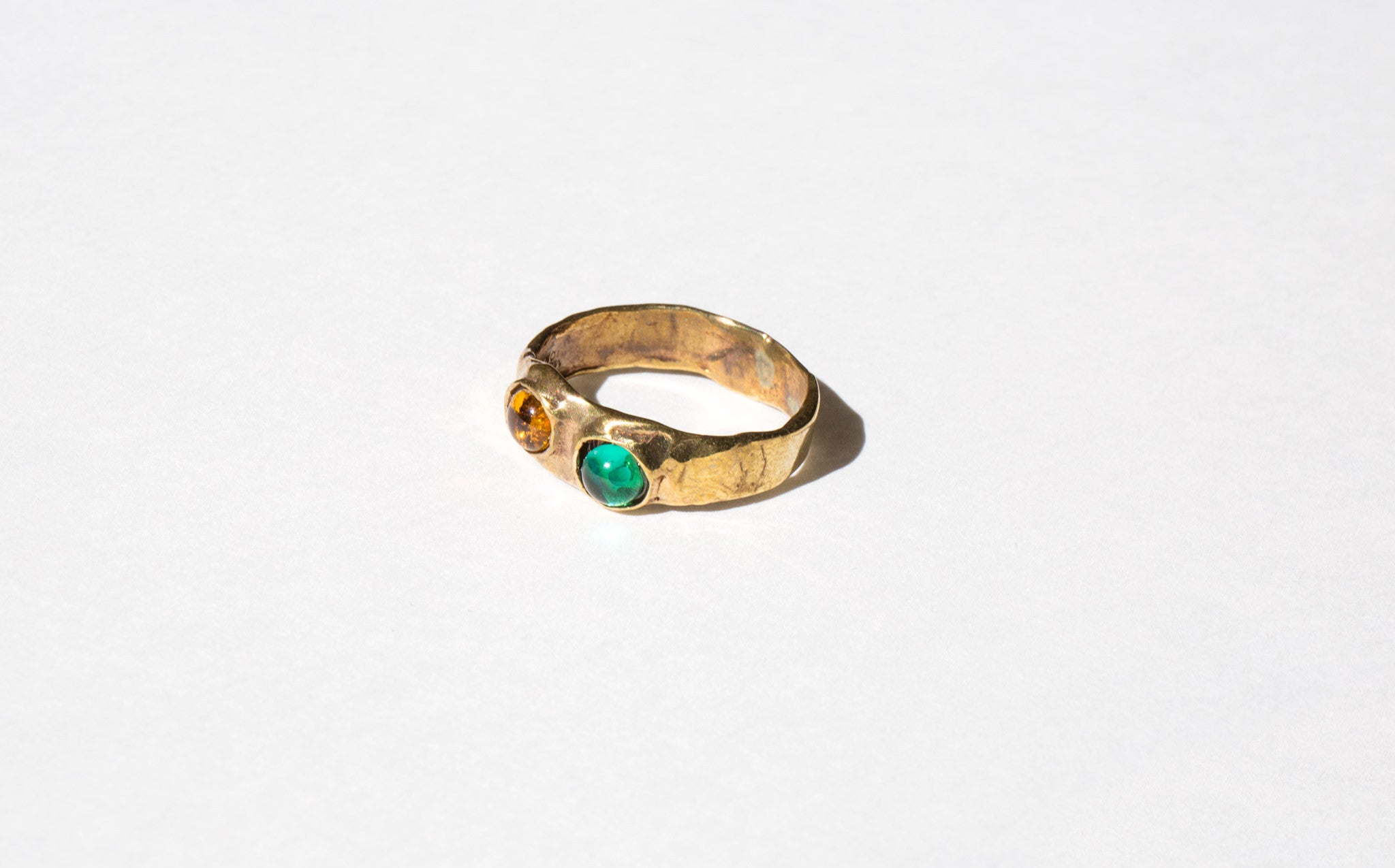 Sculptural brass ring with jewel-toned glass cabochons. Mondo Mondo rings are stackable, becoming a unique statement to each wearer.