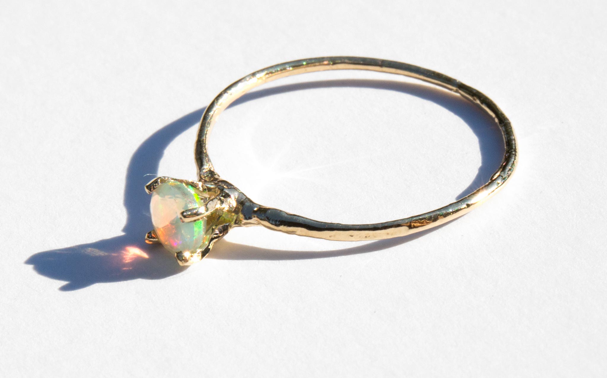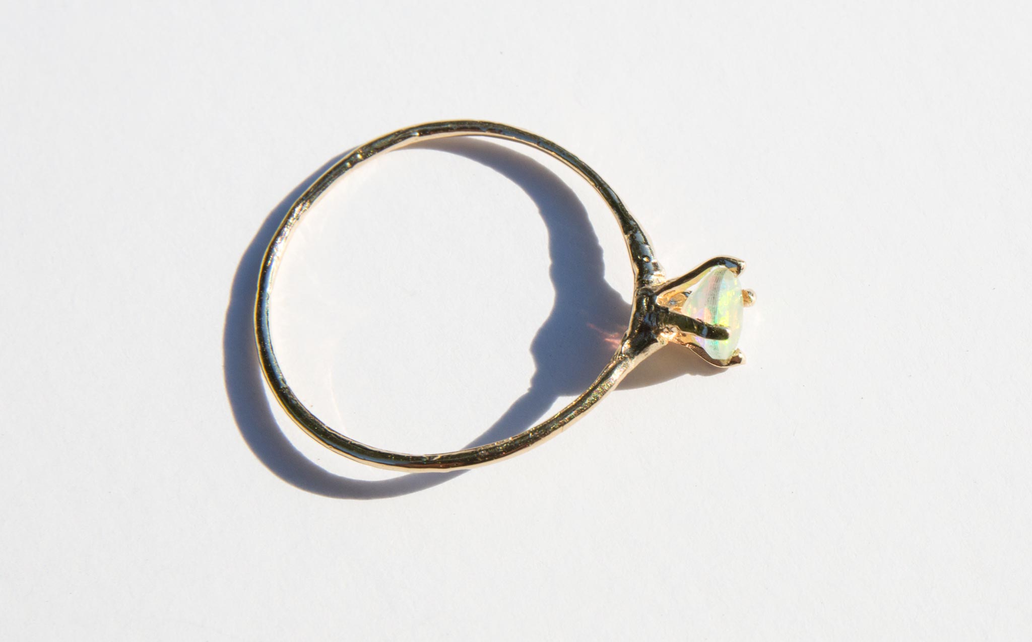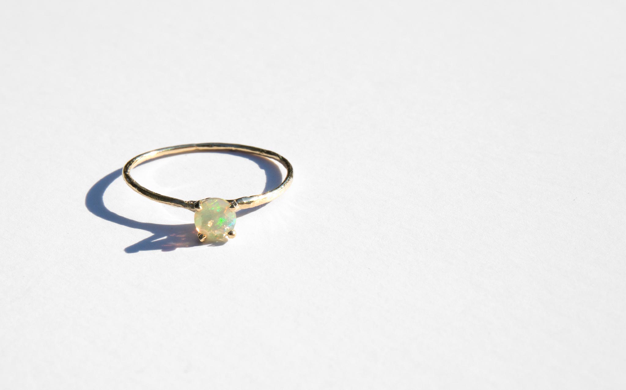 The Mondo Mondo Opal Princess Ring is a delicate 14K gold band set with a small, luminescent opal.