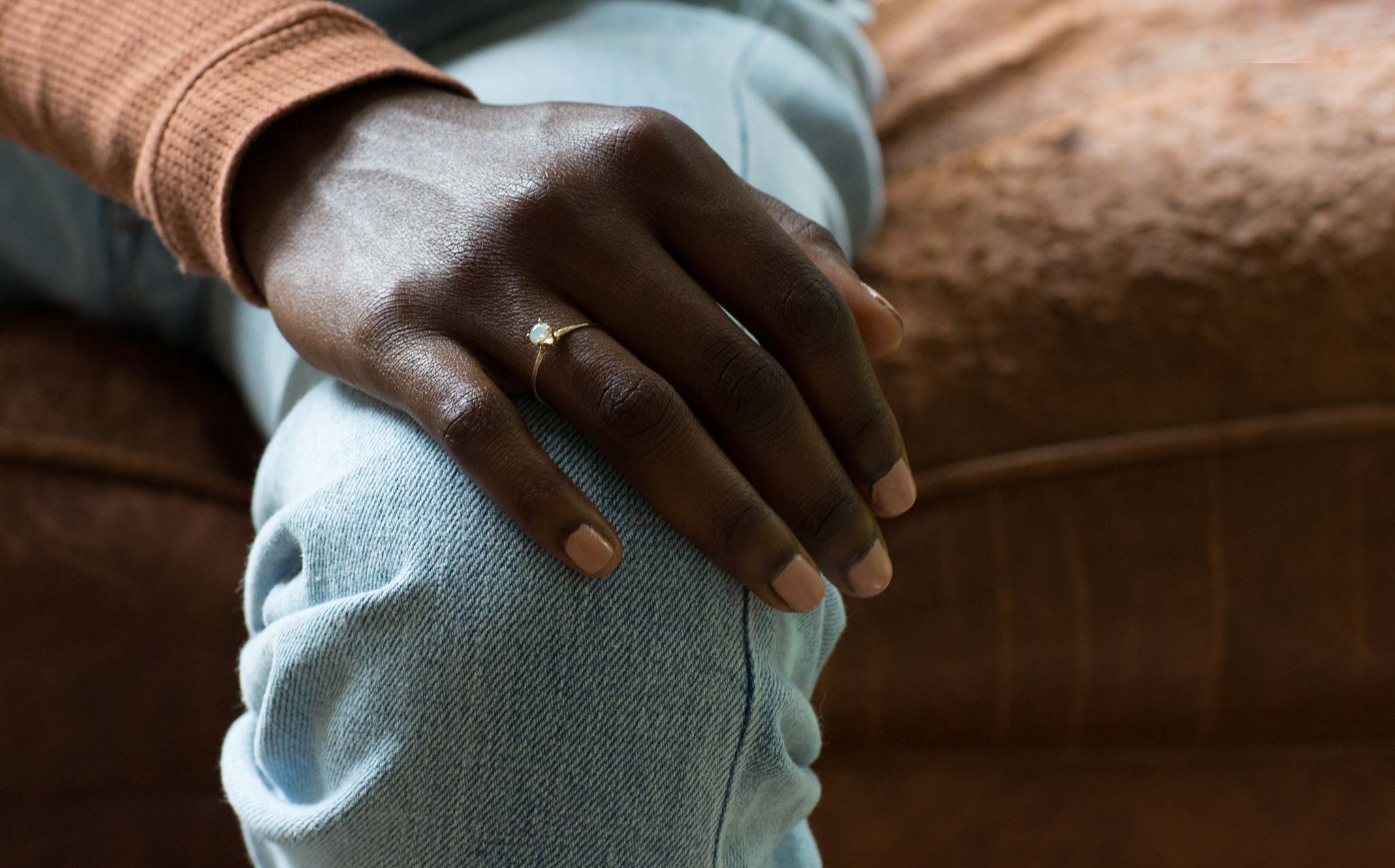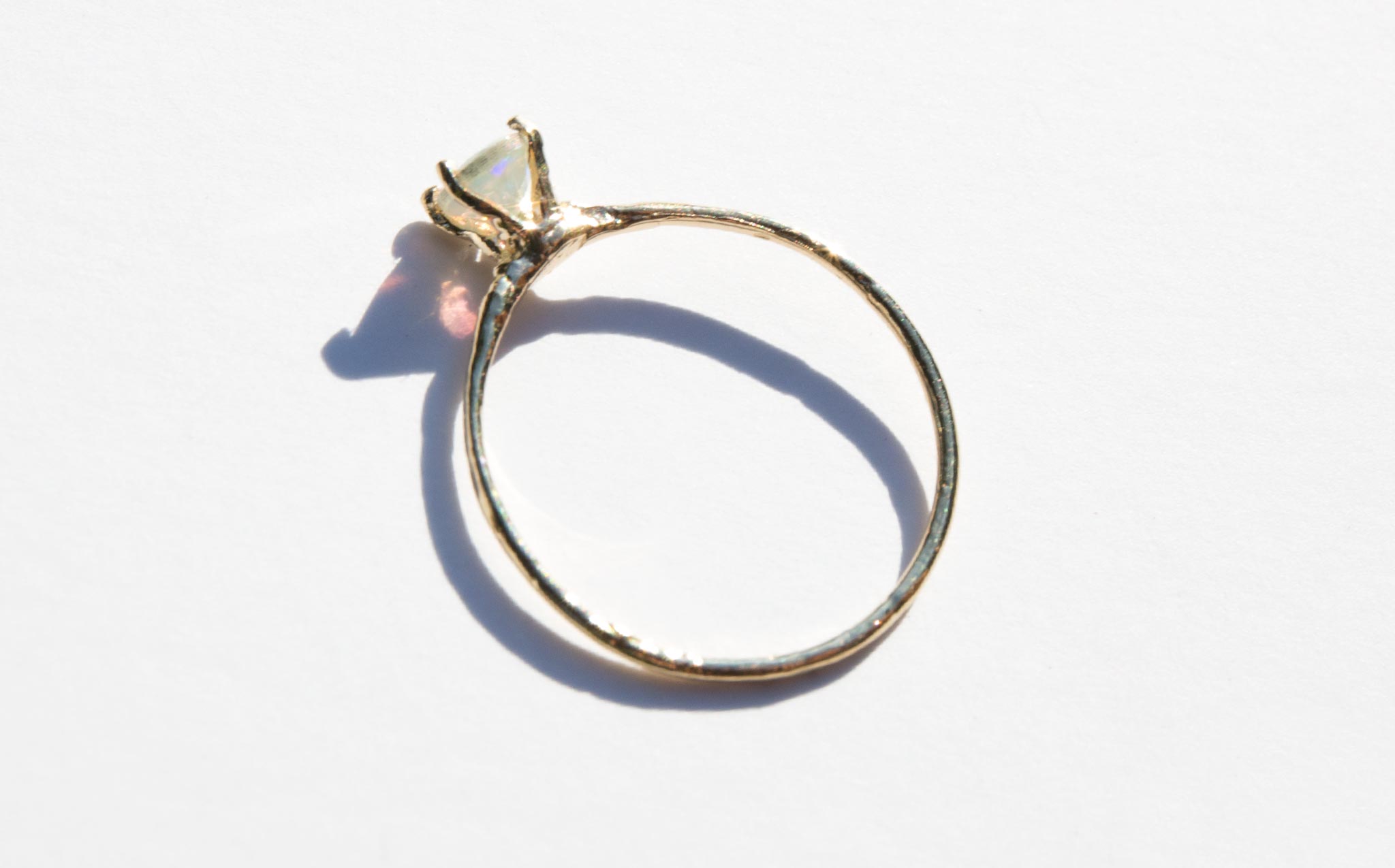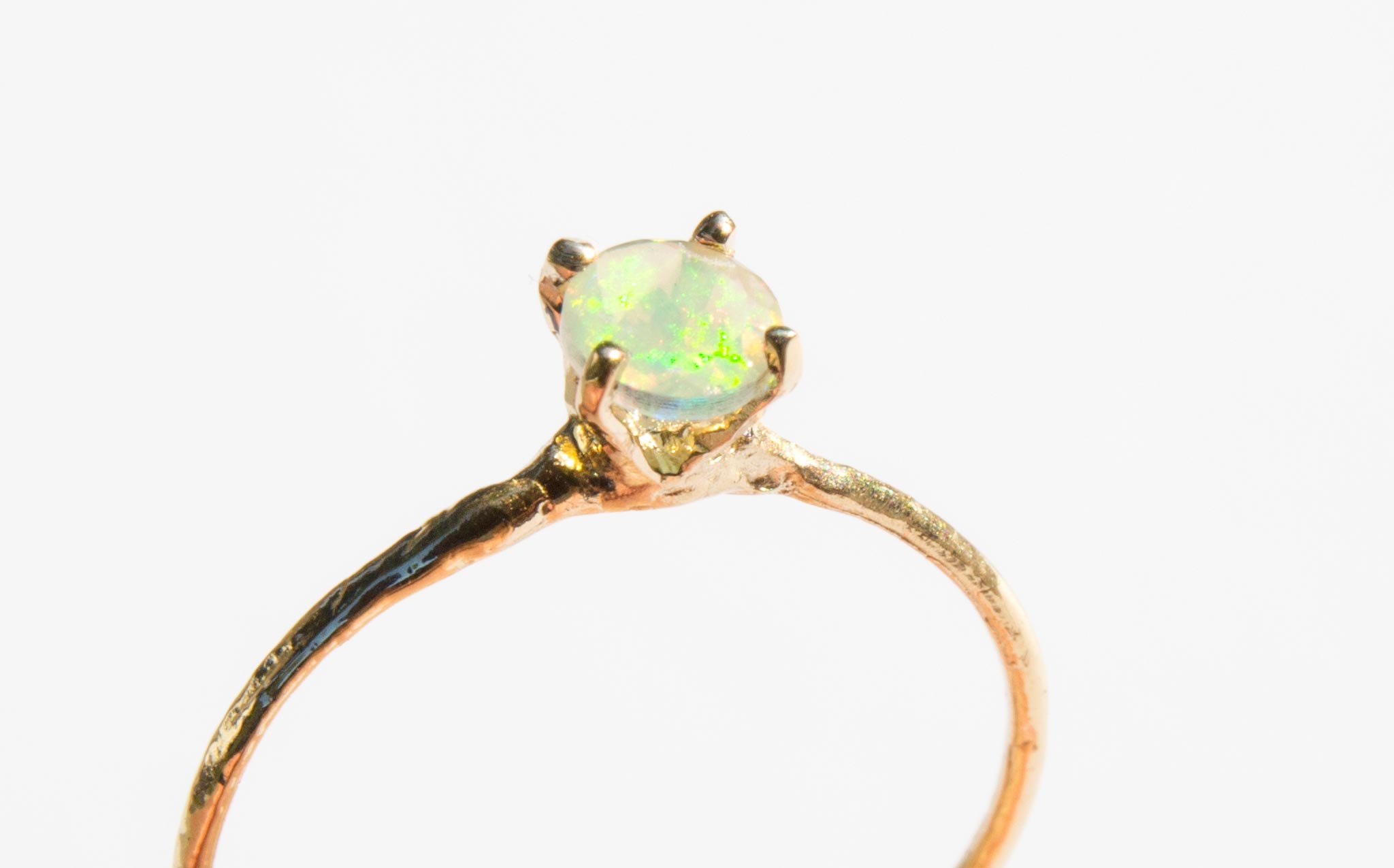 The Mondo Mondo Opal Princess Ring is a delicate 14K gold band set with a small, luminescent opal.