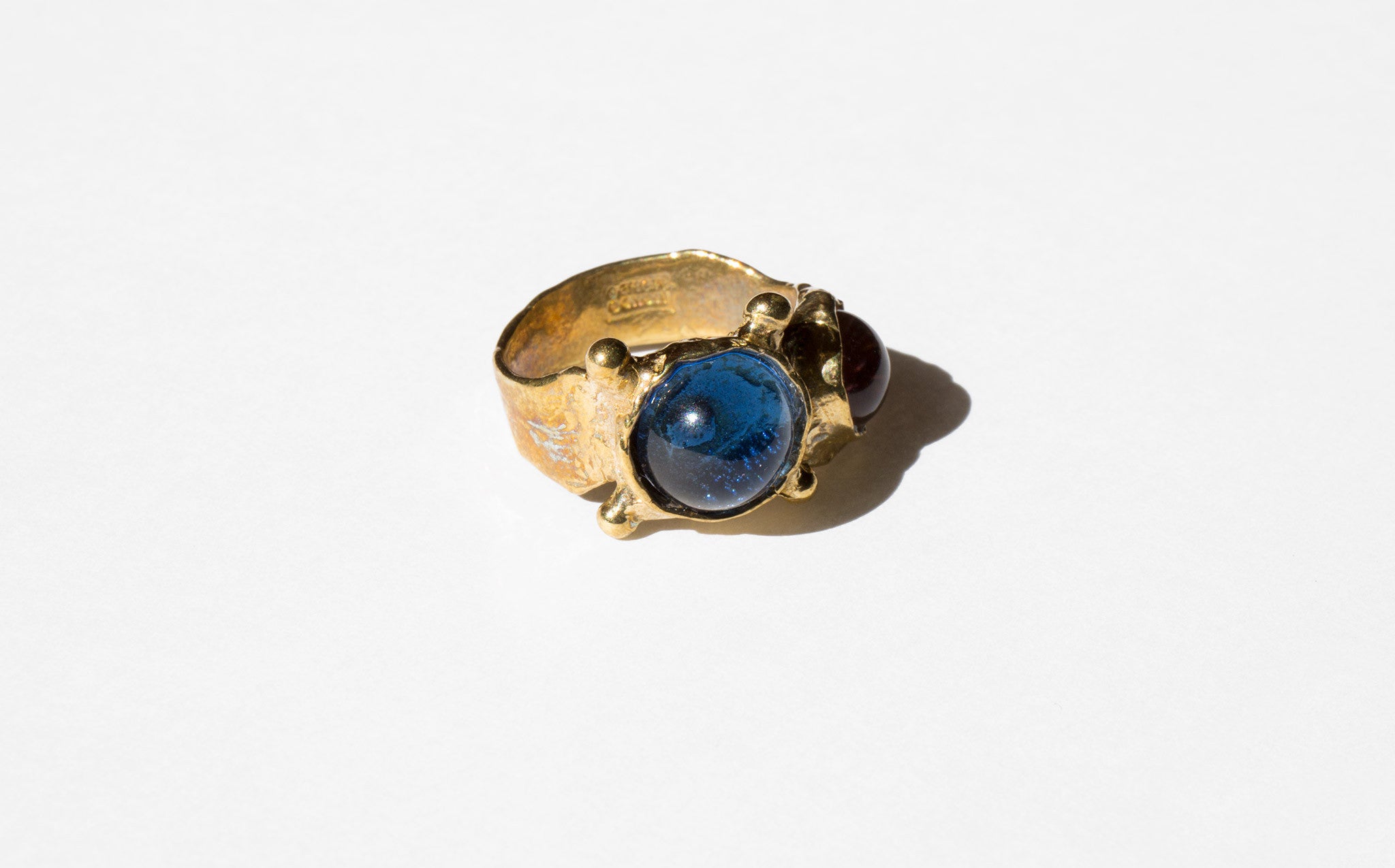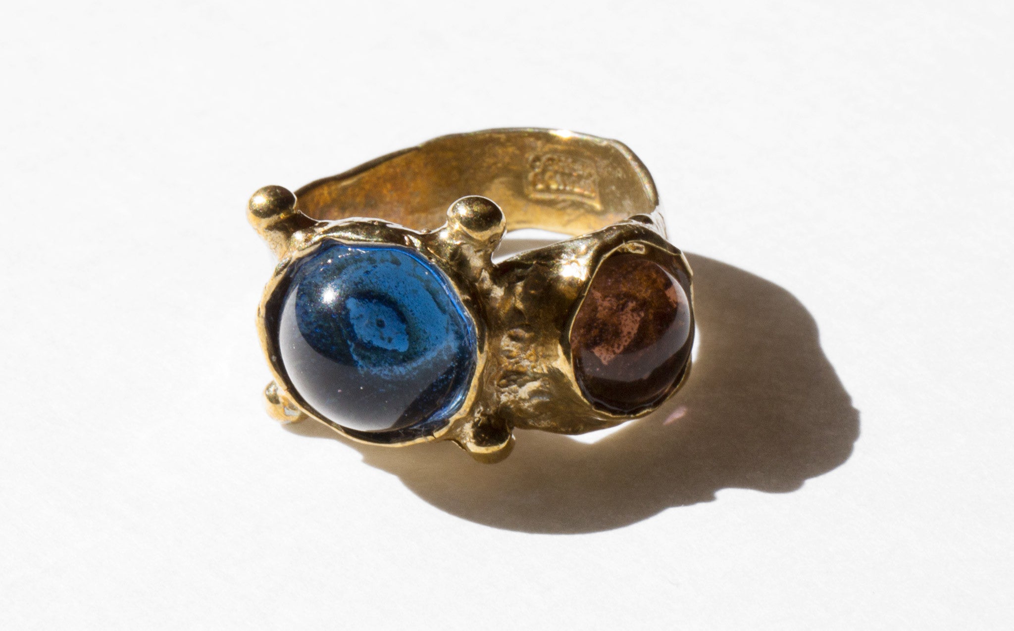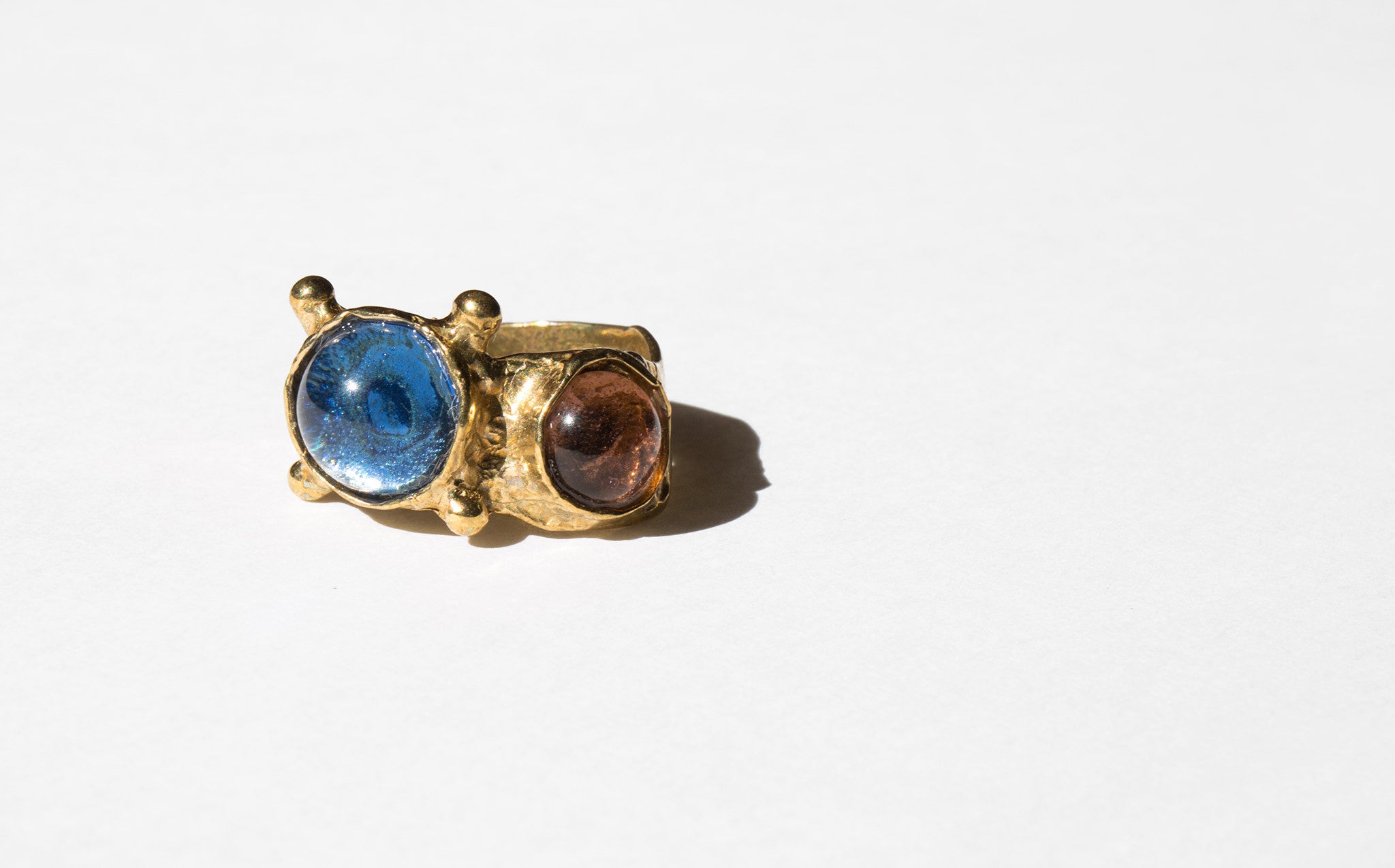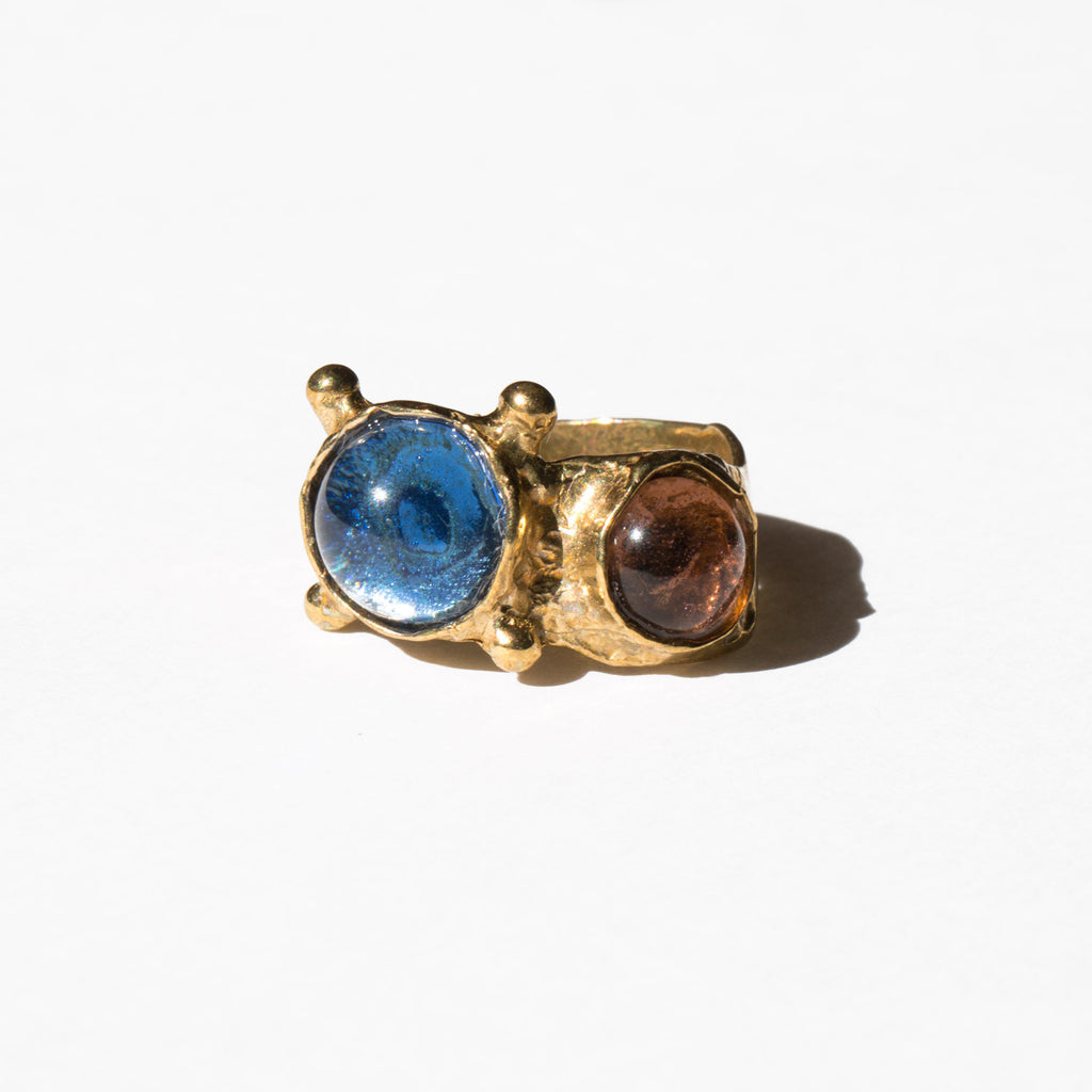 Sculptural brass ring with jewel-toned glass cabochons. Mondo Mondo rings are stackable, becoming a unique statement to each wearer.