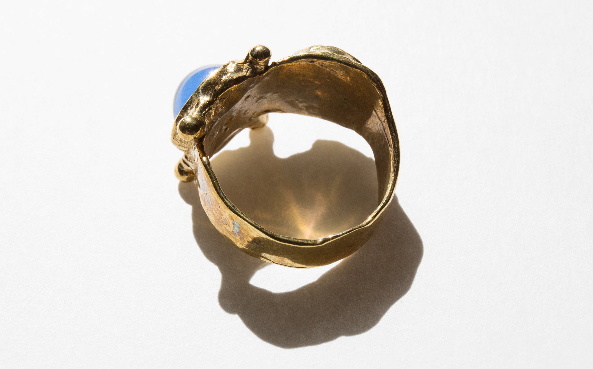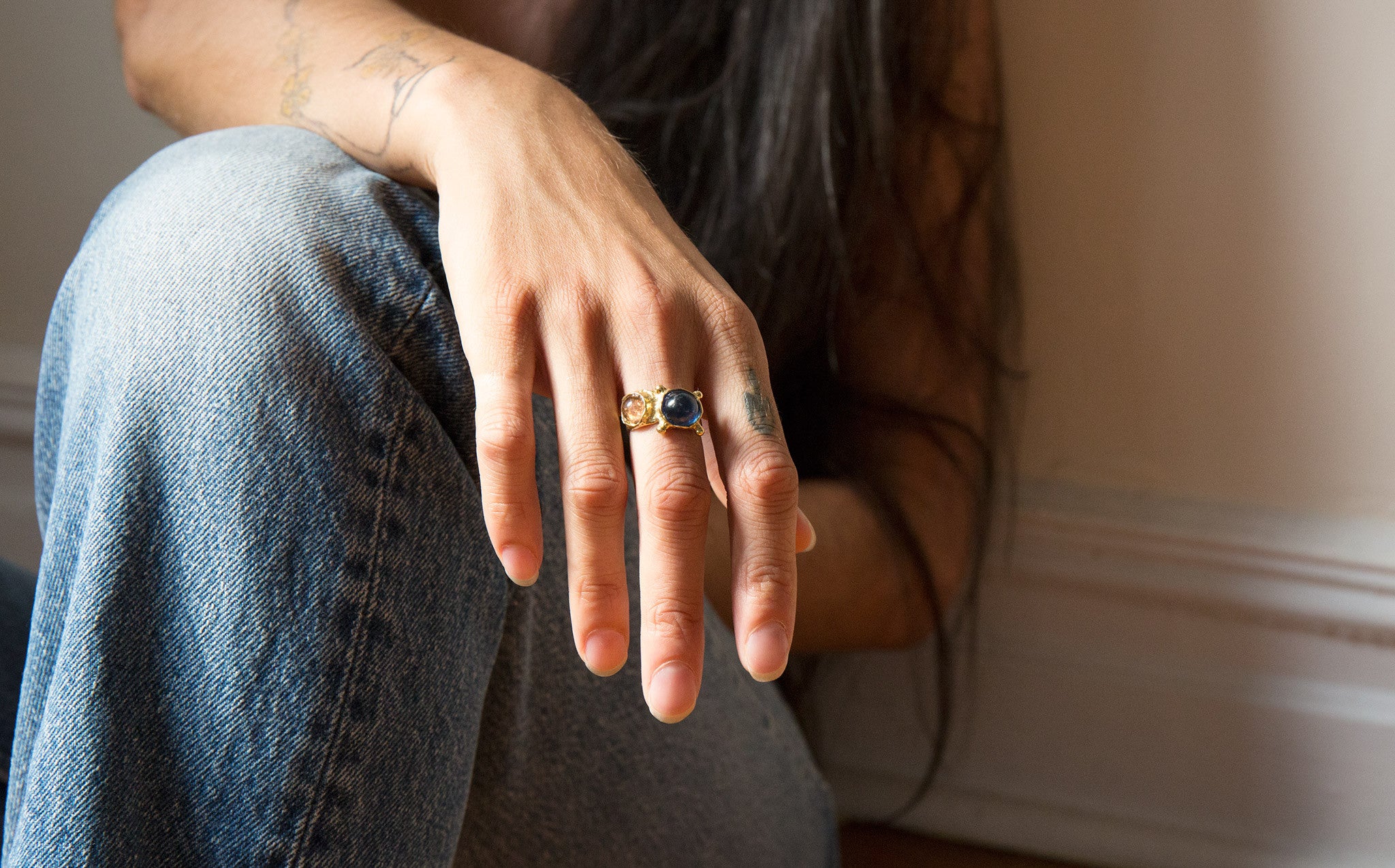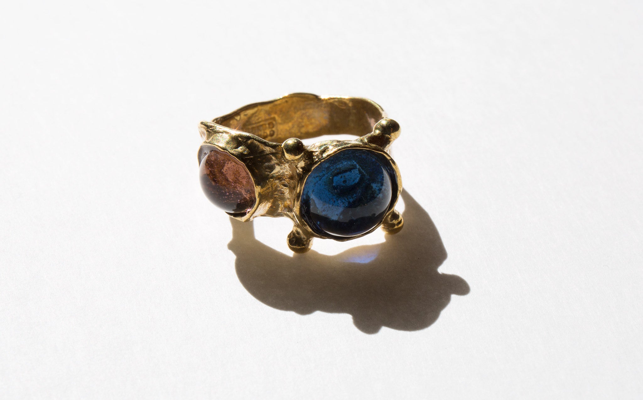 Sculptural brass ring with jewel-toned glass cabochons. Mondo Mondo rings are stackable, becoming a unique statement to each wearer.