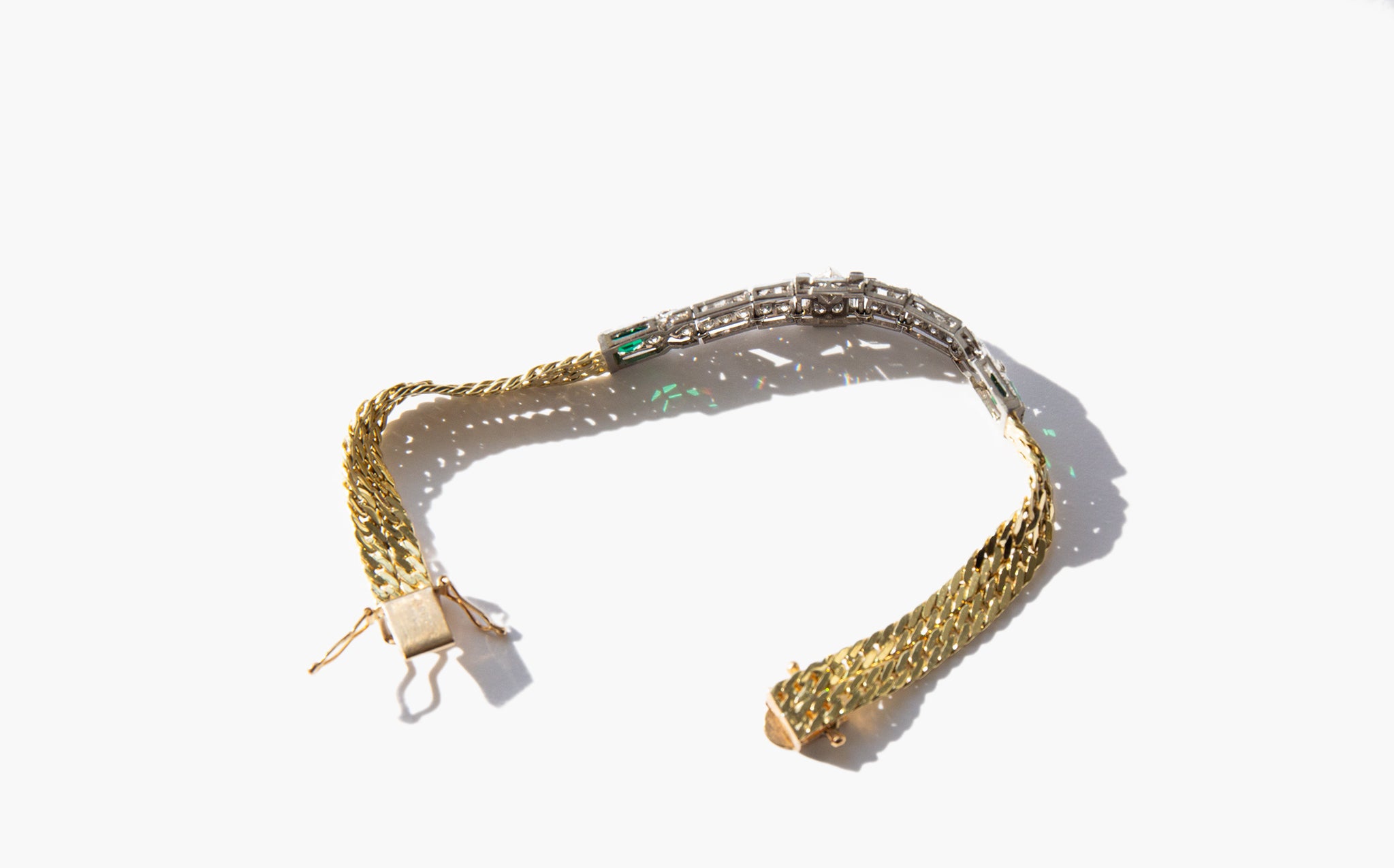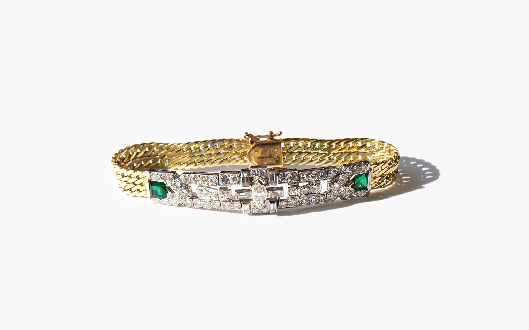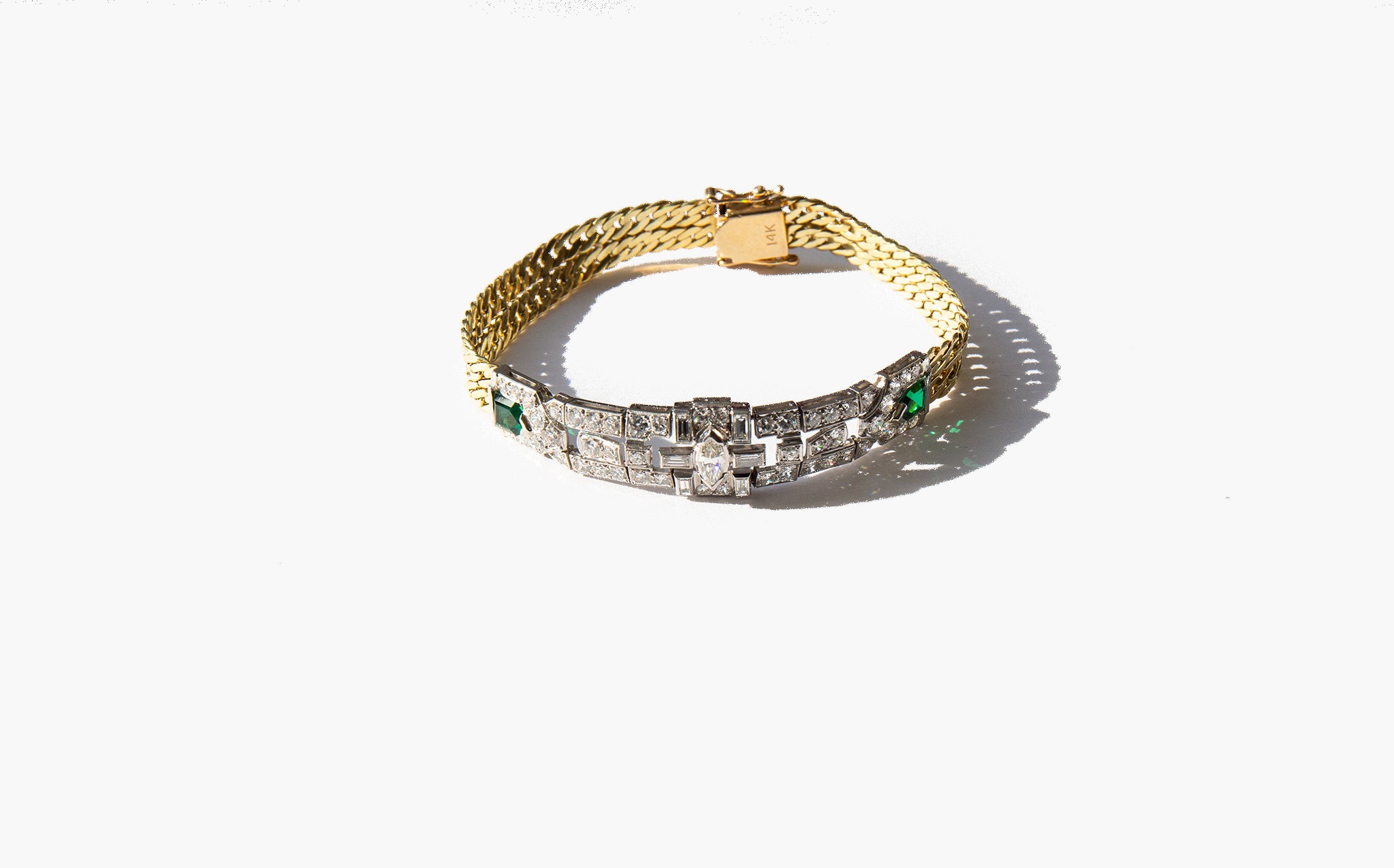 Antique art deco 14k gold and platinum bracelet with 3 carats of diamonds and shining emerald accents.