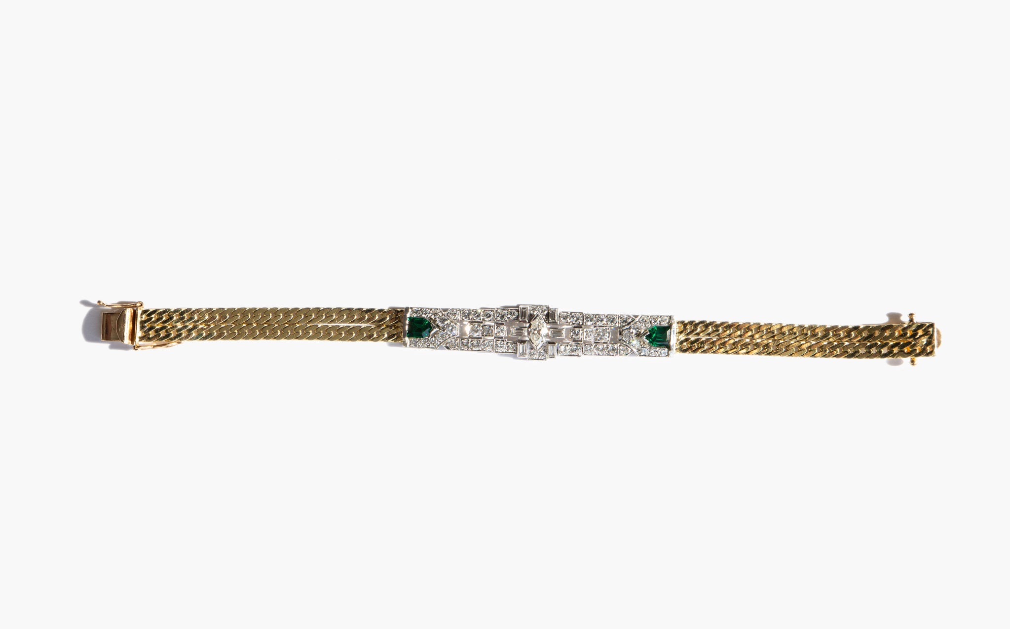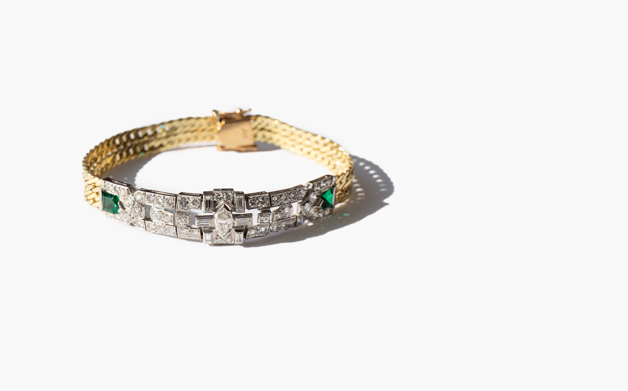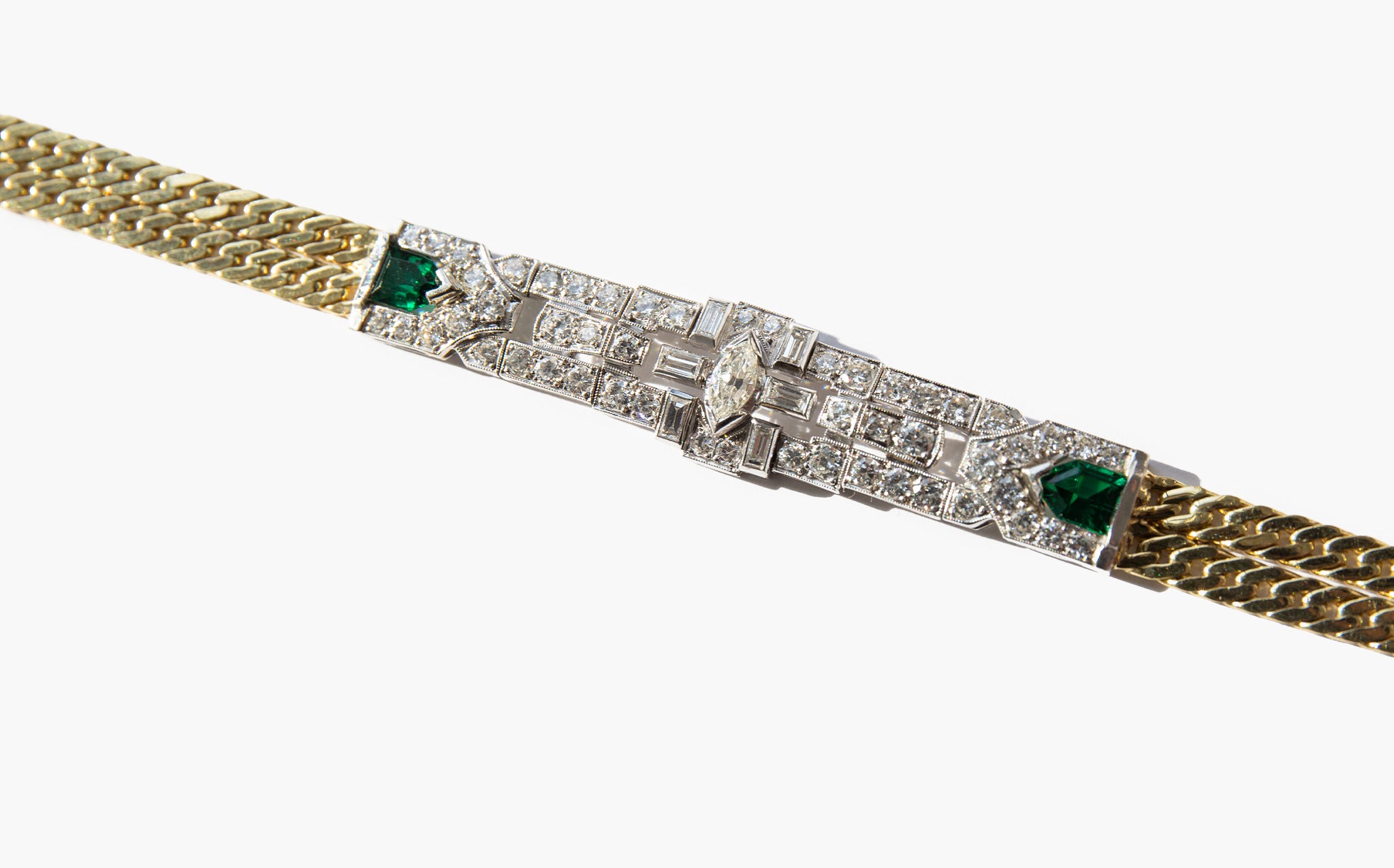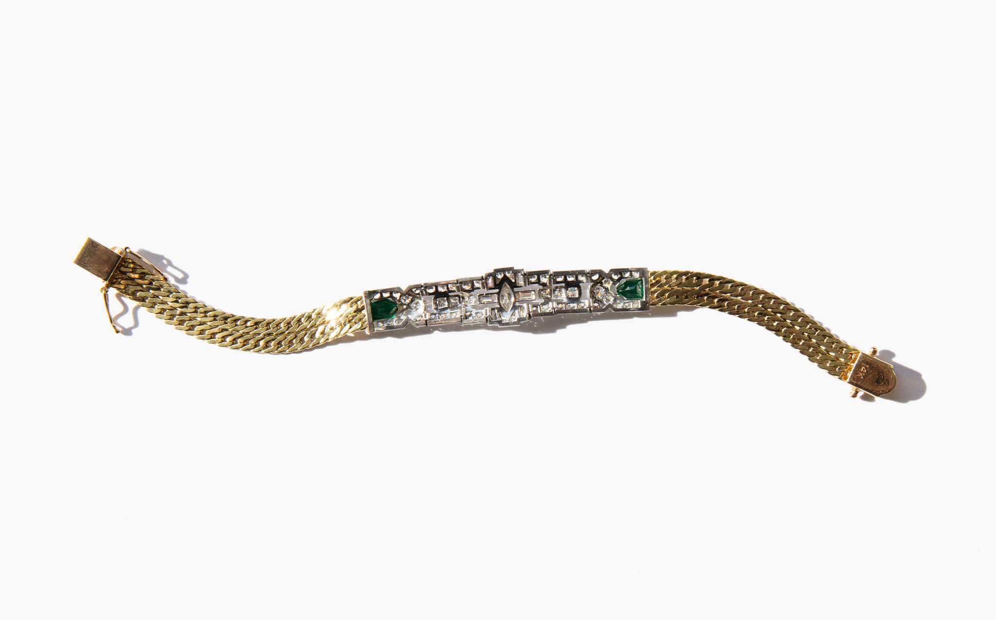 Antique art deco 14k gold and platinum bracelet with 3 carats of diamonds and shining emerald accents.