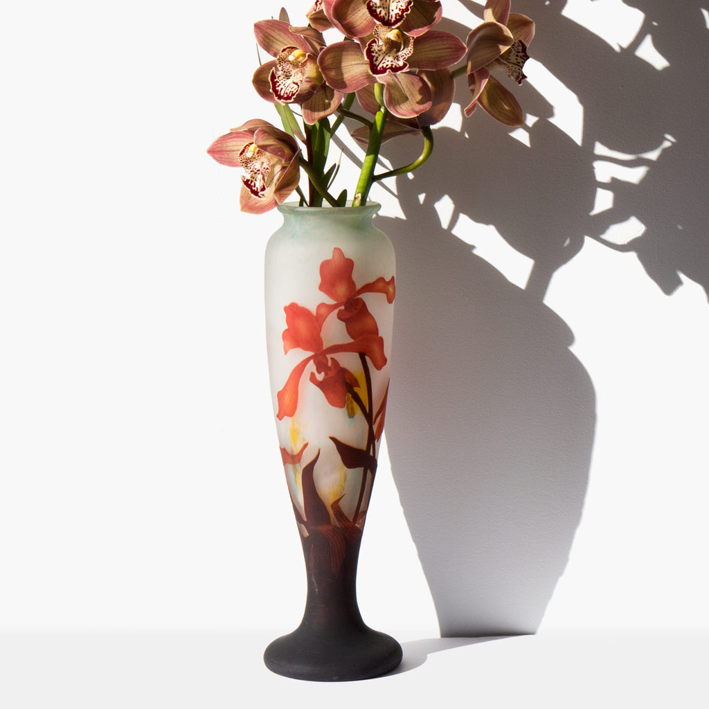 Lovely and striking art nouveau glass vase by Muller Fréres, a renowned French glassmaker in Luneville, France, famous for its layered and colored glass Art Nouveau vases, lampshades, and chandeliers. Established in 1895 by the Muller brothers, Muller Fréres halted production in 1933 and closed for good in 1936 due to the Great Depression.