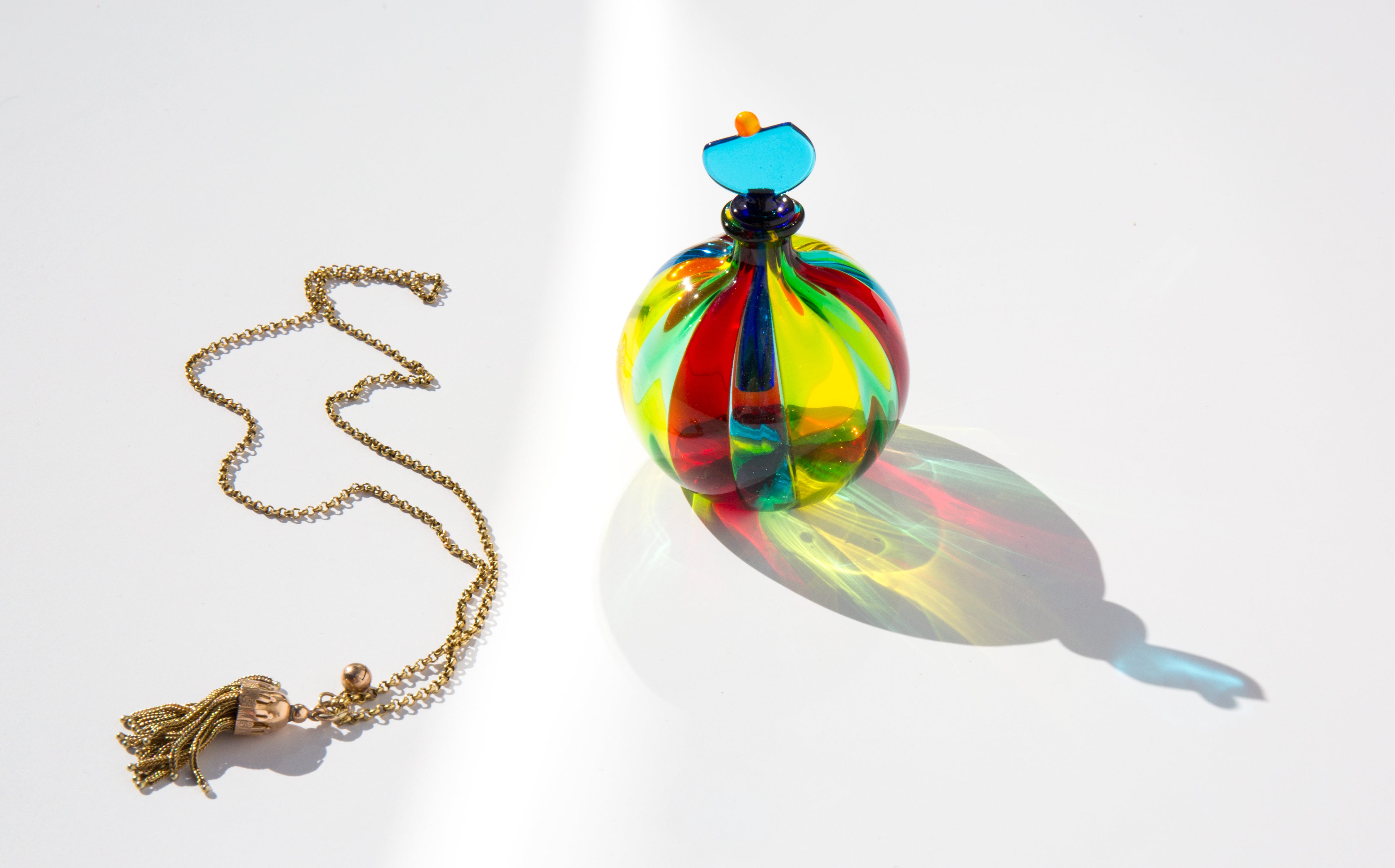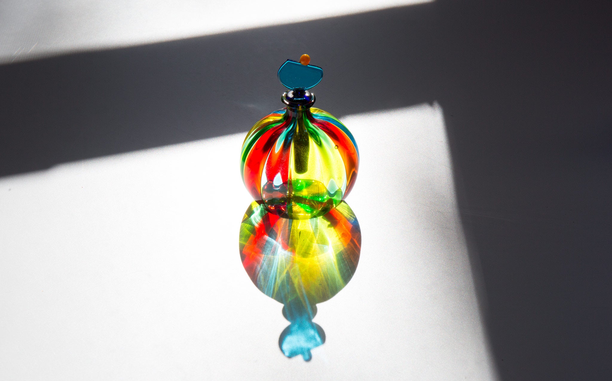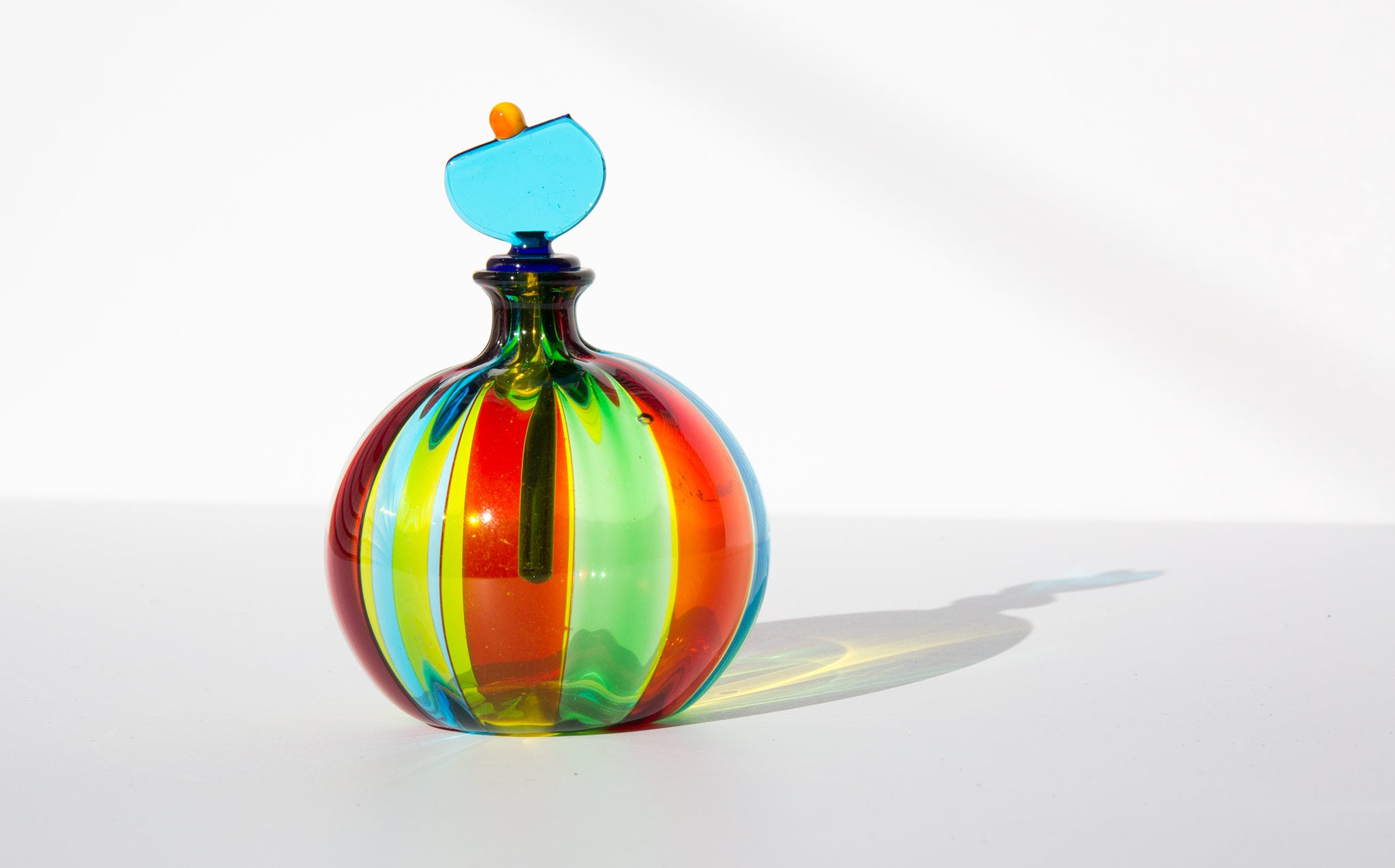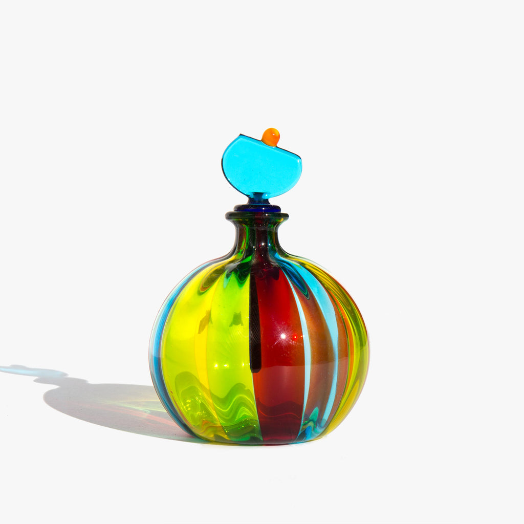 Incredibly colored, hand blown, Italian murano glass perfume bottle.