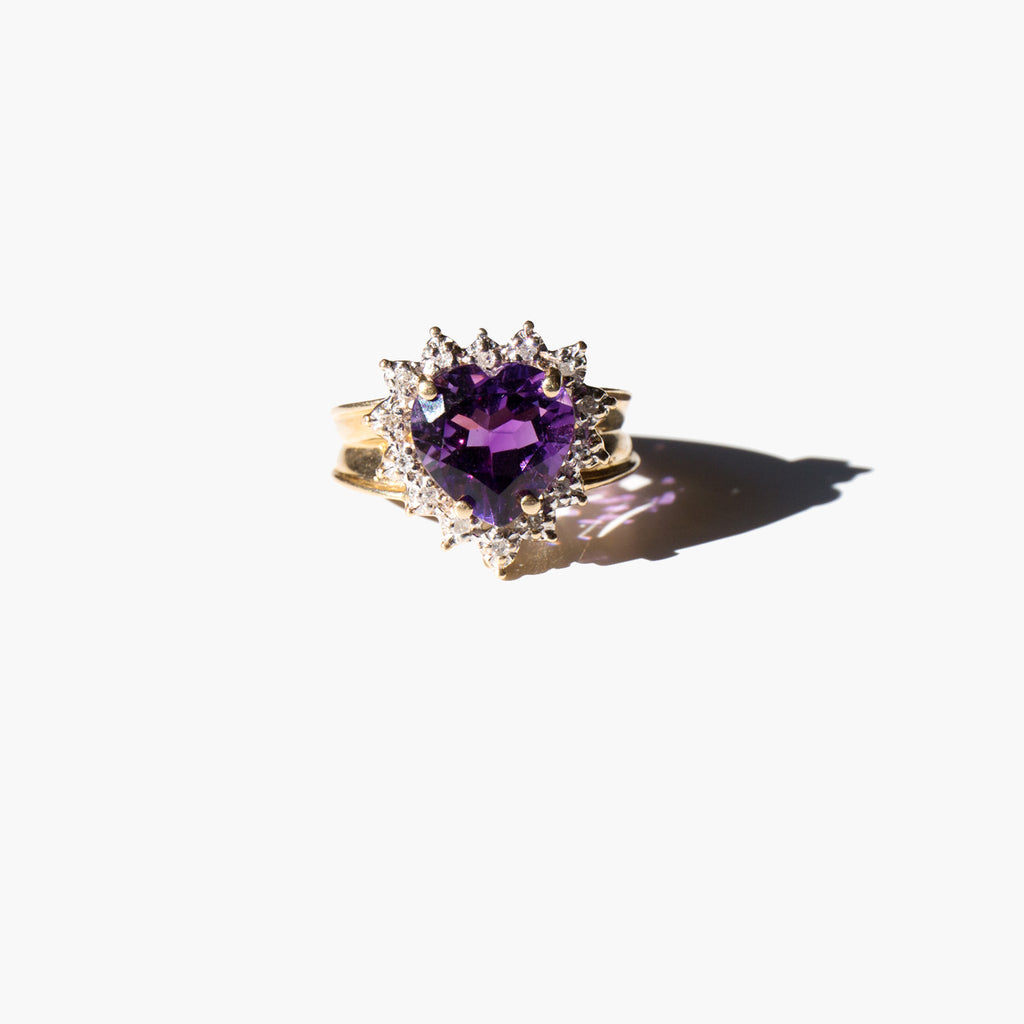 14k gold, diamond, and amethyst heart ring. A gemstone worn throughout the centuries as a symbol of purity and spirituality, an amulet of protection against evil, and as a talisman of success and wealth, the amethyst is today also thought to be grounding, to alleviate stress and headaches, and to help those suffering from bad dreams and night terrors.