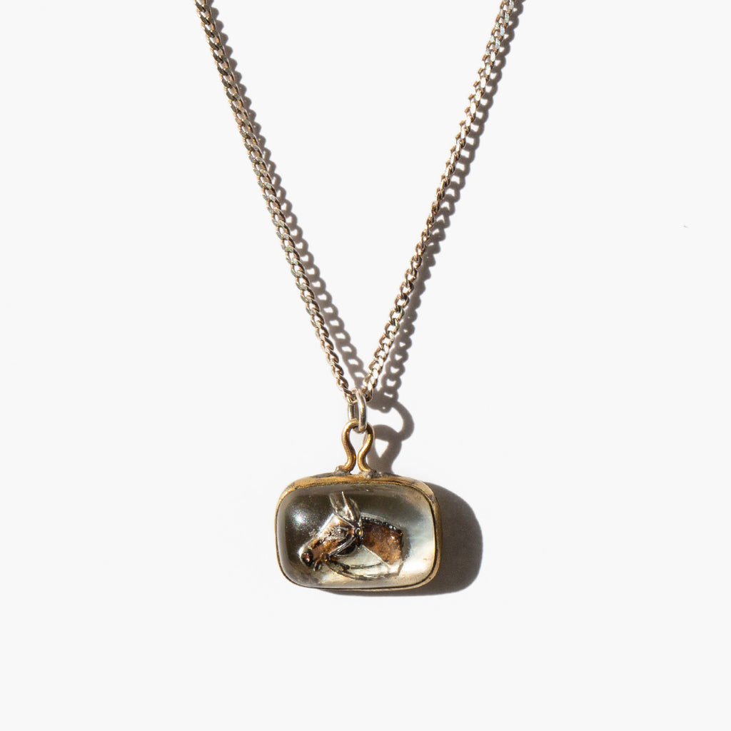 Antique 1920's necklace with a gold-filled reverse painted horse pendant strung on a delicate sterling silver link chain.