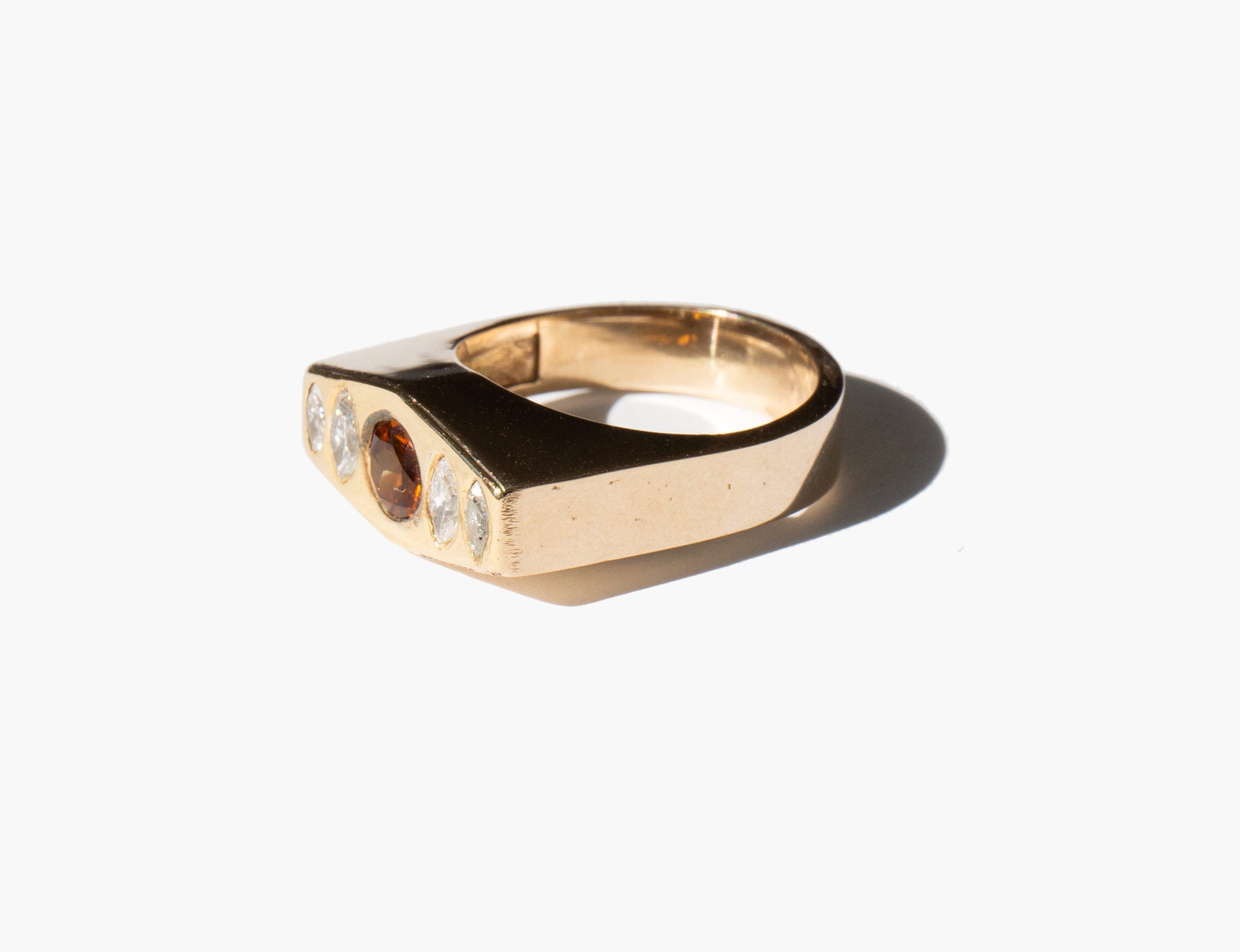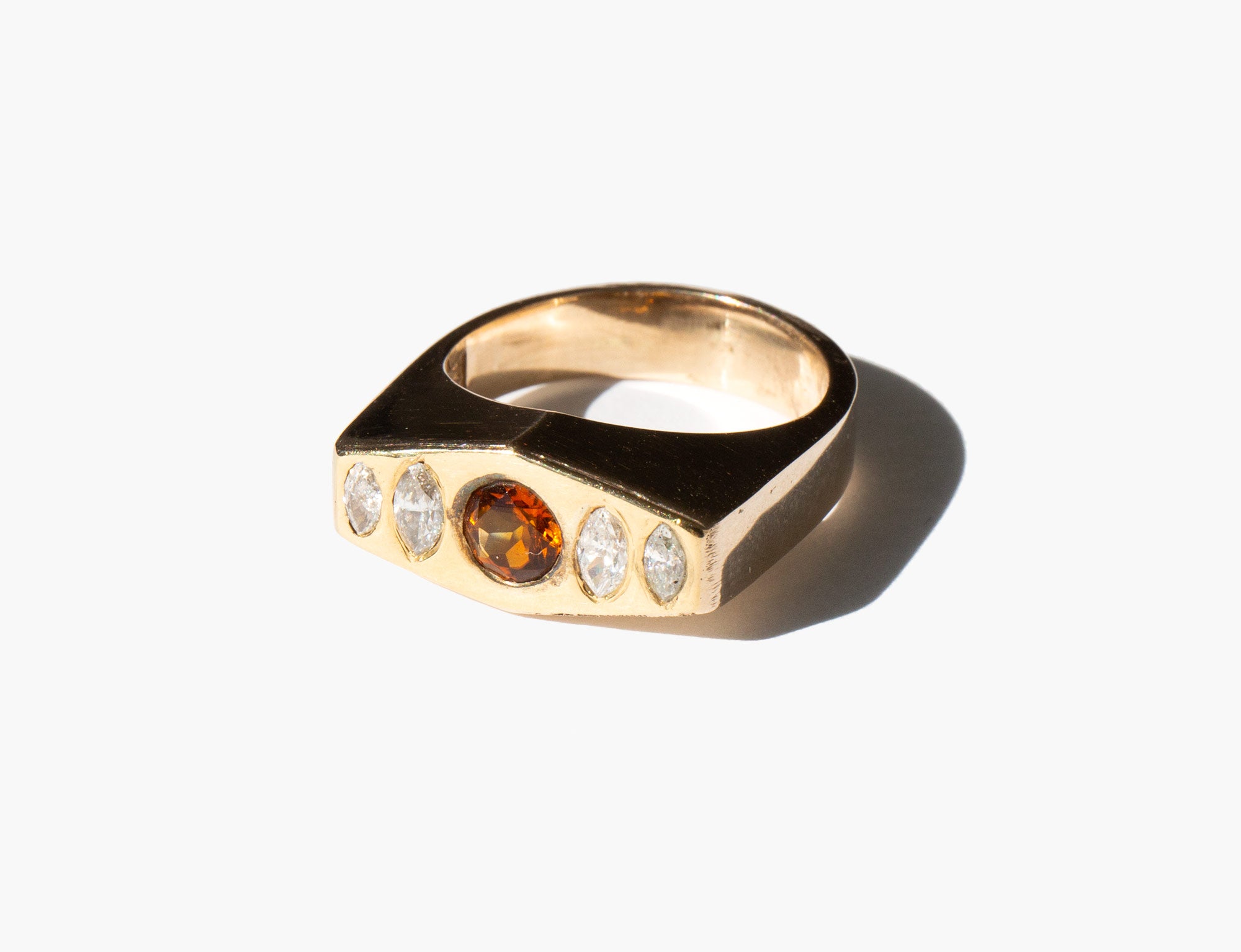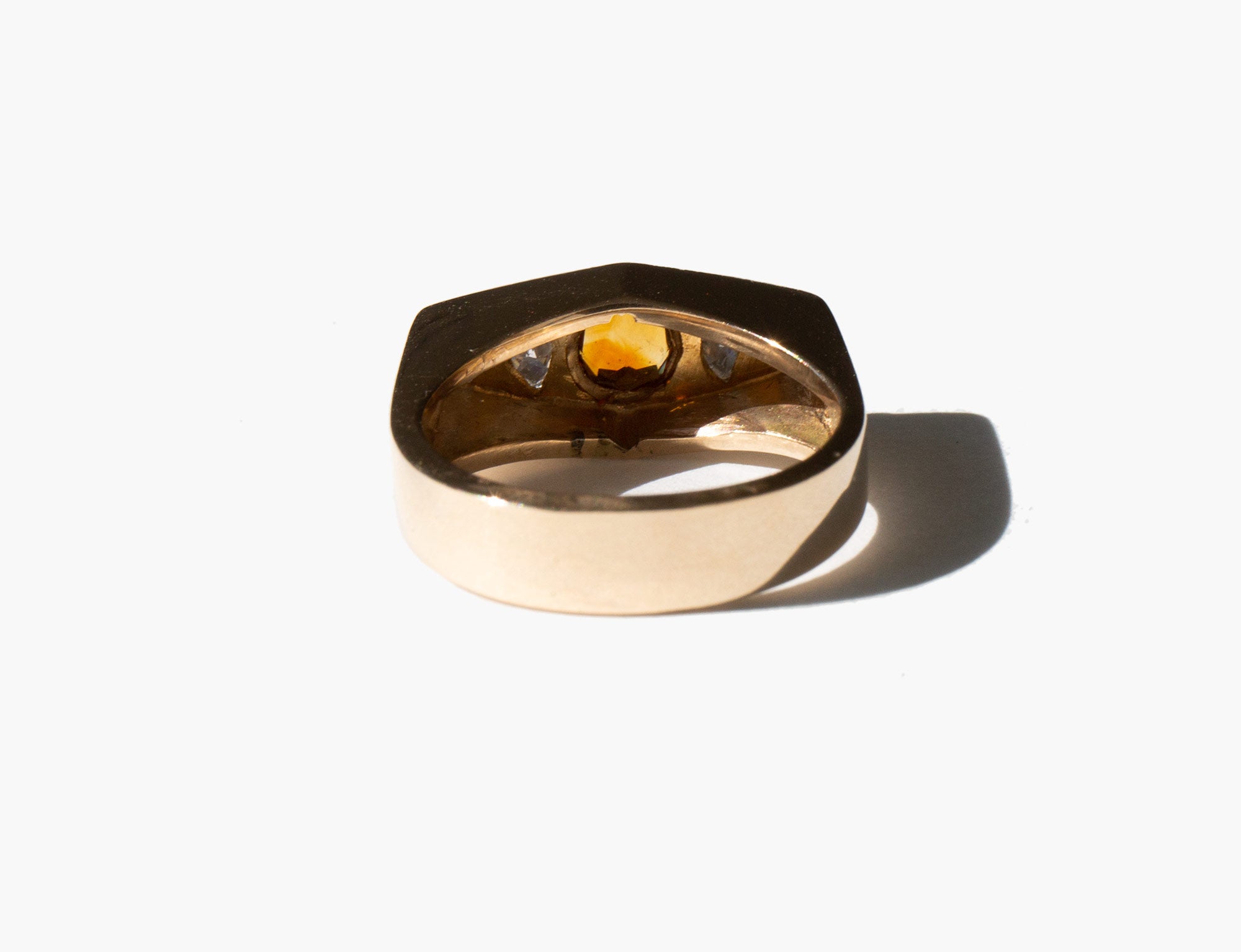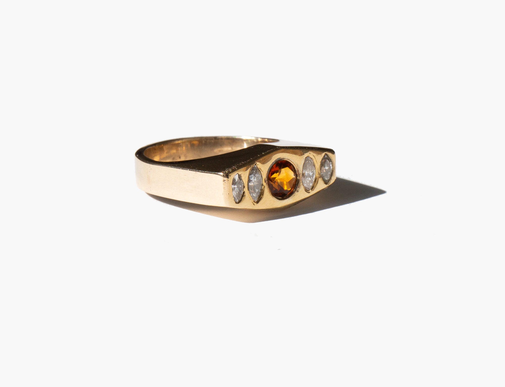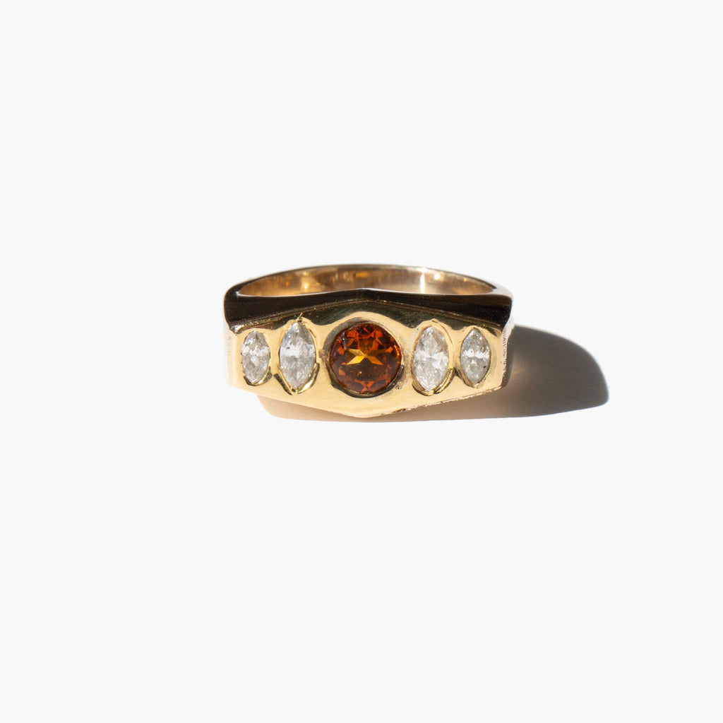 Solid 18k gold setting with diamonds and a center citrine. The happy stone, citrine is said to dispel negative energy and bring happiness and positivity into the life of the those who wear it.