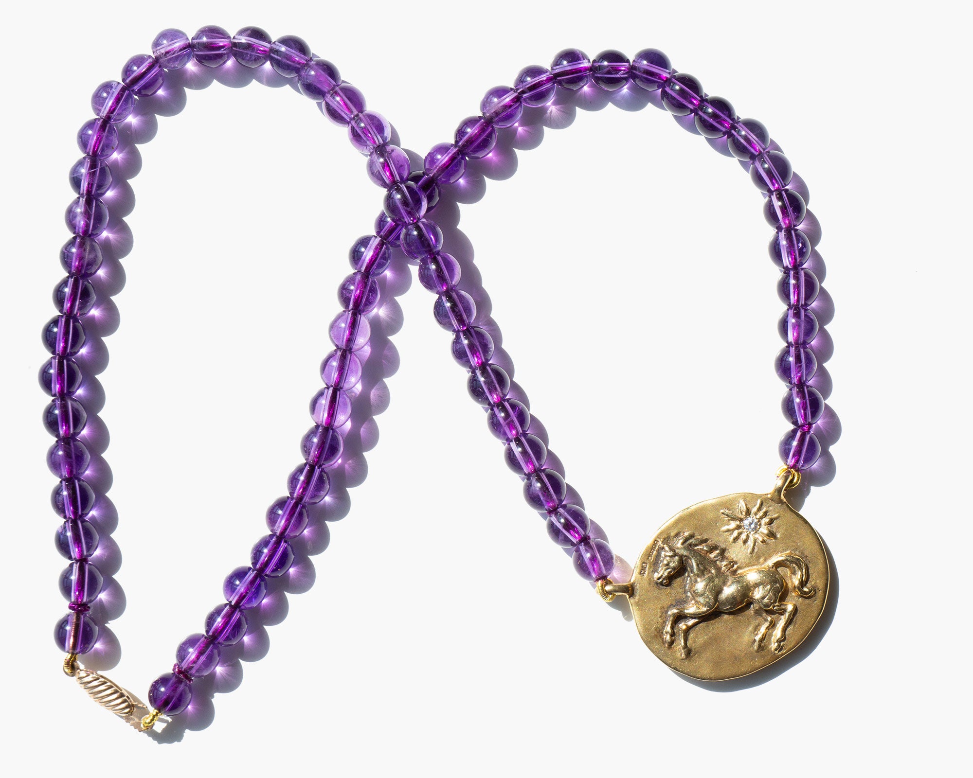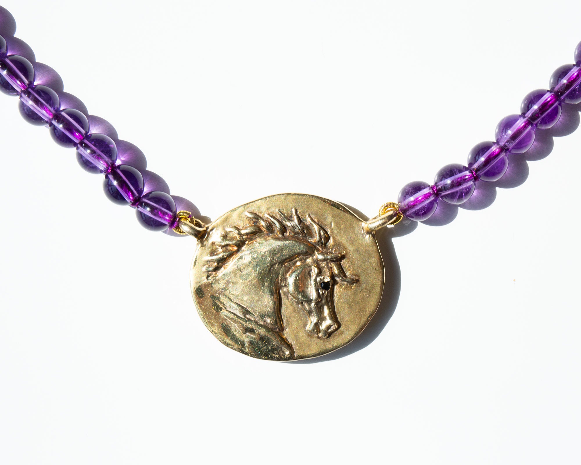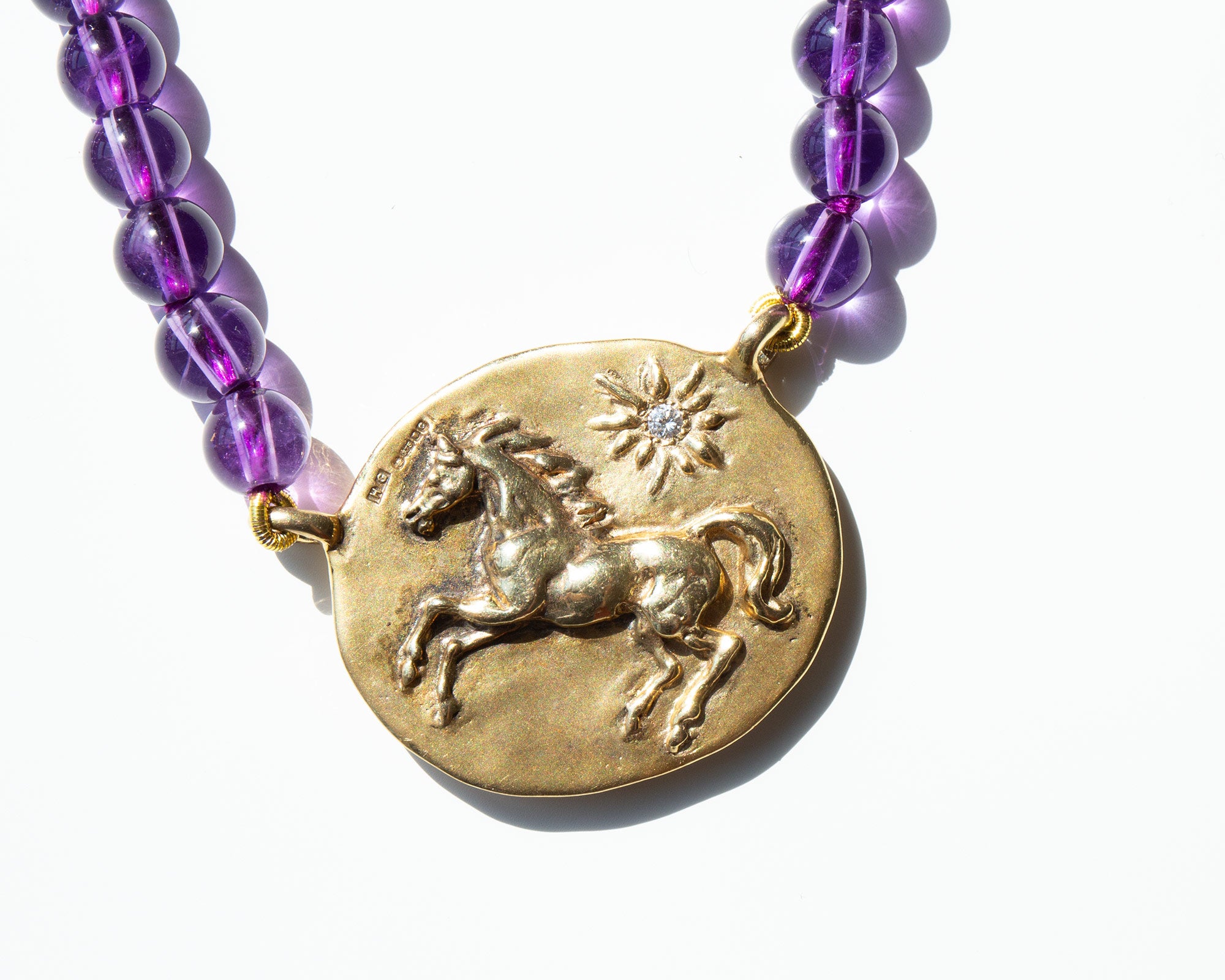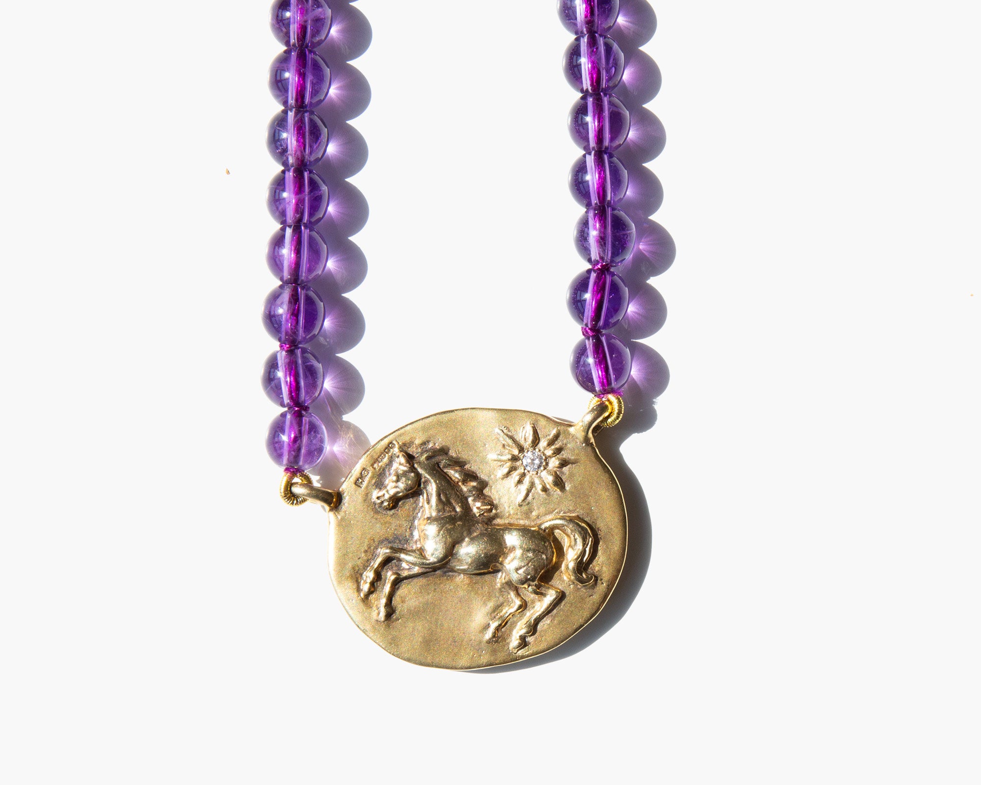 Sparkling solid 10k gold horse pendant with a diamond accent on pretty purple amethyst beads.