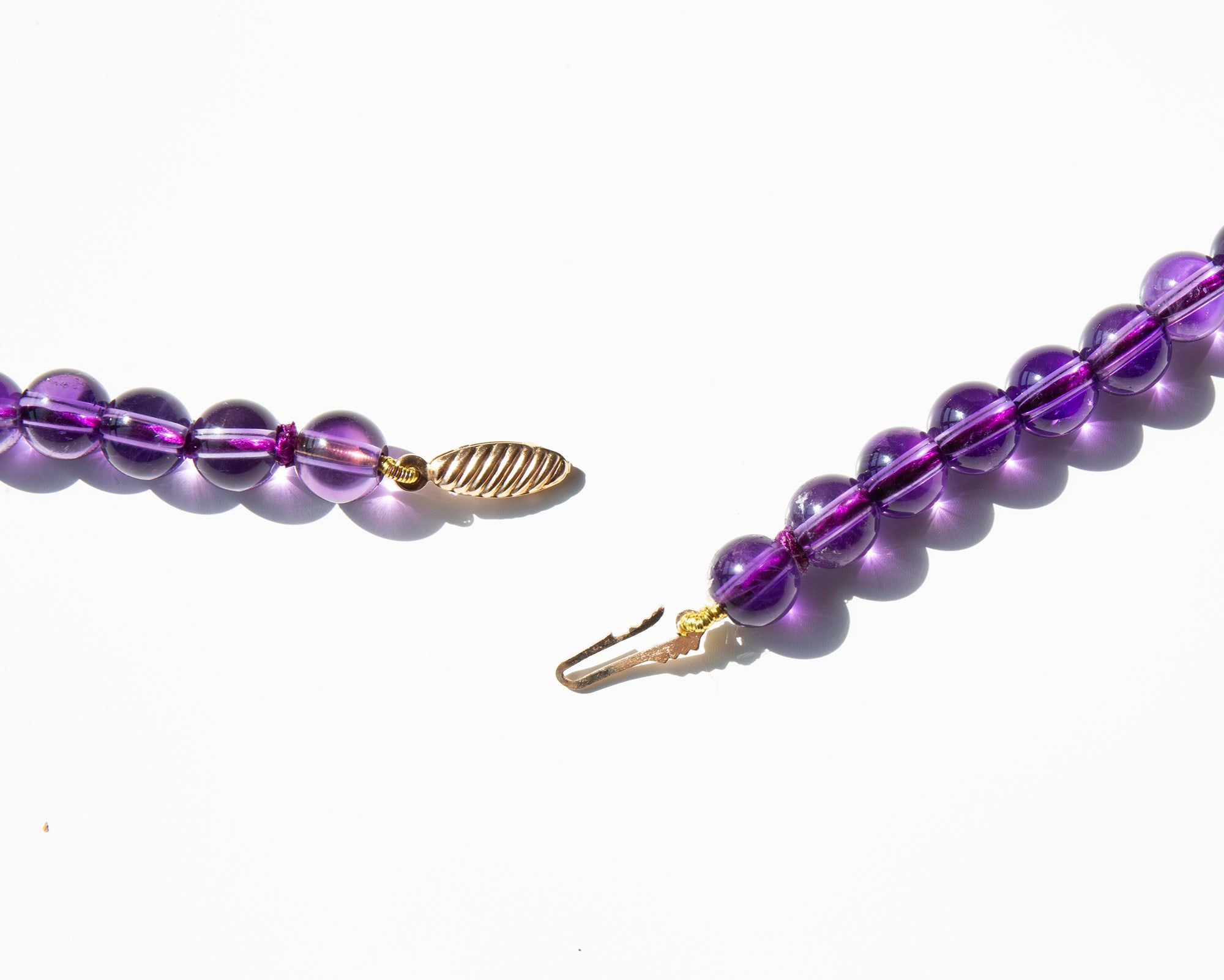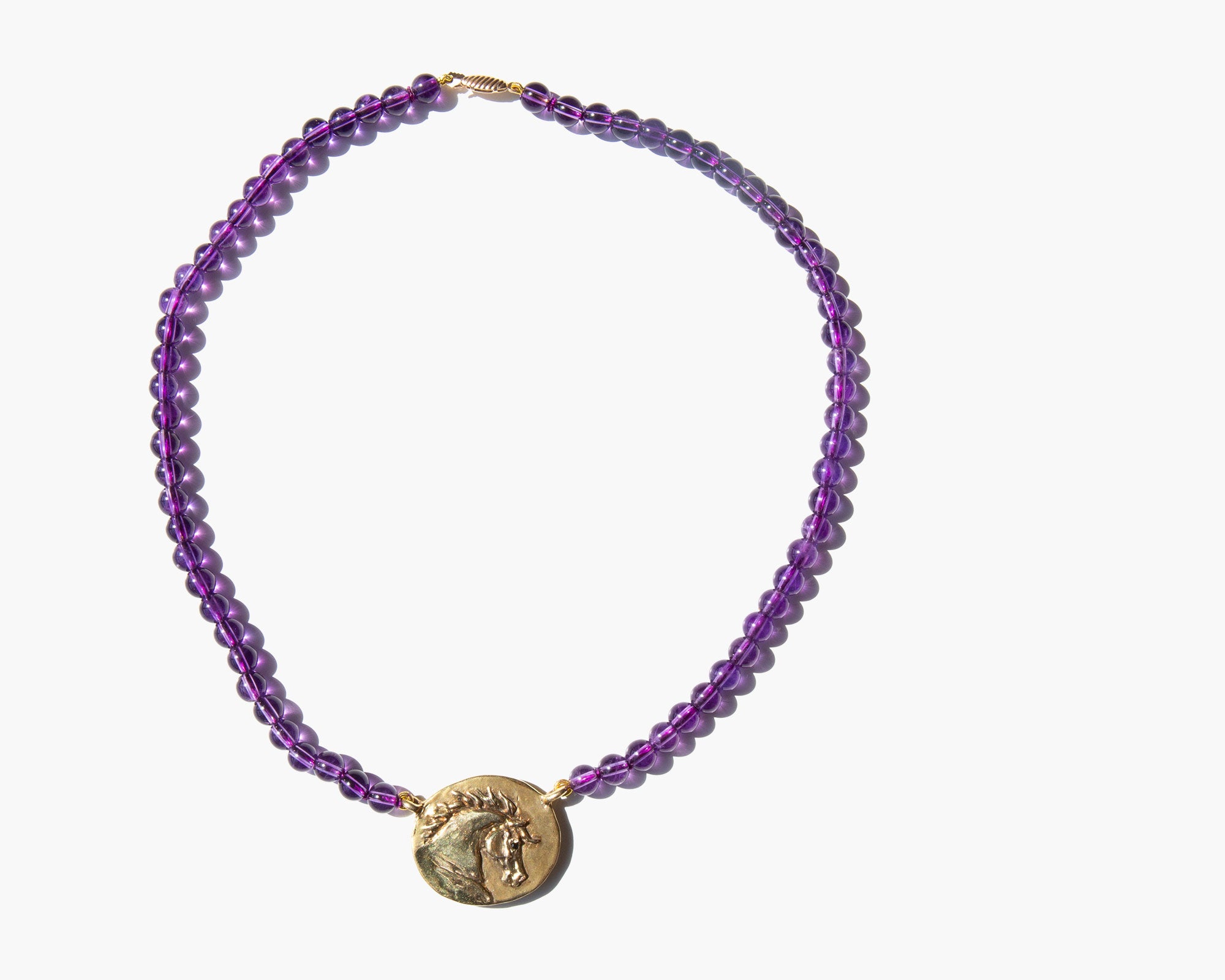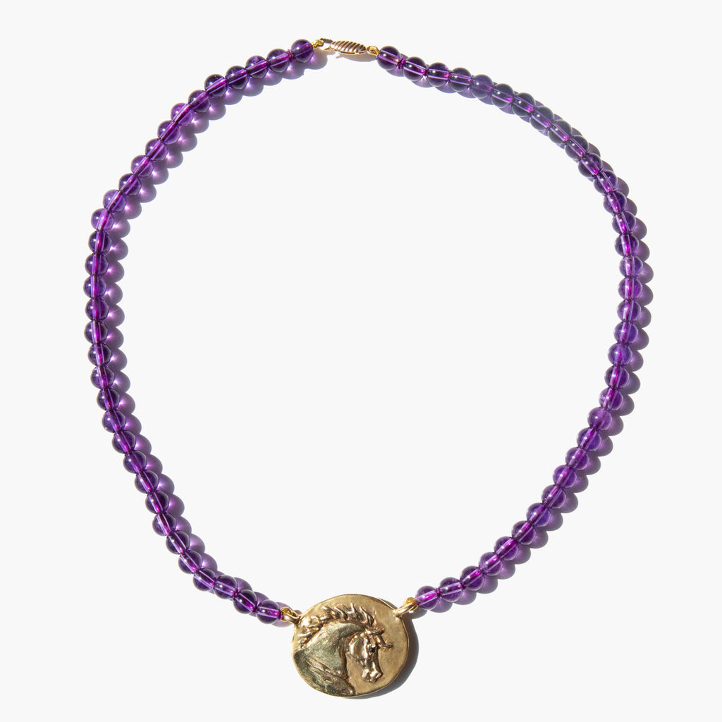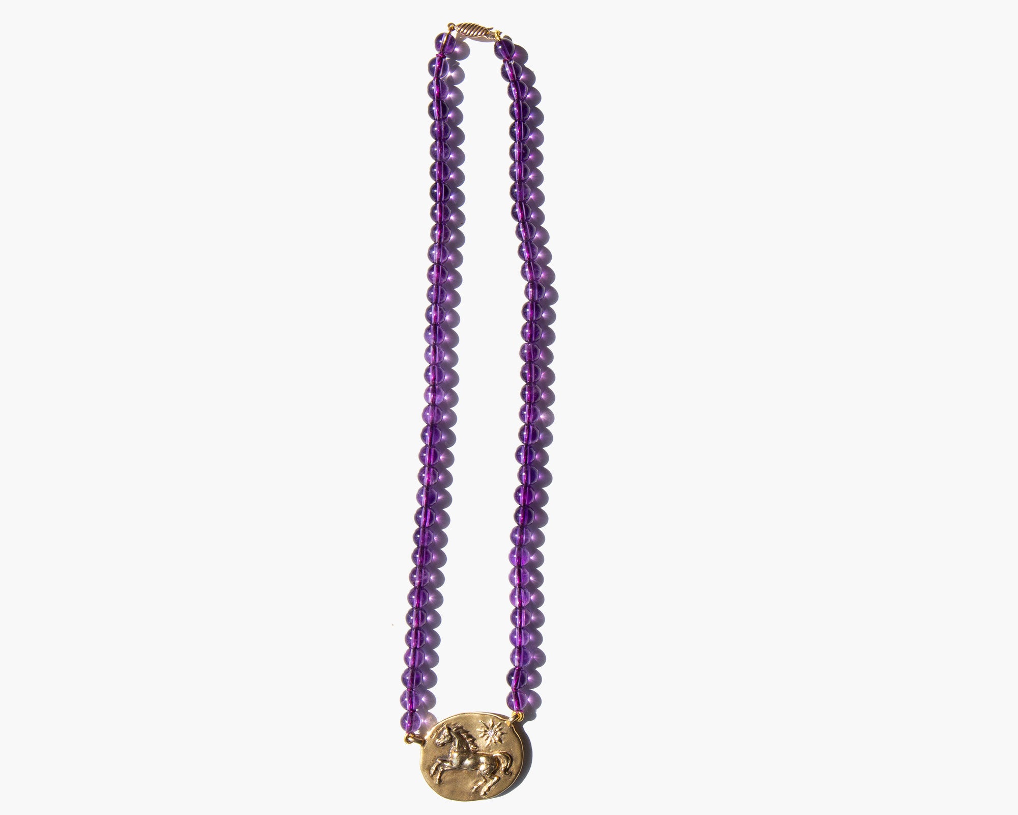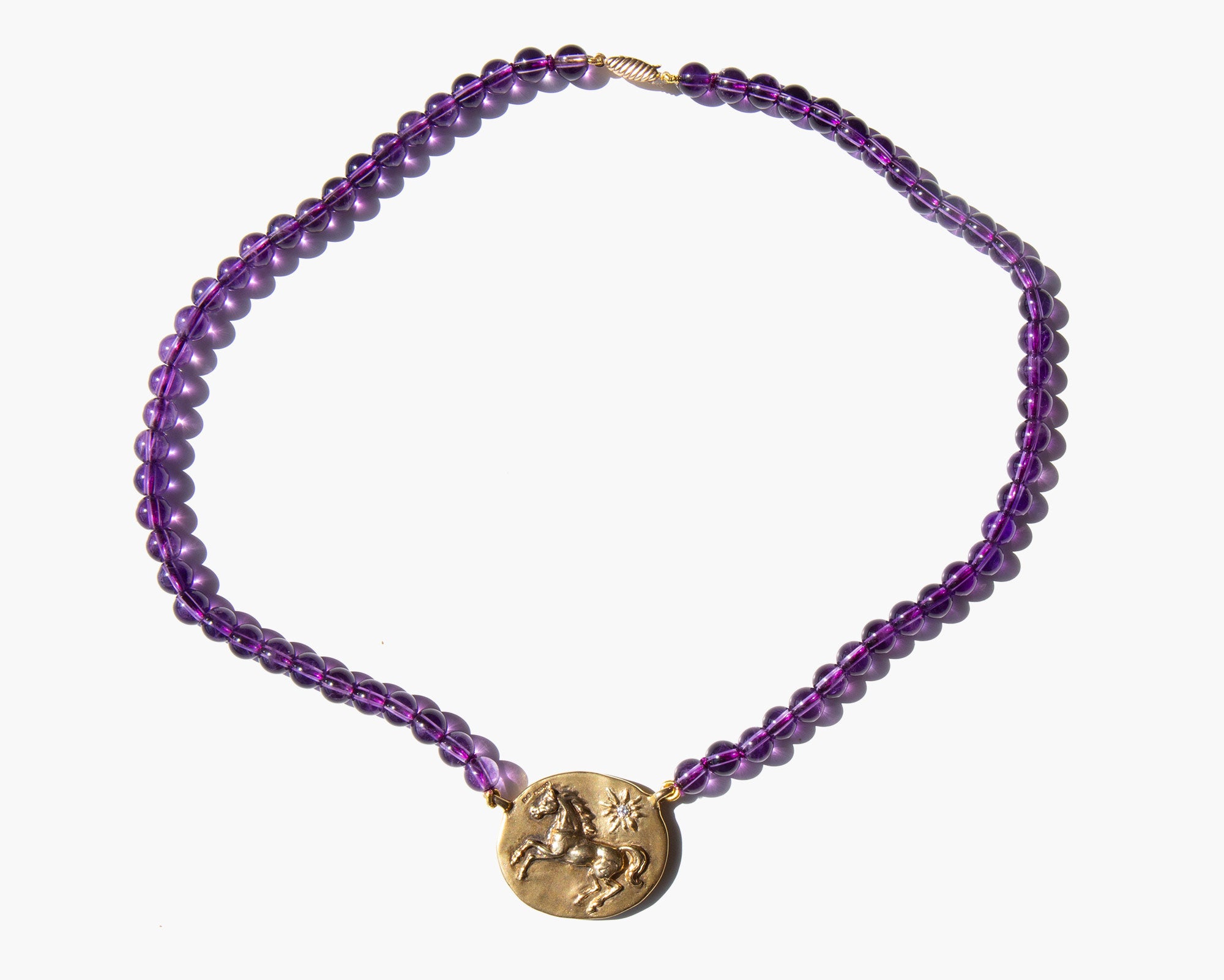 Sparkling solid 10k gold horse pendant with a diamond accent on pretty purple amethyst beads.
