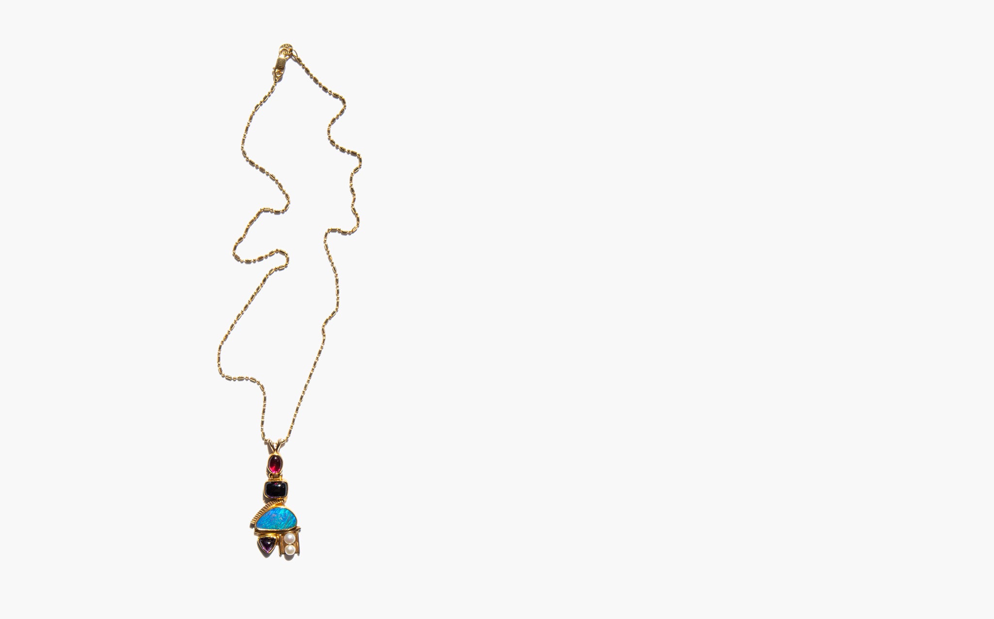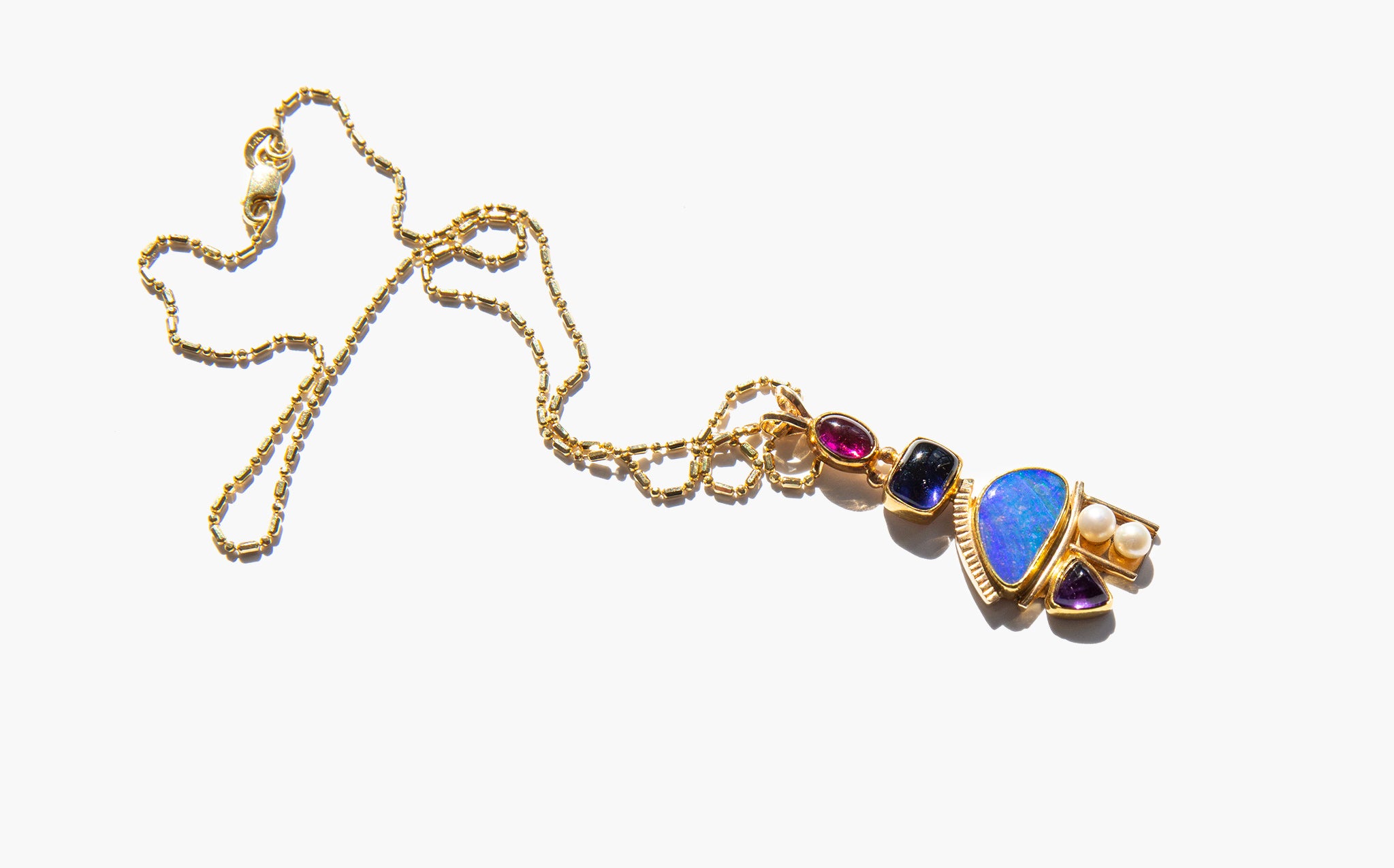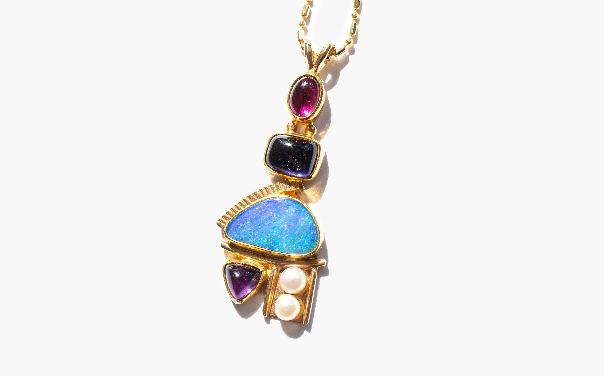 Unusual, sparkling 14k gold chain with a sculptural, artisan made pendant of 14k gold, boulder opal, rubellite tourmaline, blue spinel, and river pearls.
