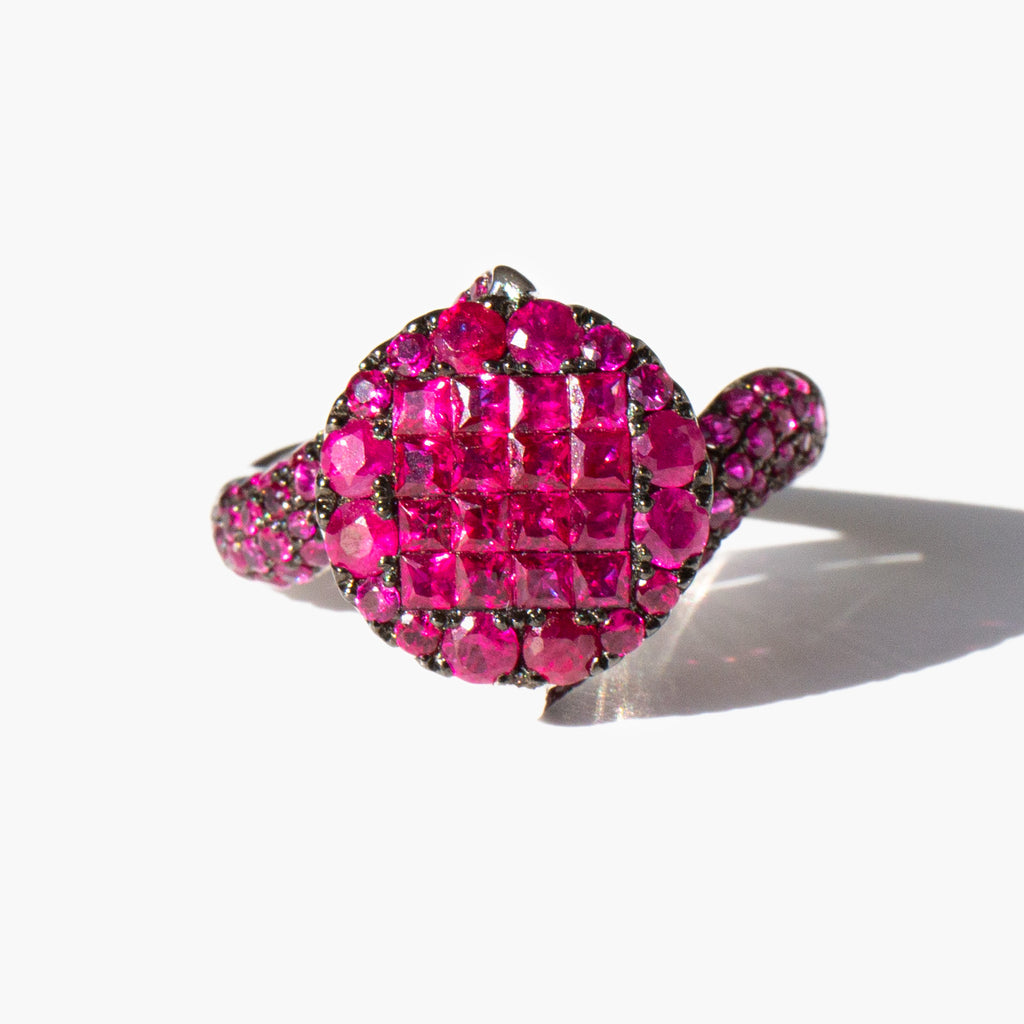 Elegantly sculpted 18k white gold ring with over 2 carats of invisibly set pave rubies. A symbol of powerful emotions and ardent passions, rubies are said to increase sexual energy and are associated with love and commitment.
