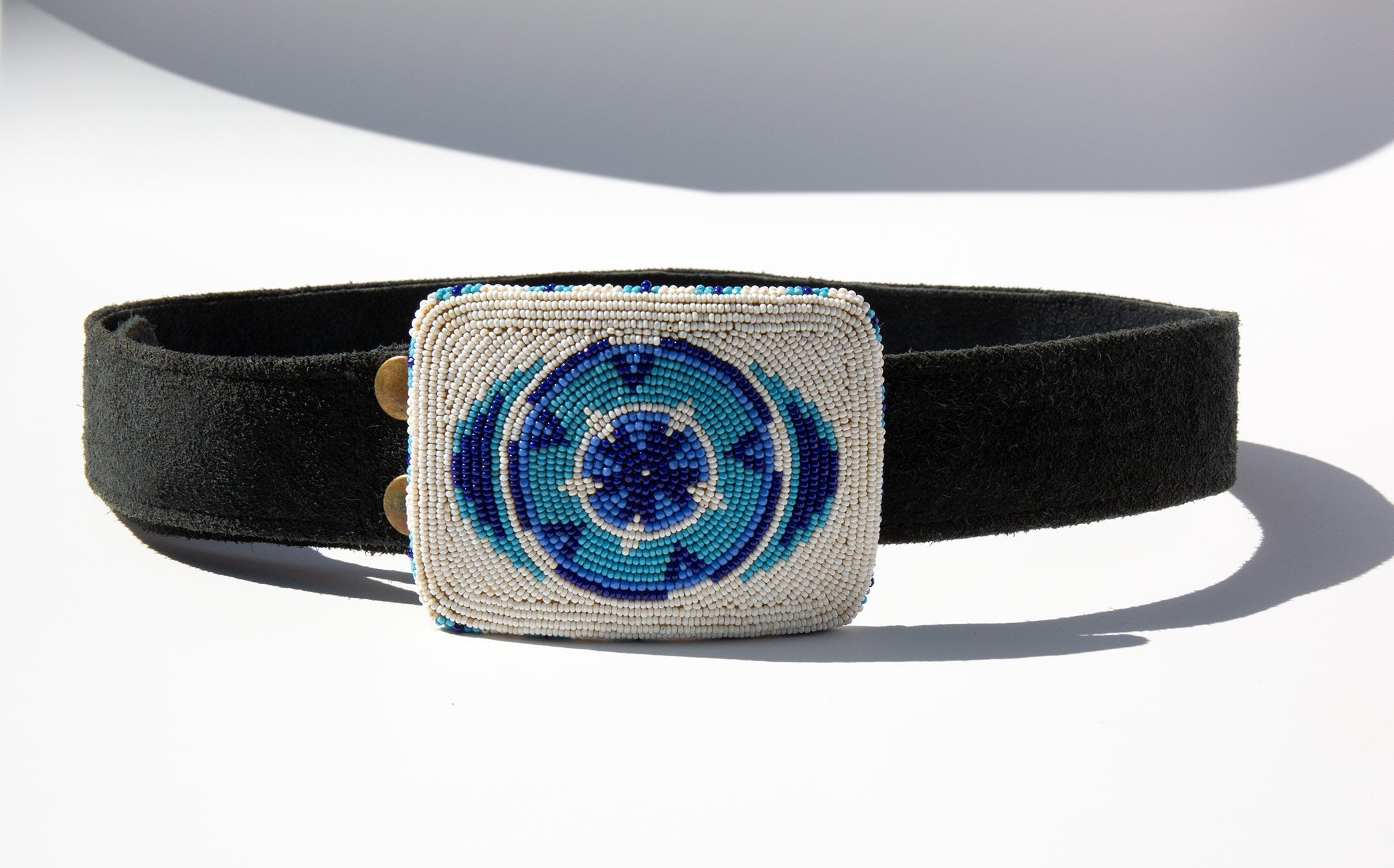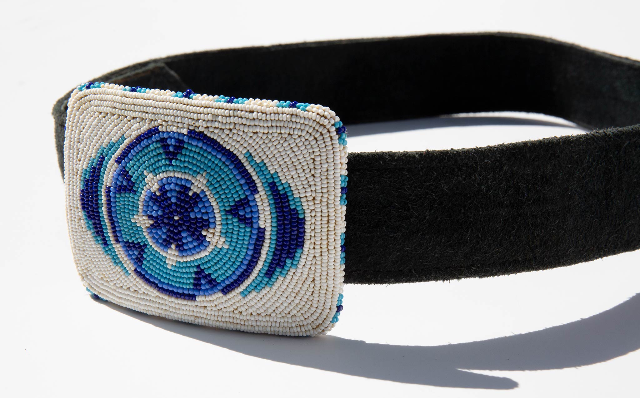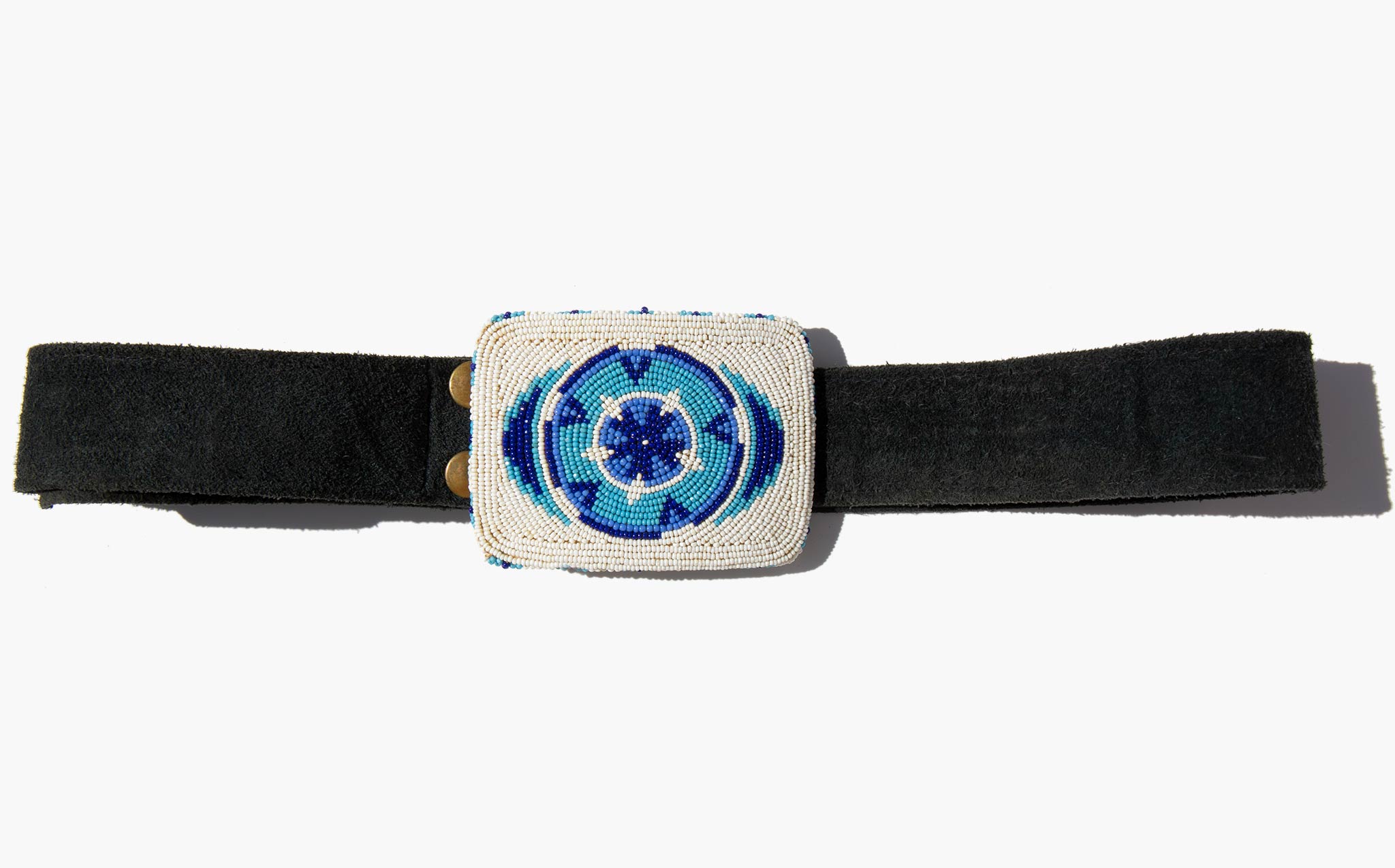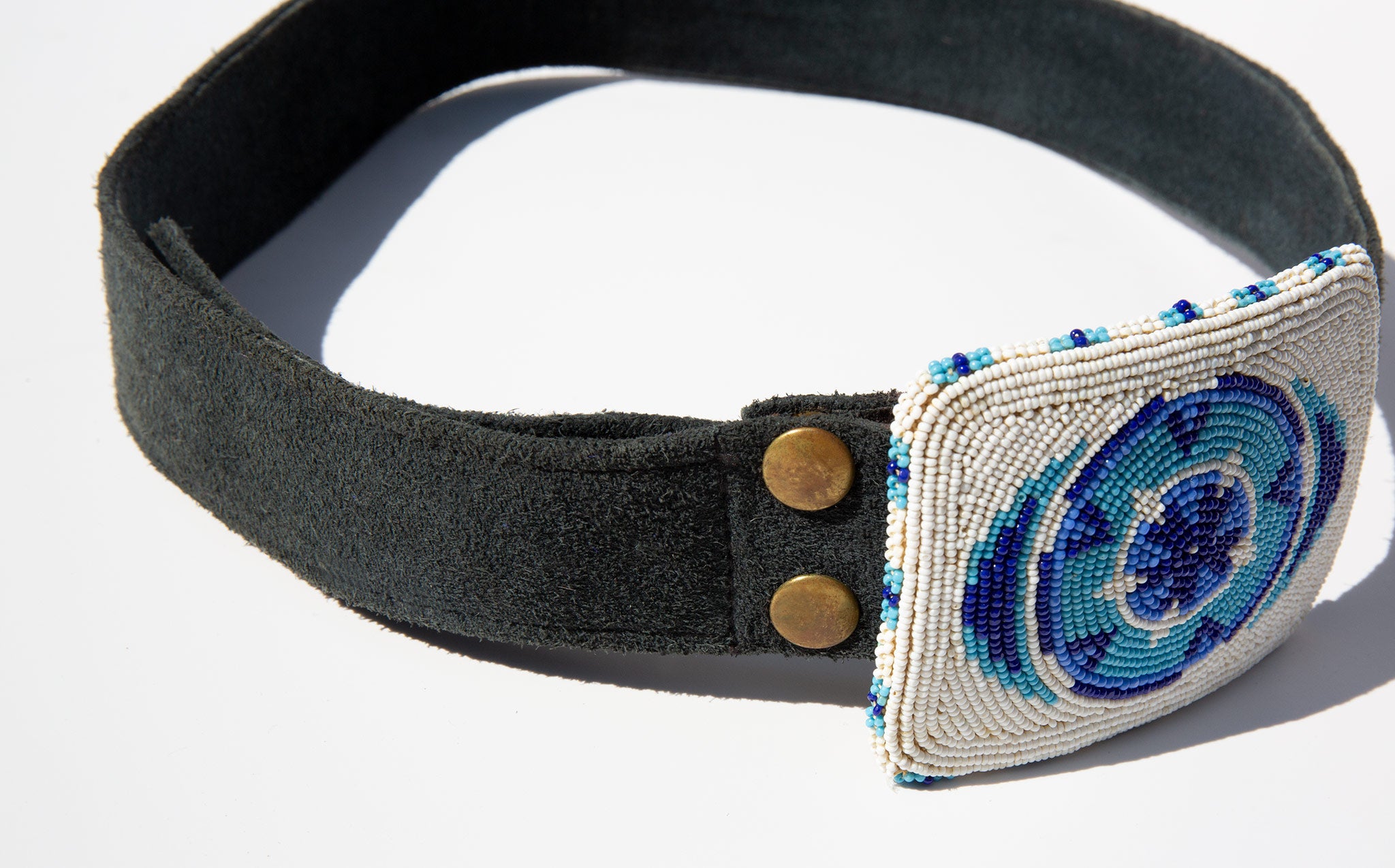 Vintage Native American belt with hand beaded buckle and a soft navy suede strap with hook and eye closure.