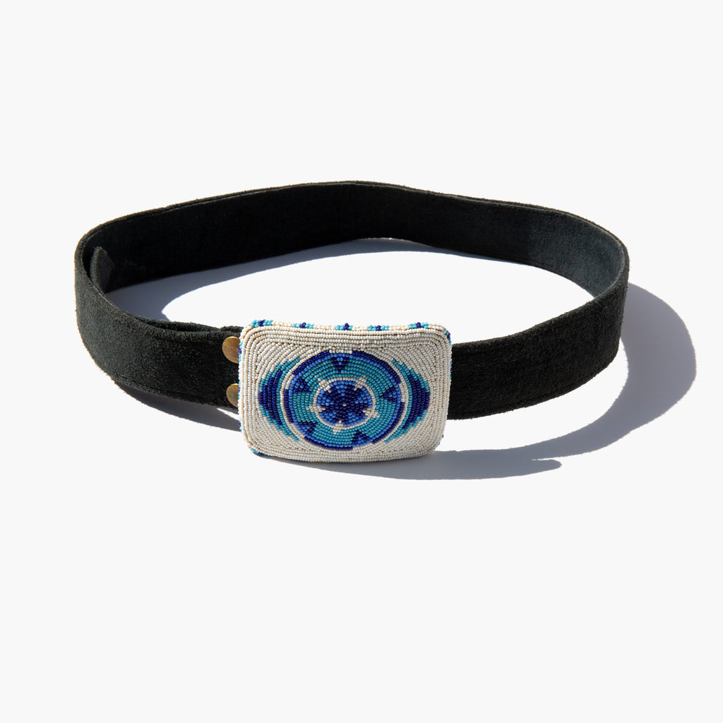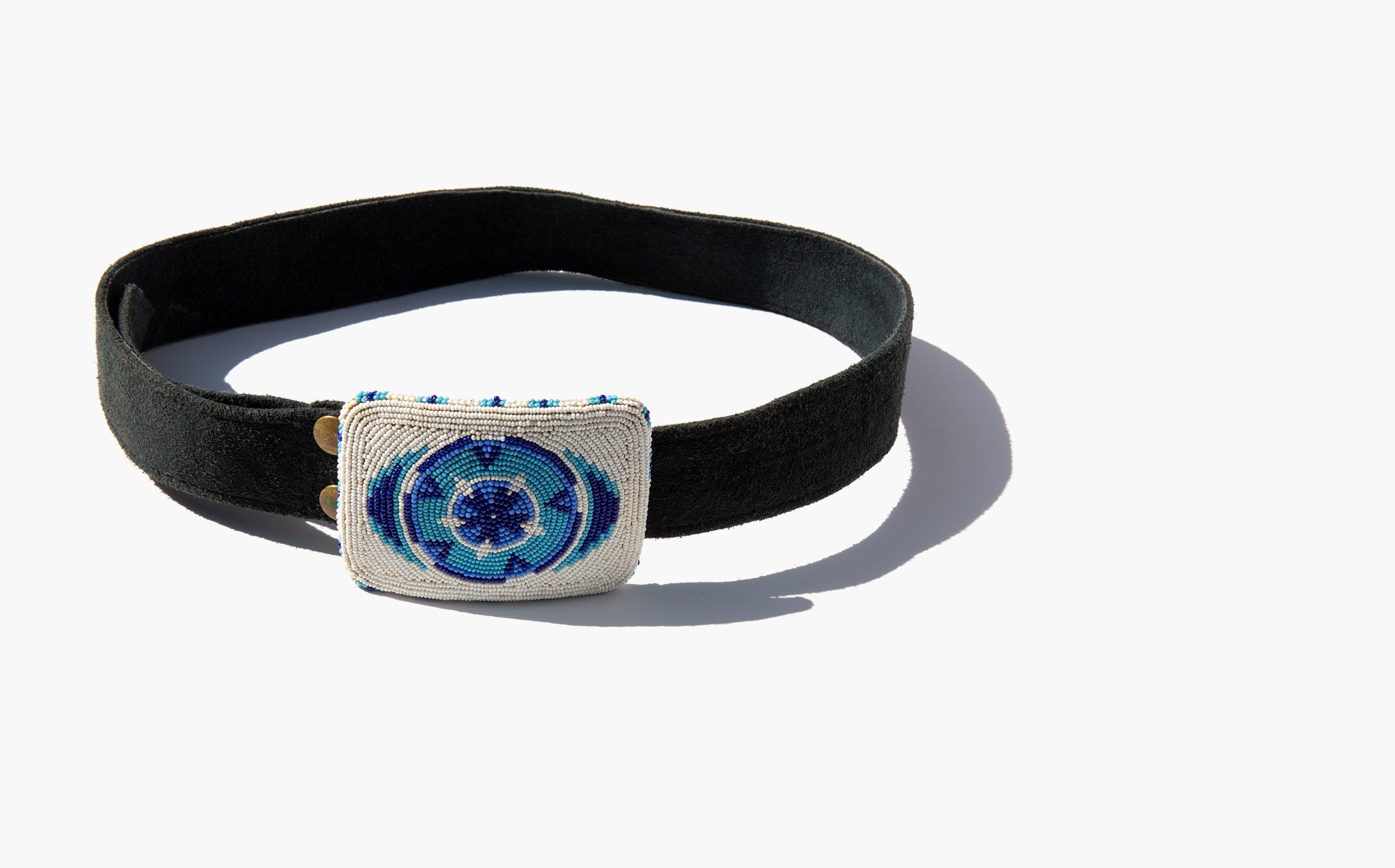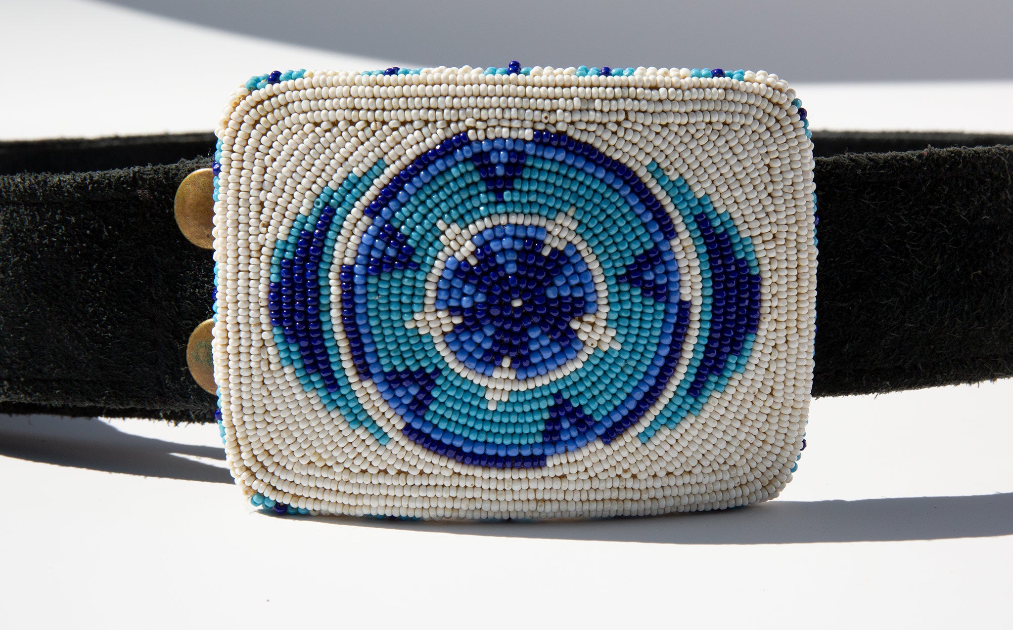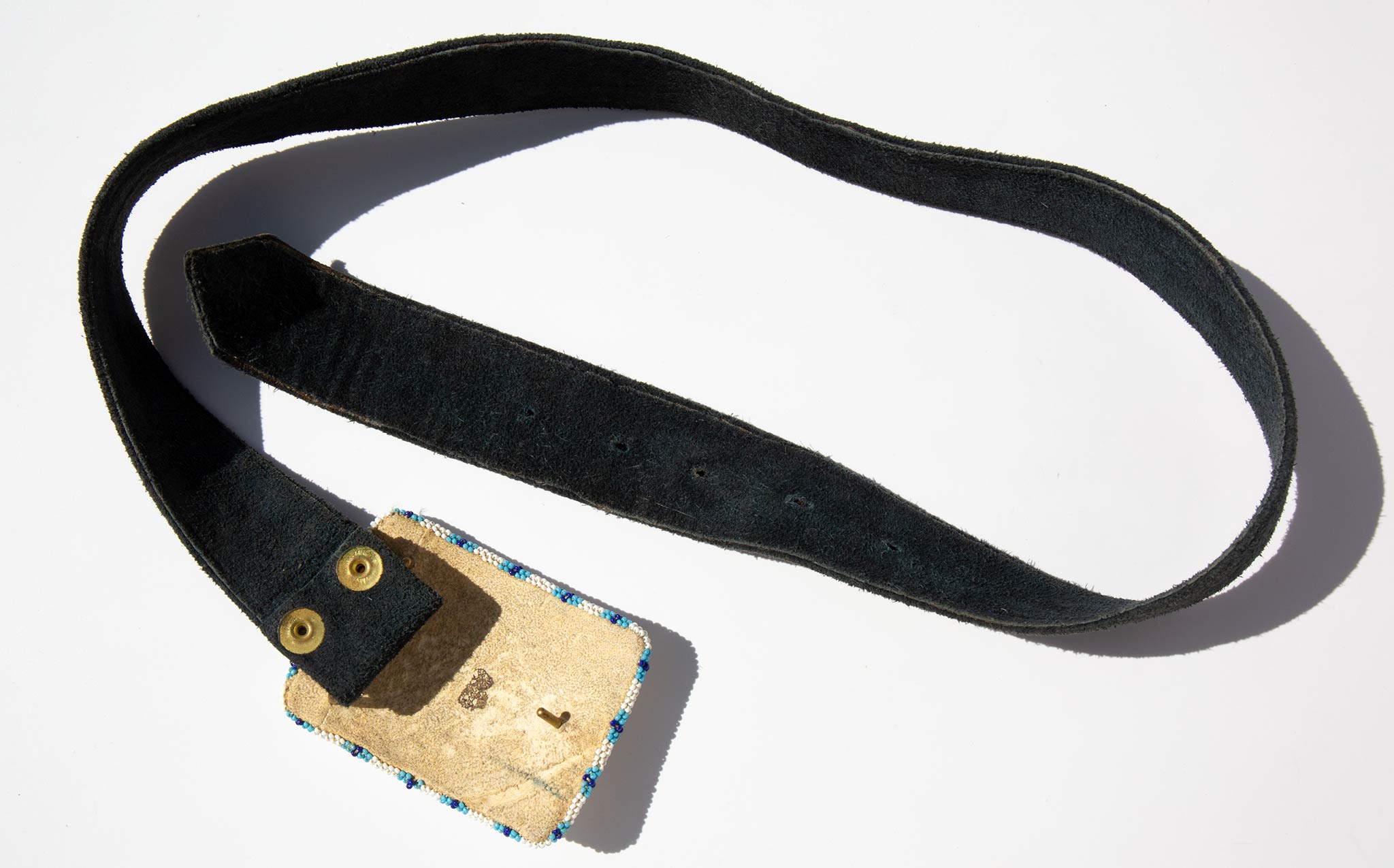 Vintage Native American belt with hand beaded buckle and a soft navy suede strap with hook and eye closure.