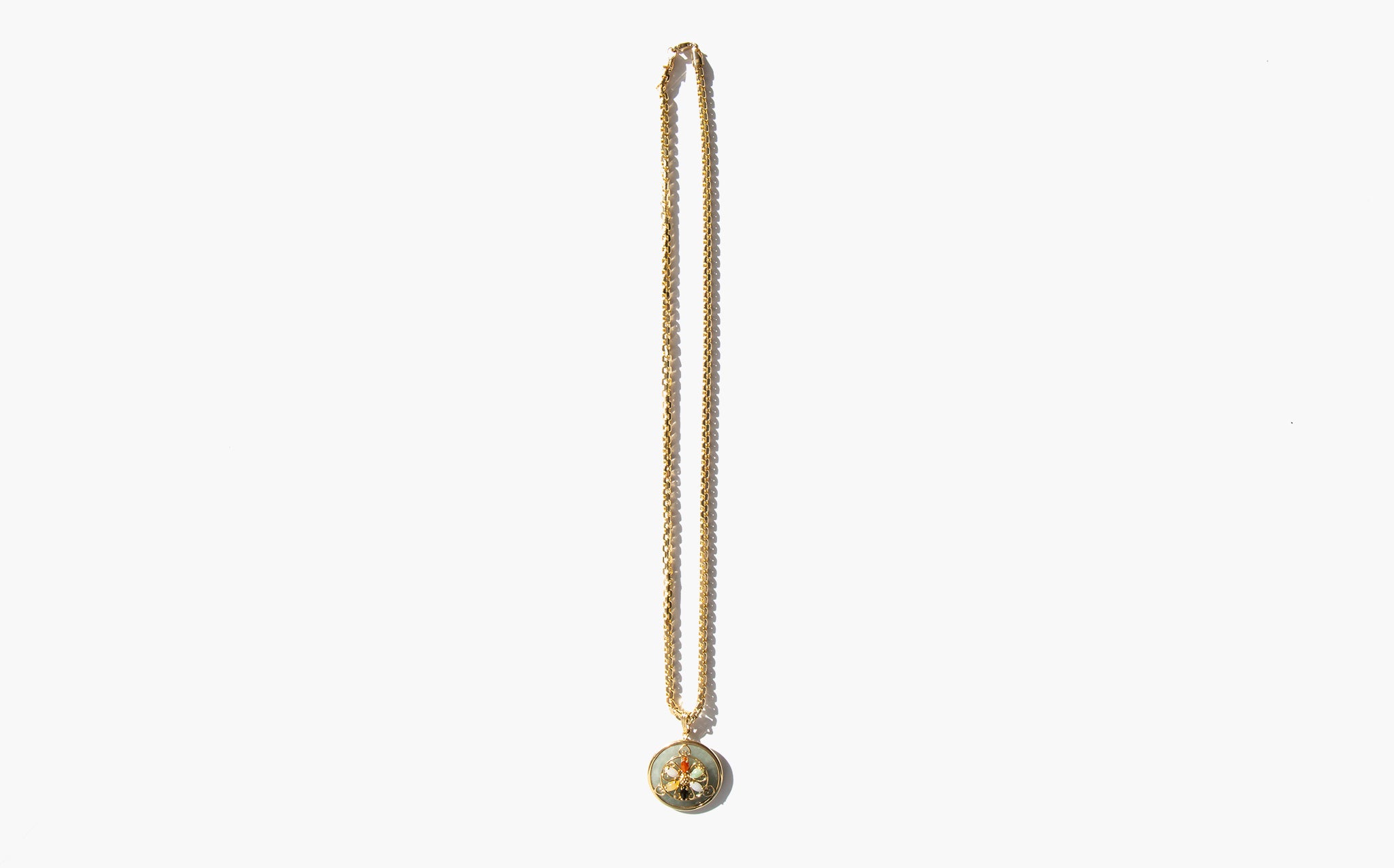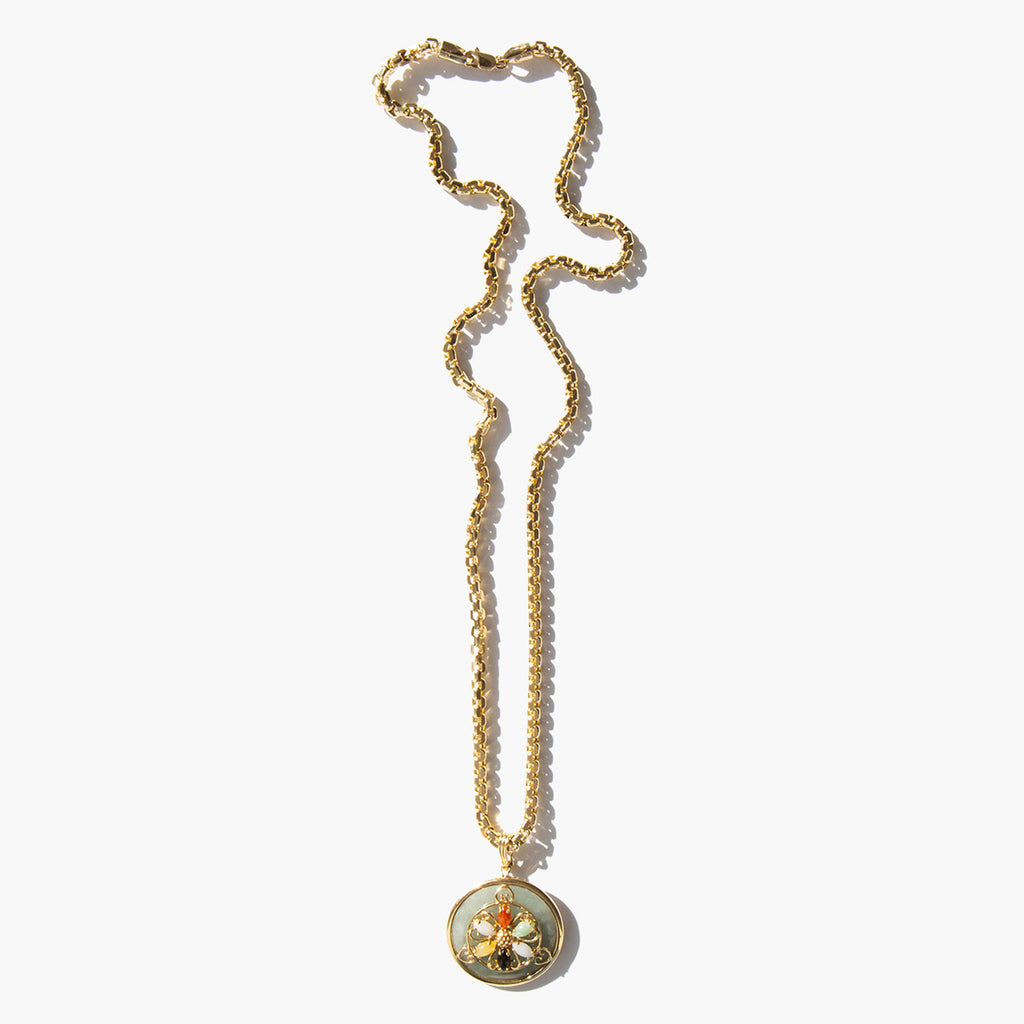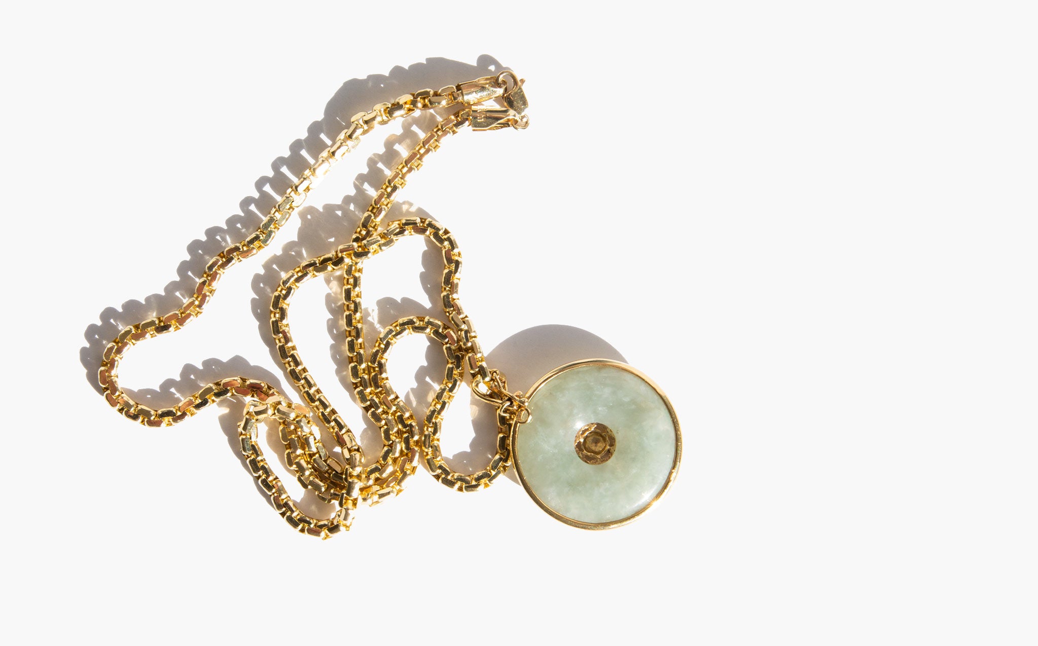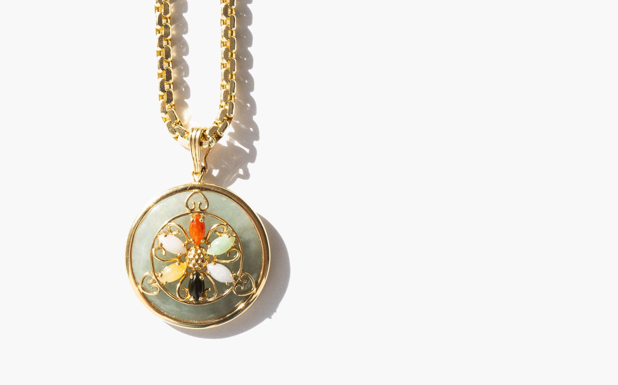 Colorful jade and 14k gold pendant on a shimmering 14k gold snake link chain. For centuries jade has been used as a talisman of good luck and to dispel negative energy.