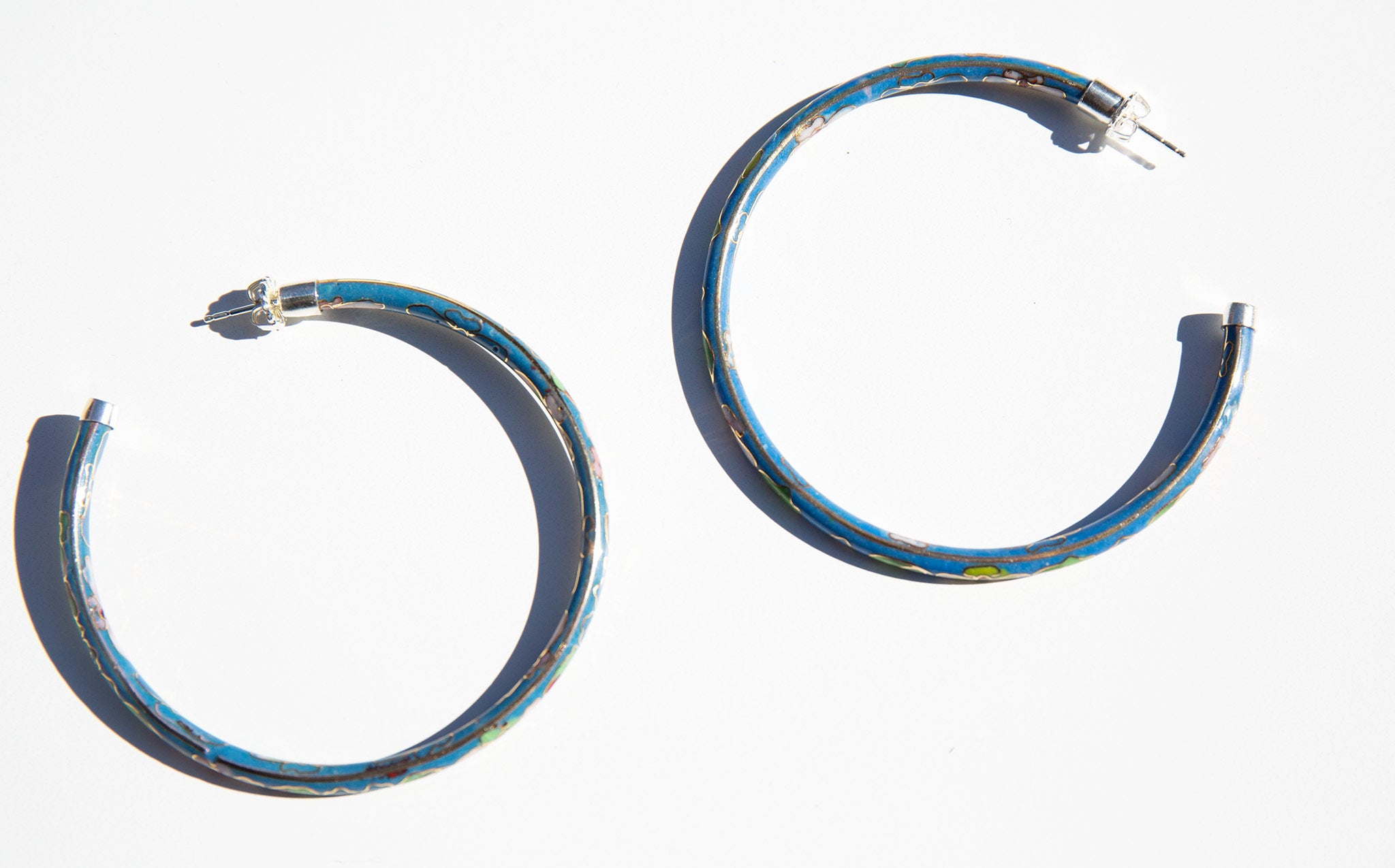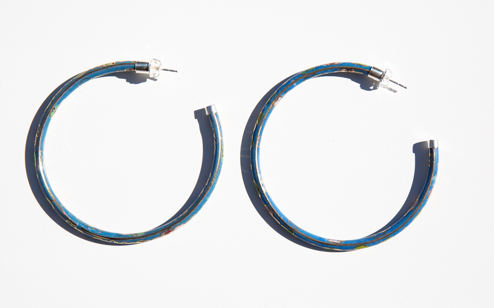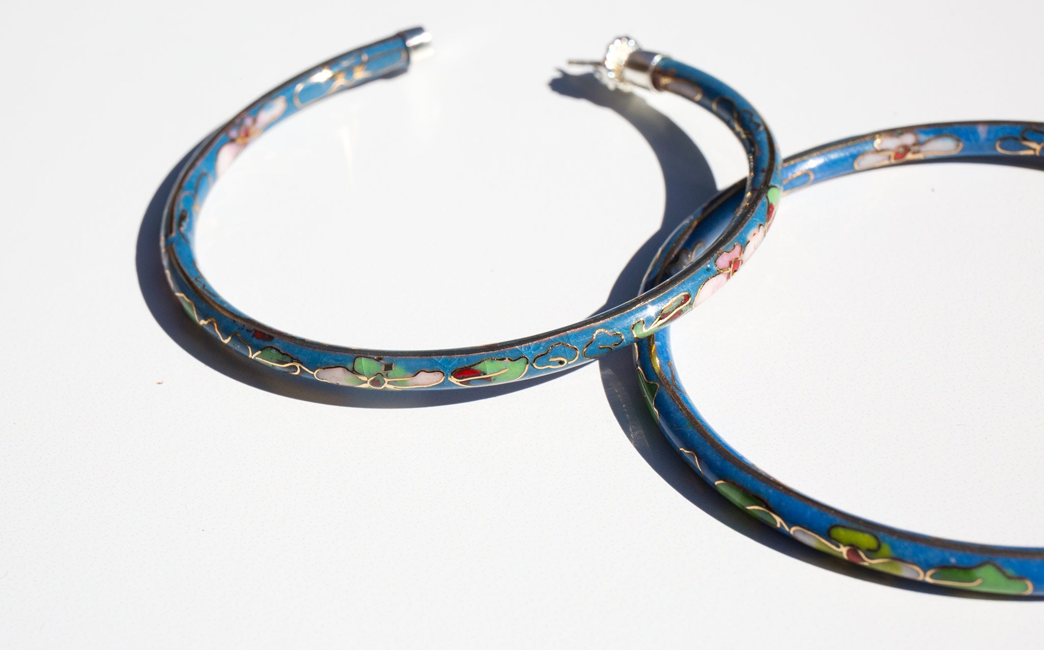 Falize Hoop earrings are handmade using re-purposed cloisonné bangles, and finished with sterling silver tips, posts, and backs.