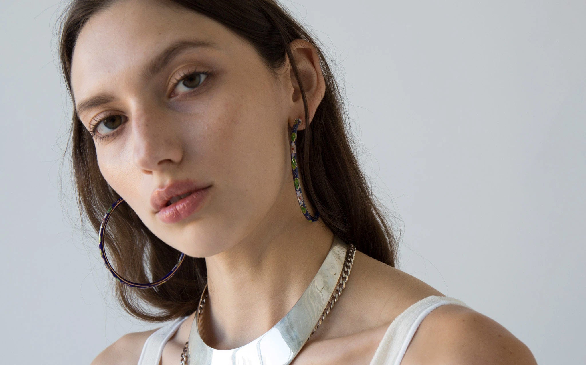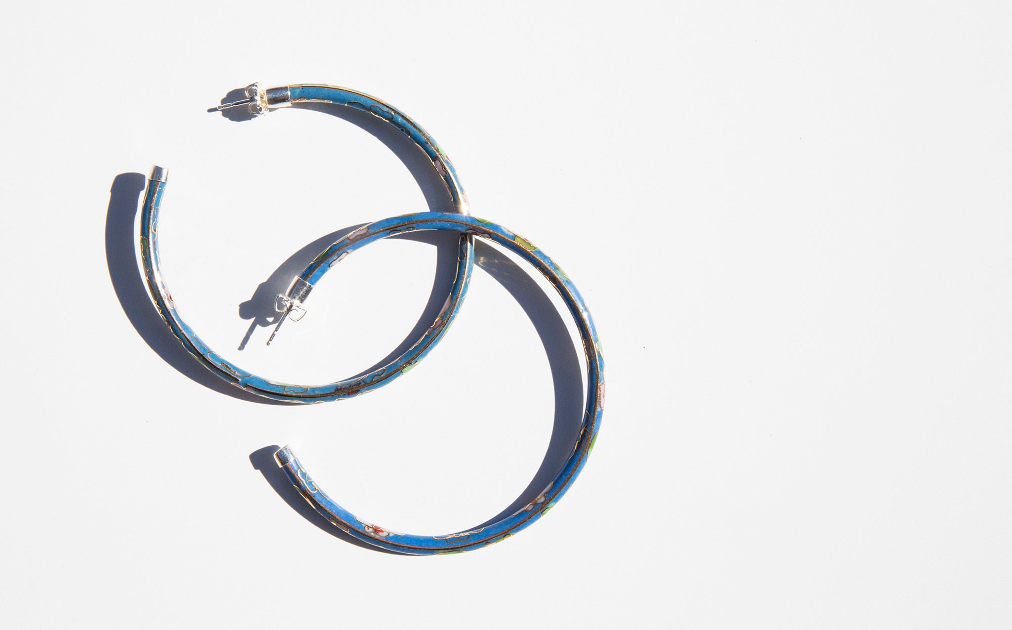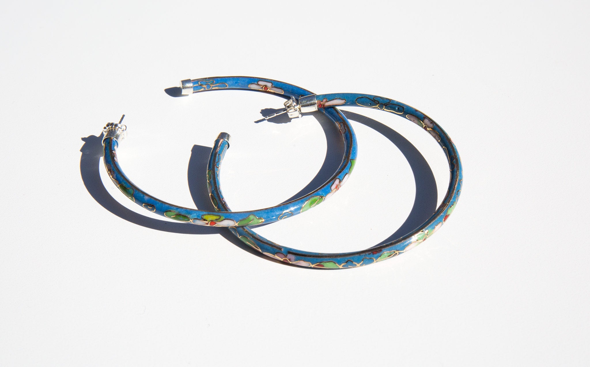 Falize Hoop earrings are handmade using re-purposed cloisonné bangles, and finished with sterling silver tips, posts, and backs.