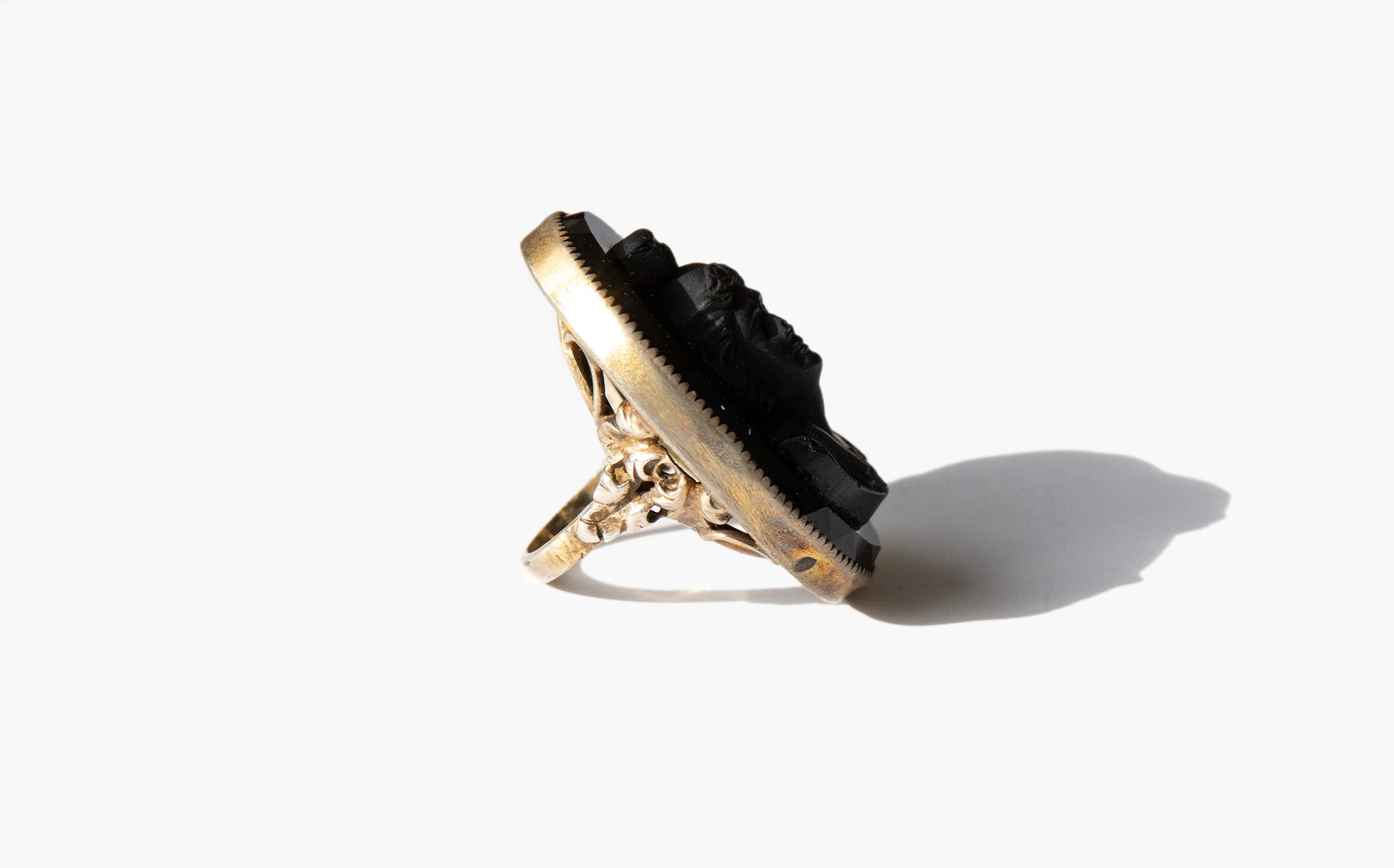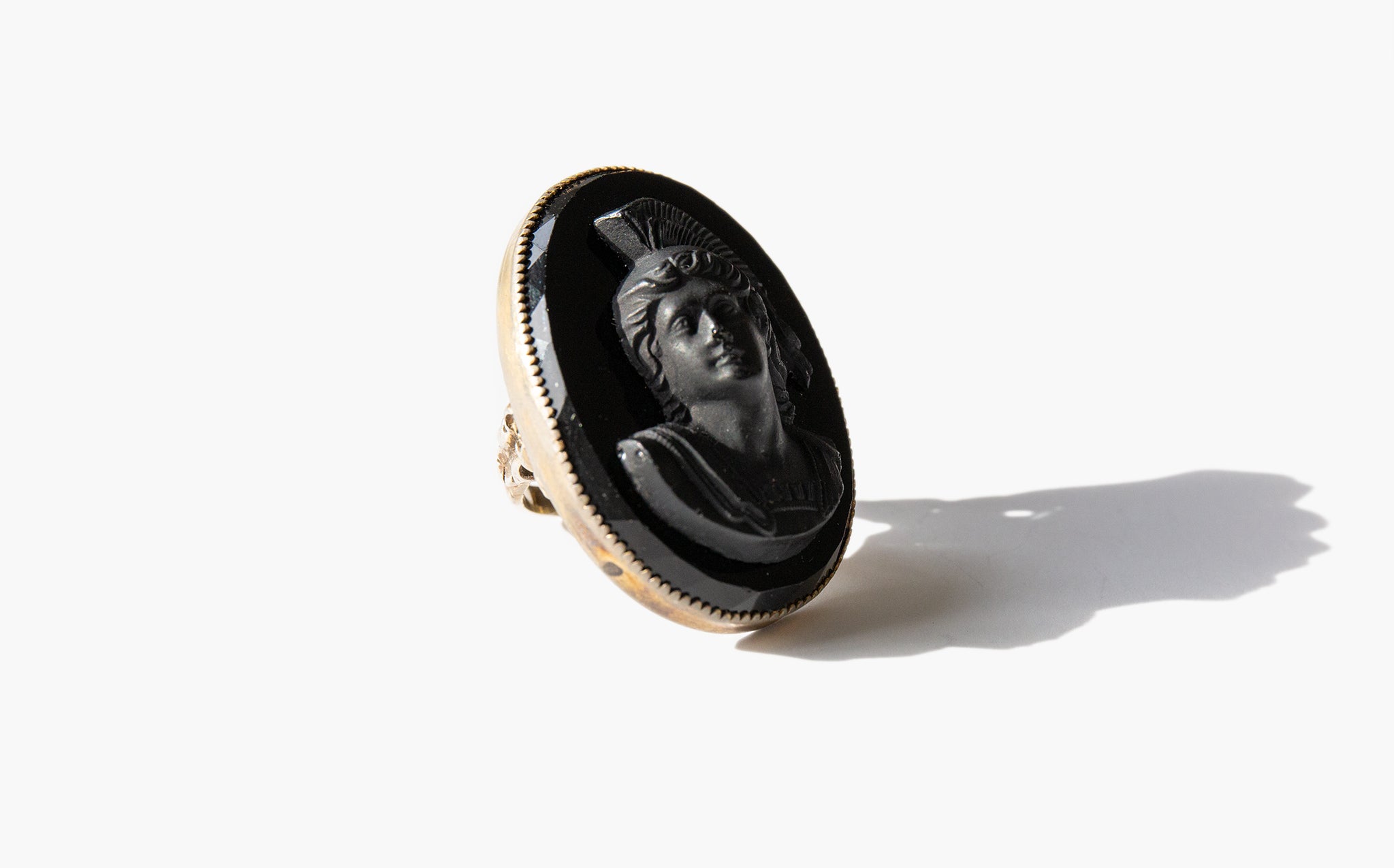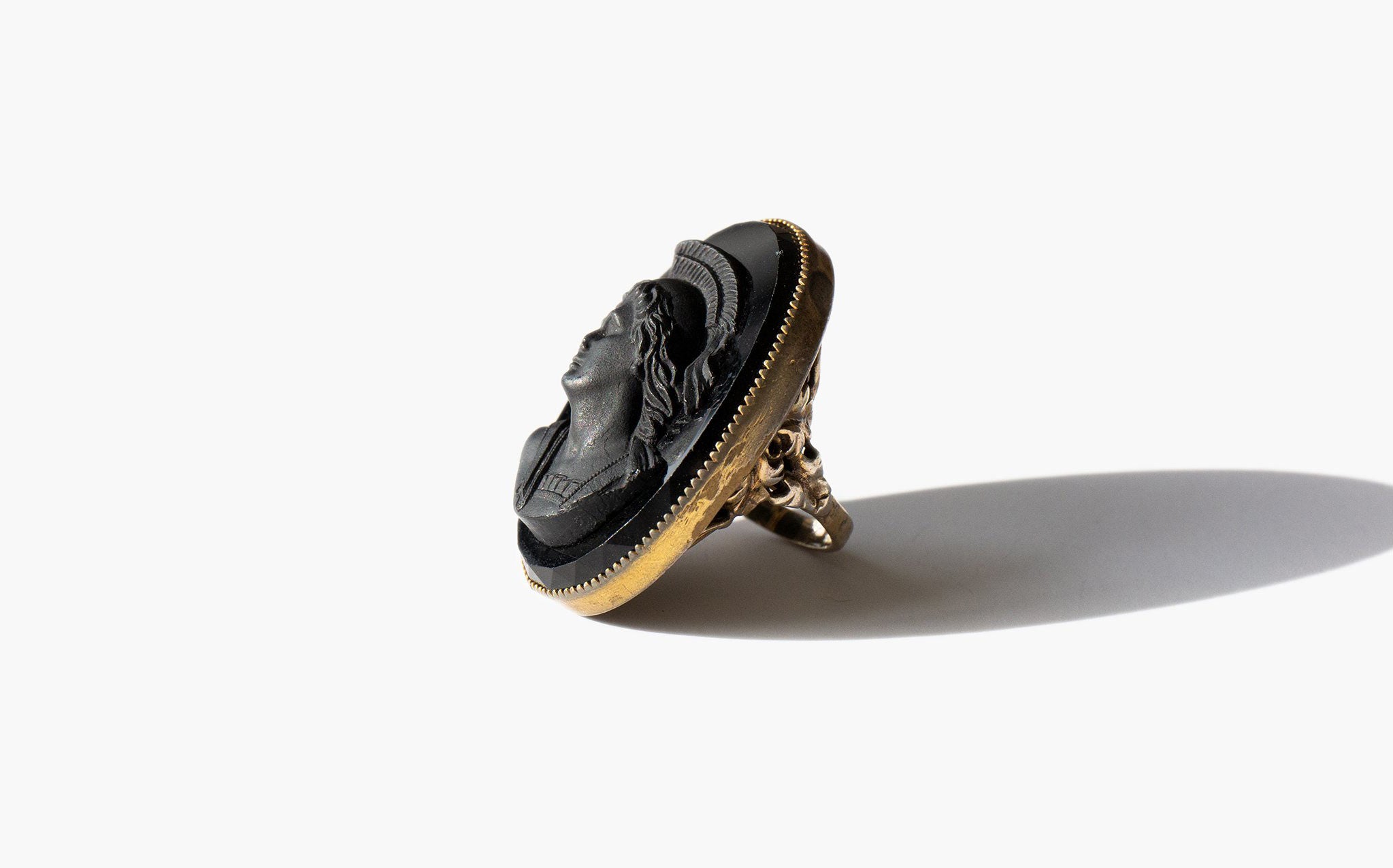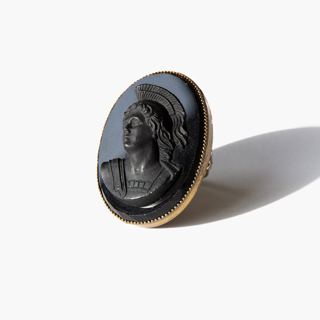 Grand black glass cameo ring set in intricately worked sterling silver.