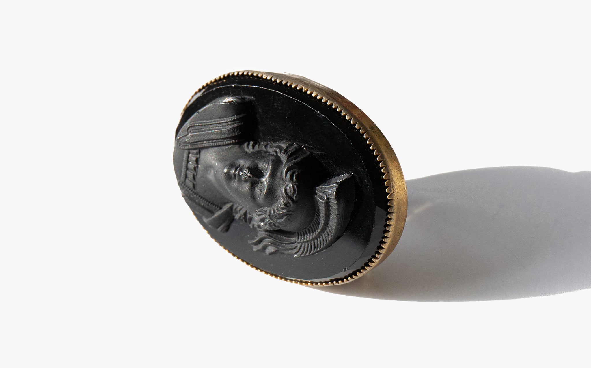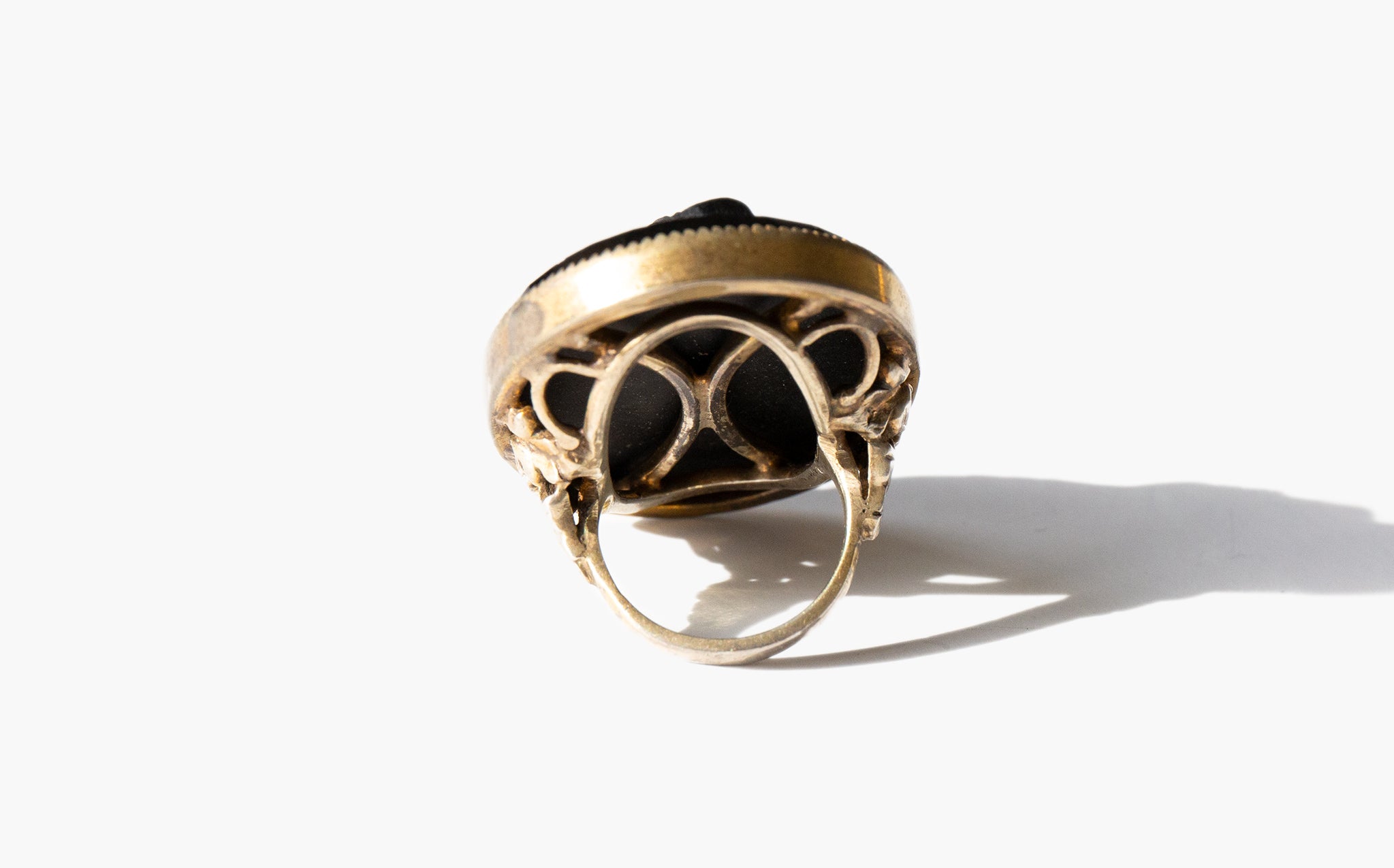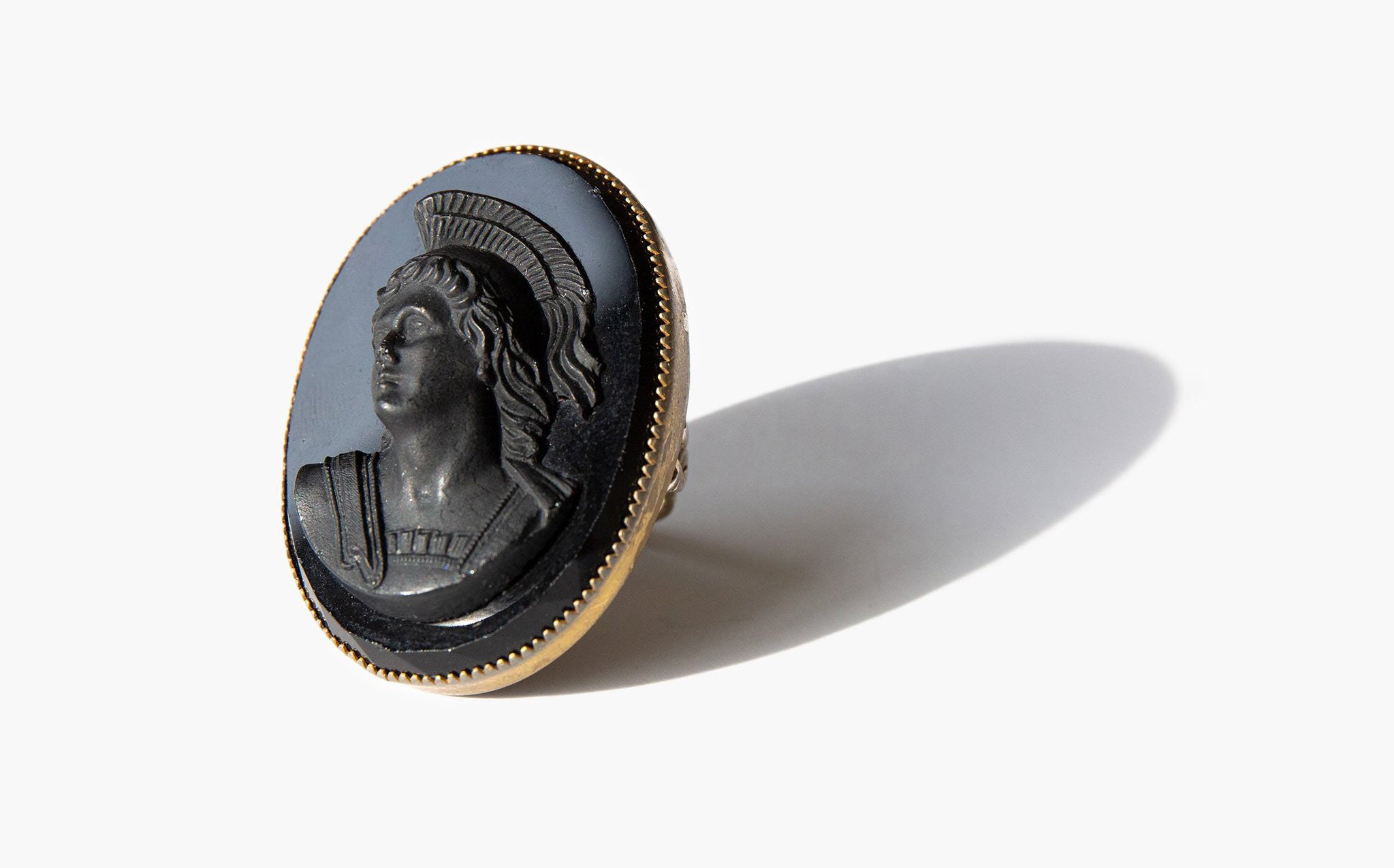 Grand black glass cameo ring set in intricately worked sterling silver.