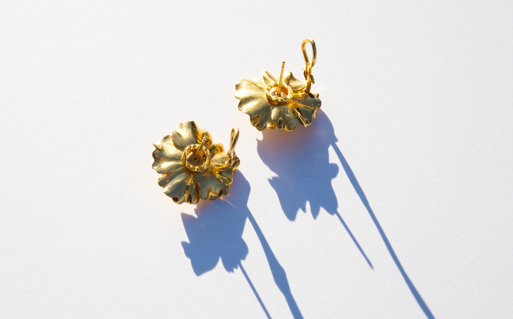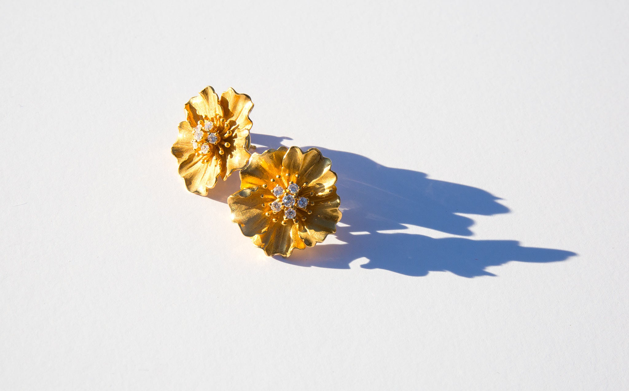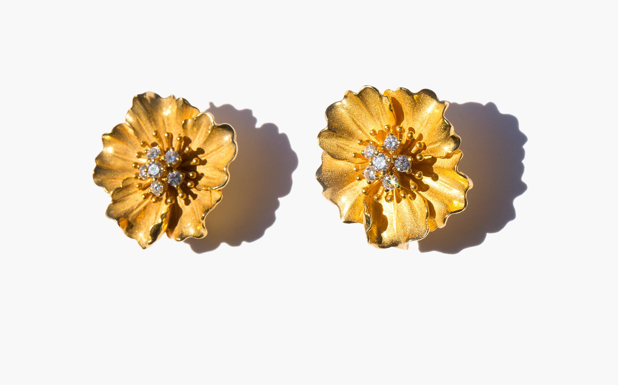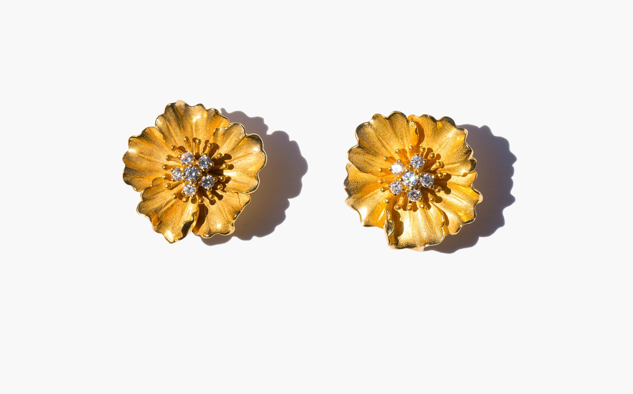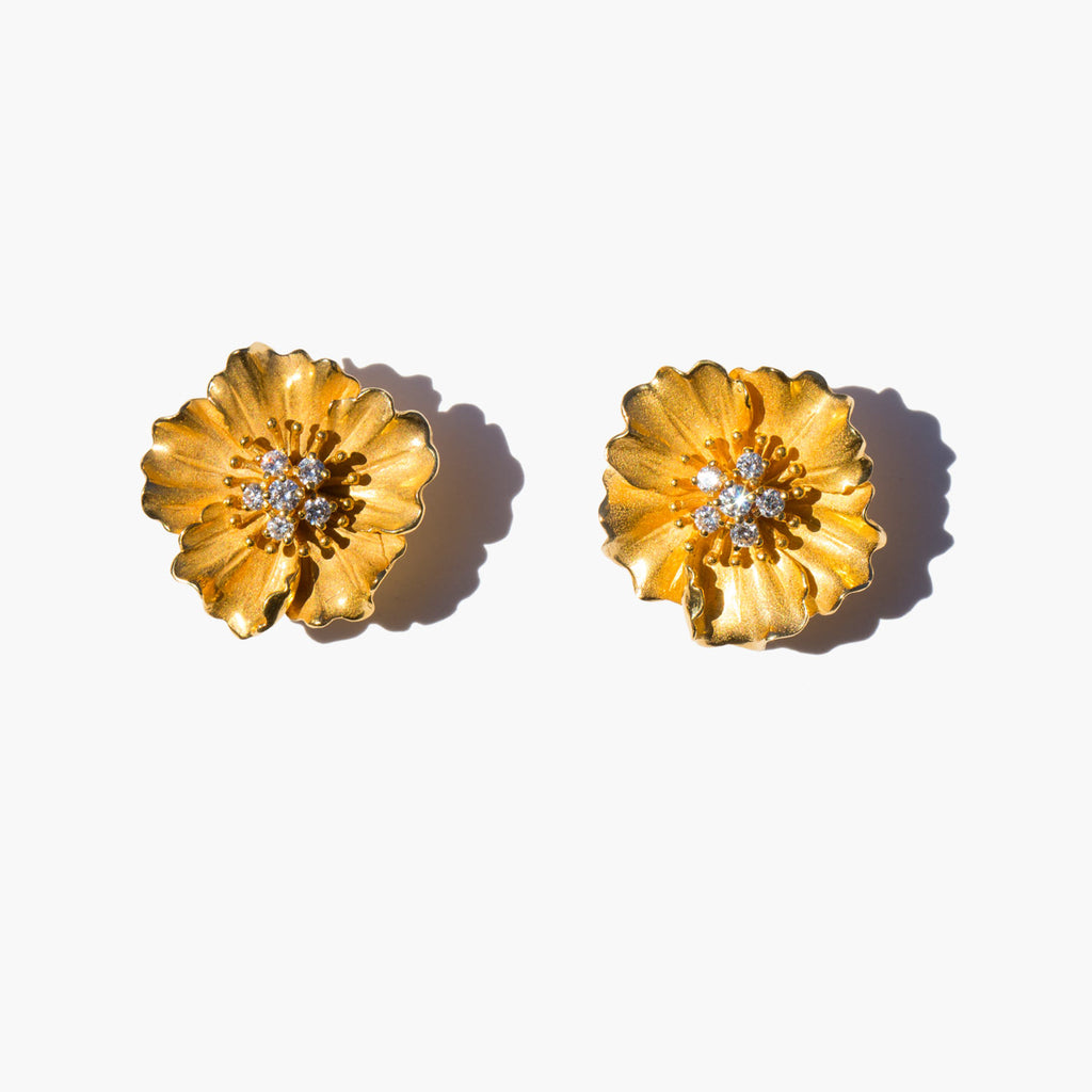 Elegant and stunning solid 14k gold flower statement earrings with diamond accents.