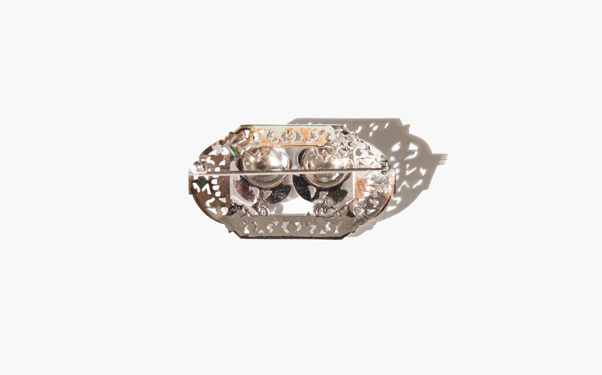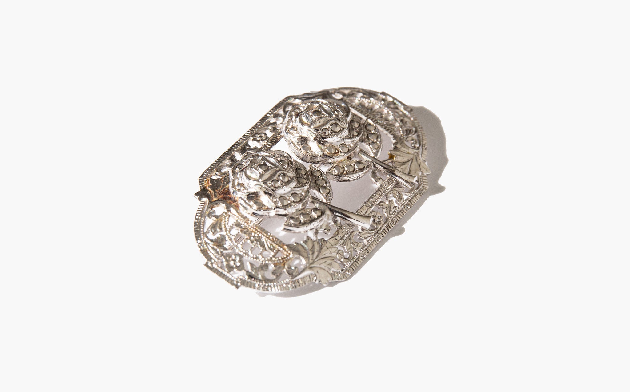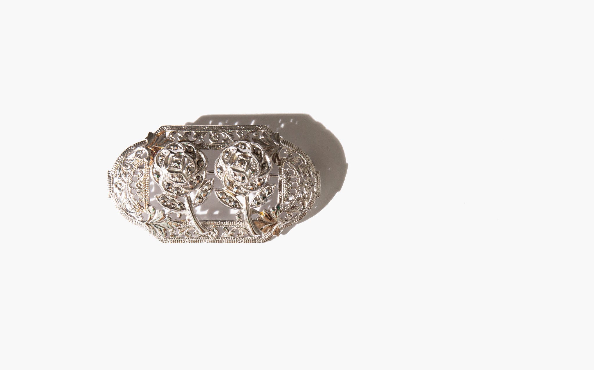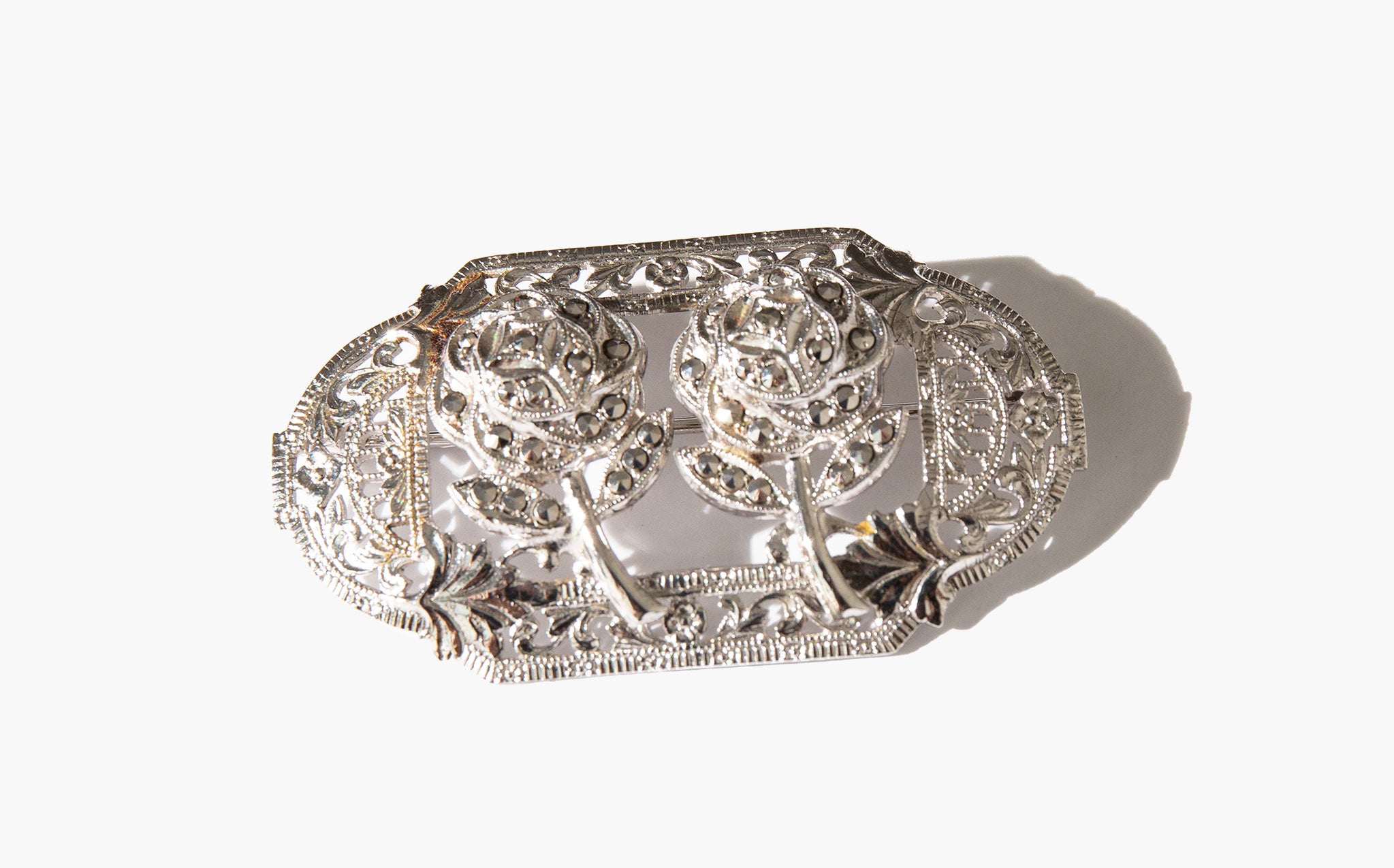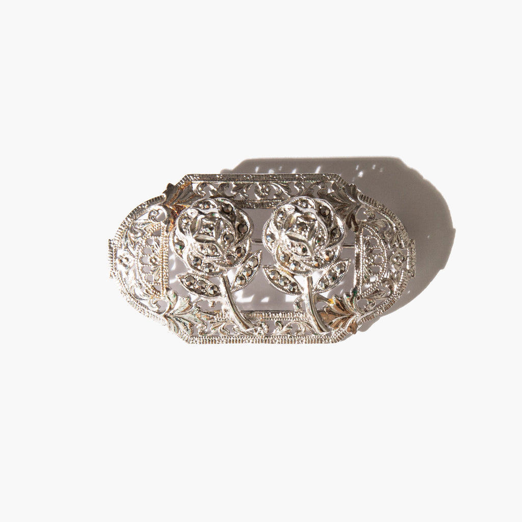 Ornate and gleaming sterling silver and marcasite rose pin.