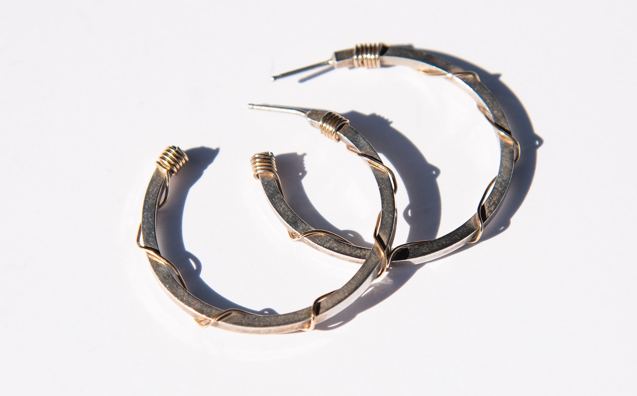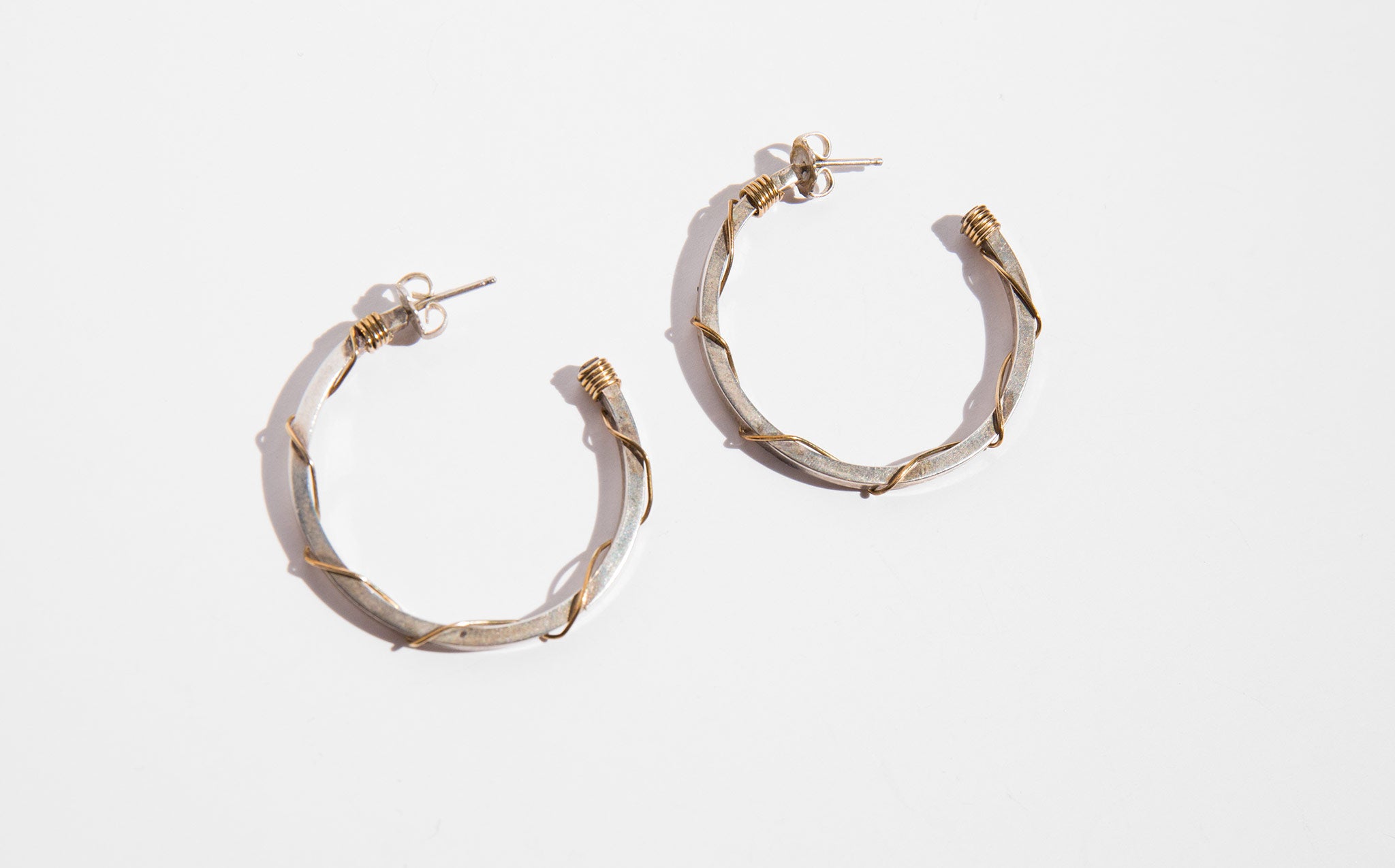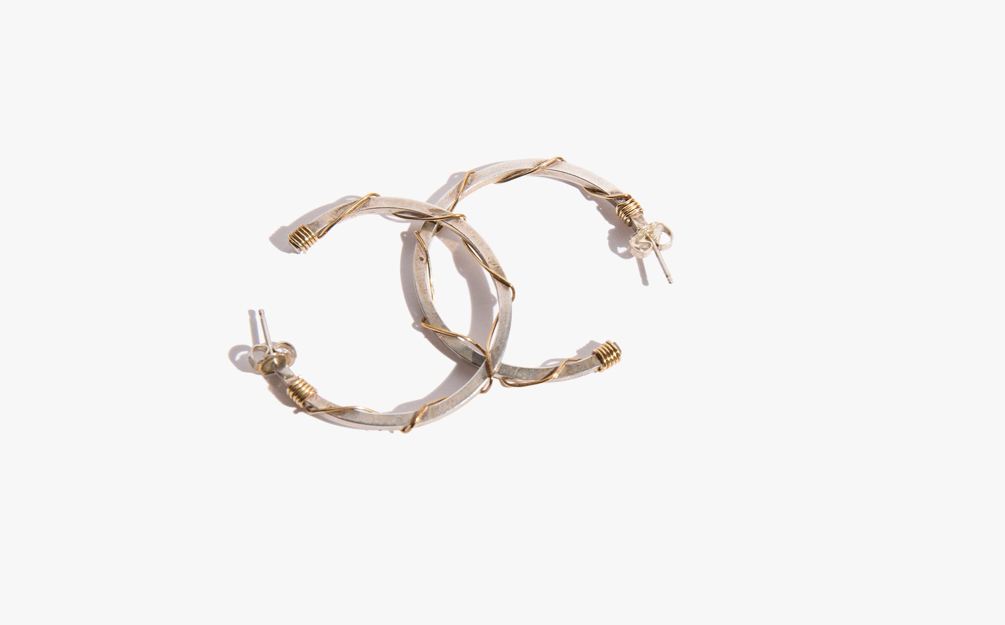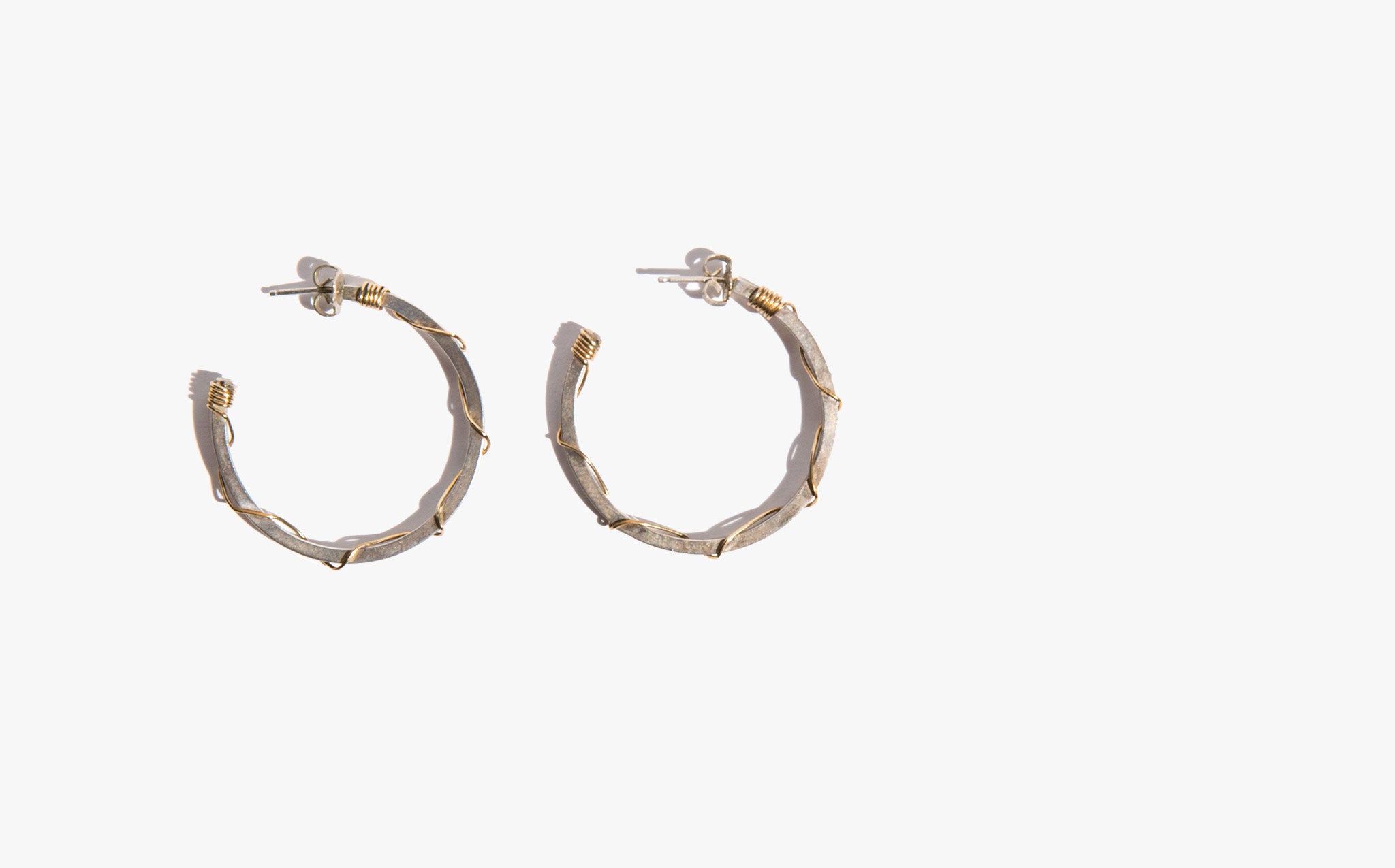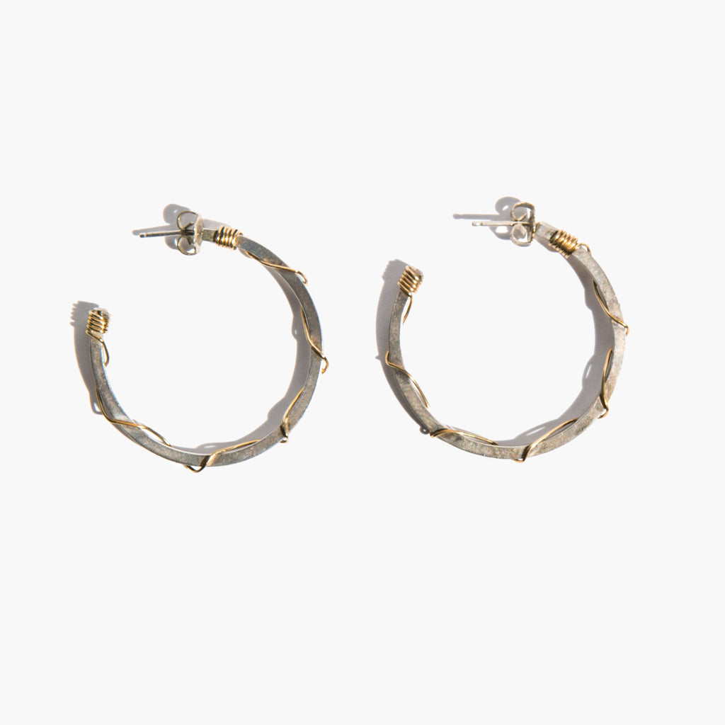 Classic silver hoops accented with a brass wire wrapping.