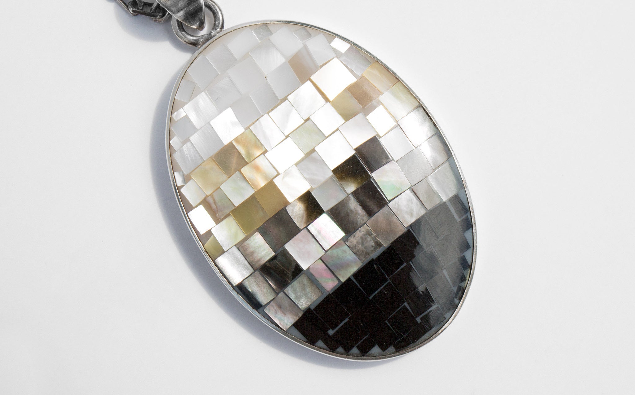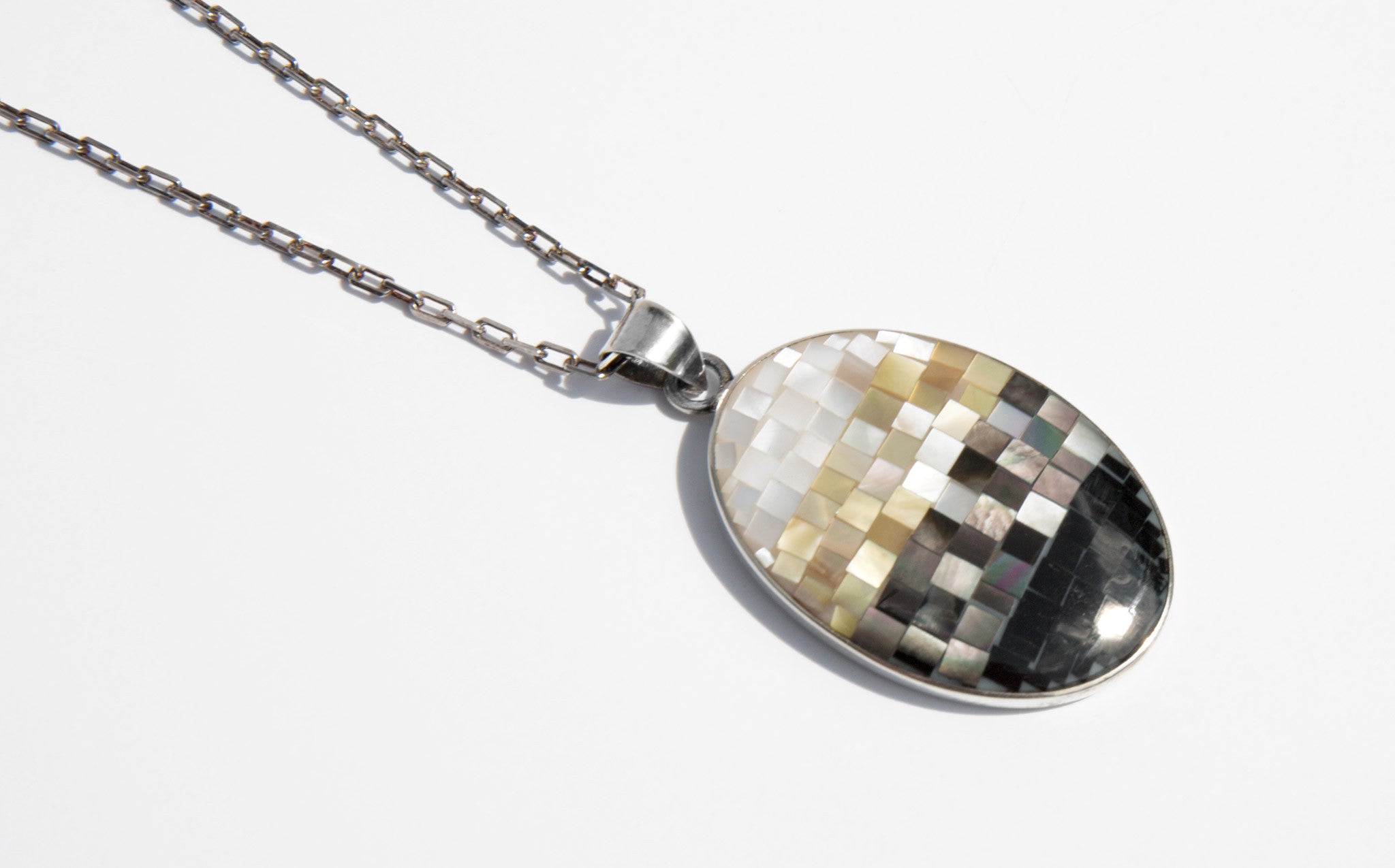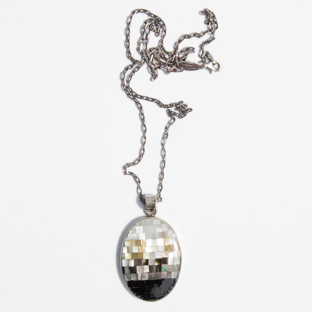 Mother of pearl, ombre mosaic pendant set in sterling silver on an unusual sterling silver link chain.