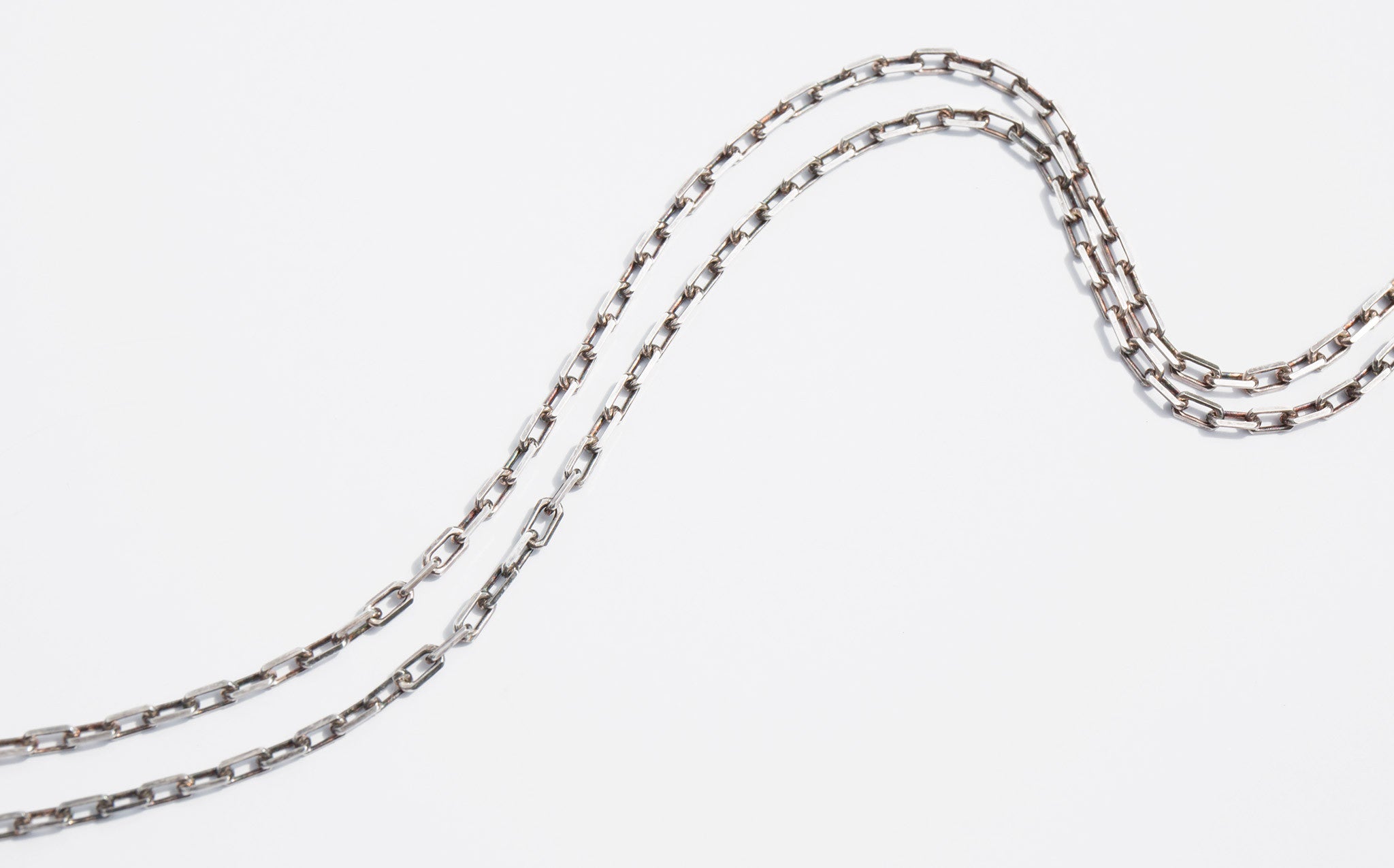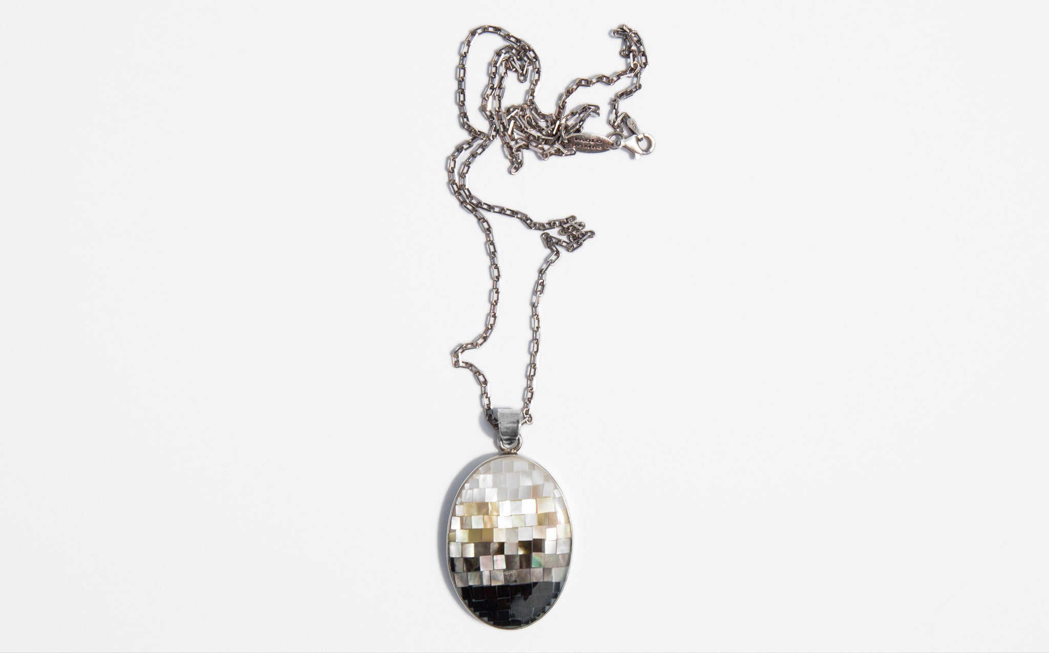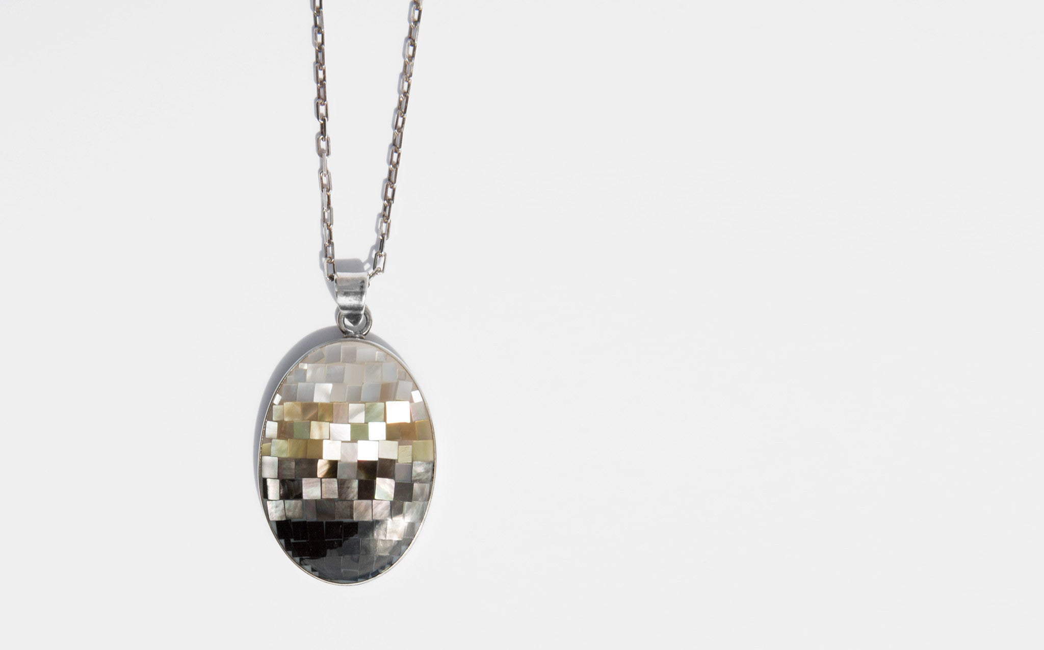 Mother of pearl, ombre mosaic pendant set in sterling silver on an unusual sterling silver link chain.