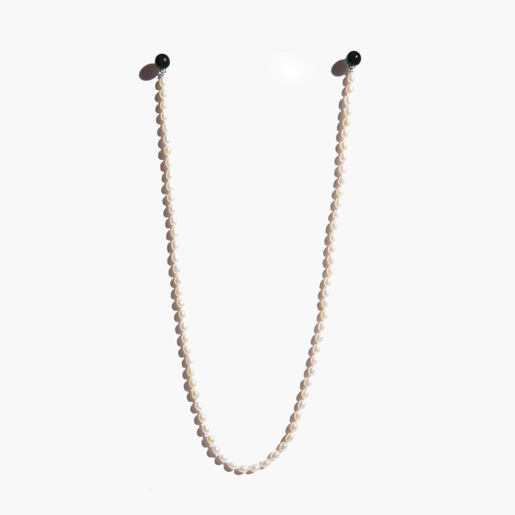 A Kindred Black original - natural onyx and 14k white gold stud earrings with a strung freshwater pearl drape. Drape can be worn to the front or the back. **This item is made to order and will ship in 2 weeks