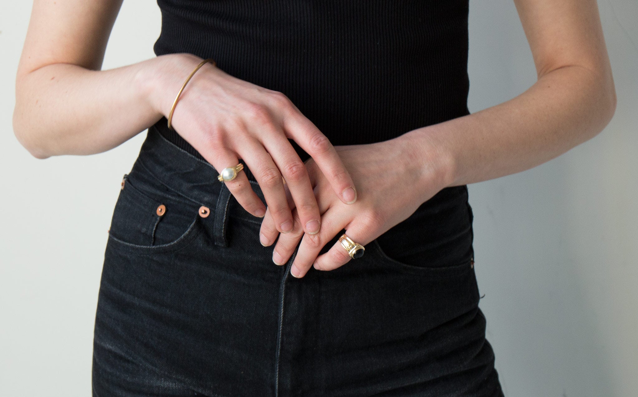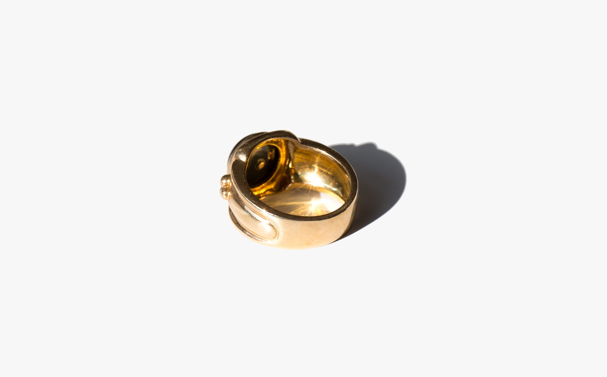 Large rounded onyx stone in an ornate solid 14k gold setting.