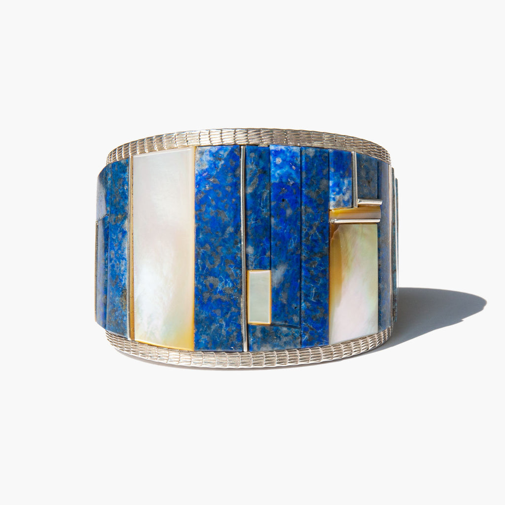 Incredible handmade solid sterling silver cuff inlaid with lapis and mother-of-pearl. Made and signed by the late Southwestern artist, Buddy Lee.