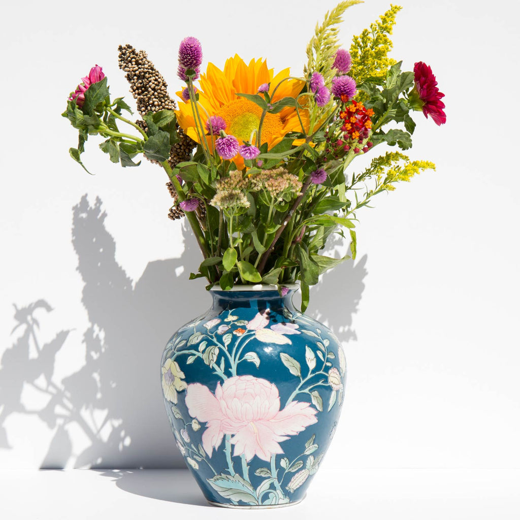 Chinese ceramic vase with an intricate peony floral pattern. Declared the national flower in China by the Qing Dynasty, the peony is rife with symbolism but is most often associated with friendship, good fortune and a happy marriage.