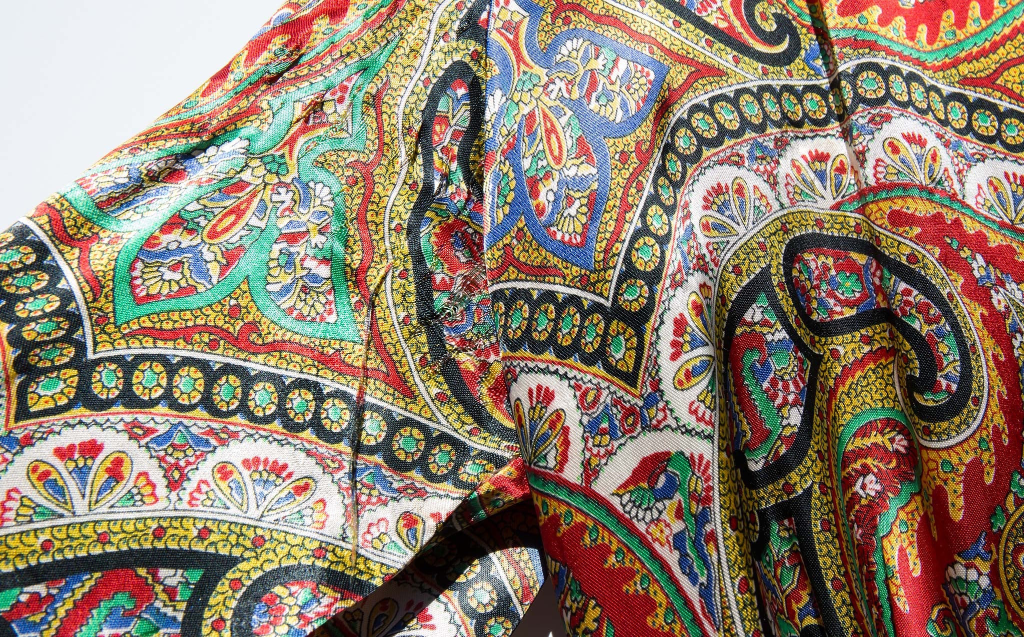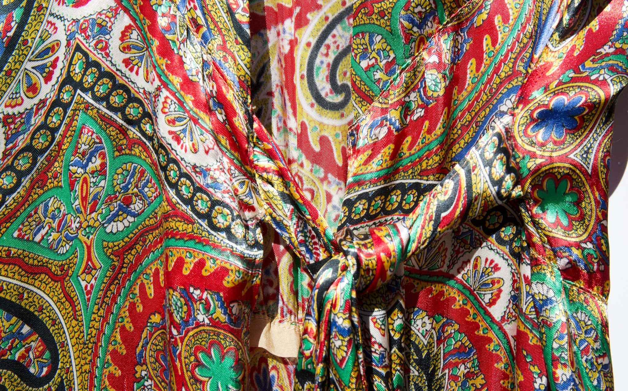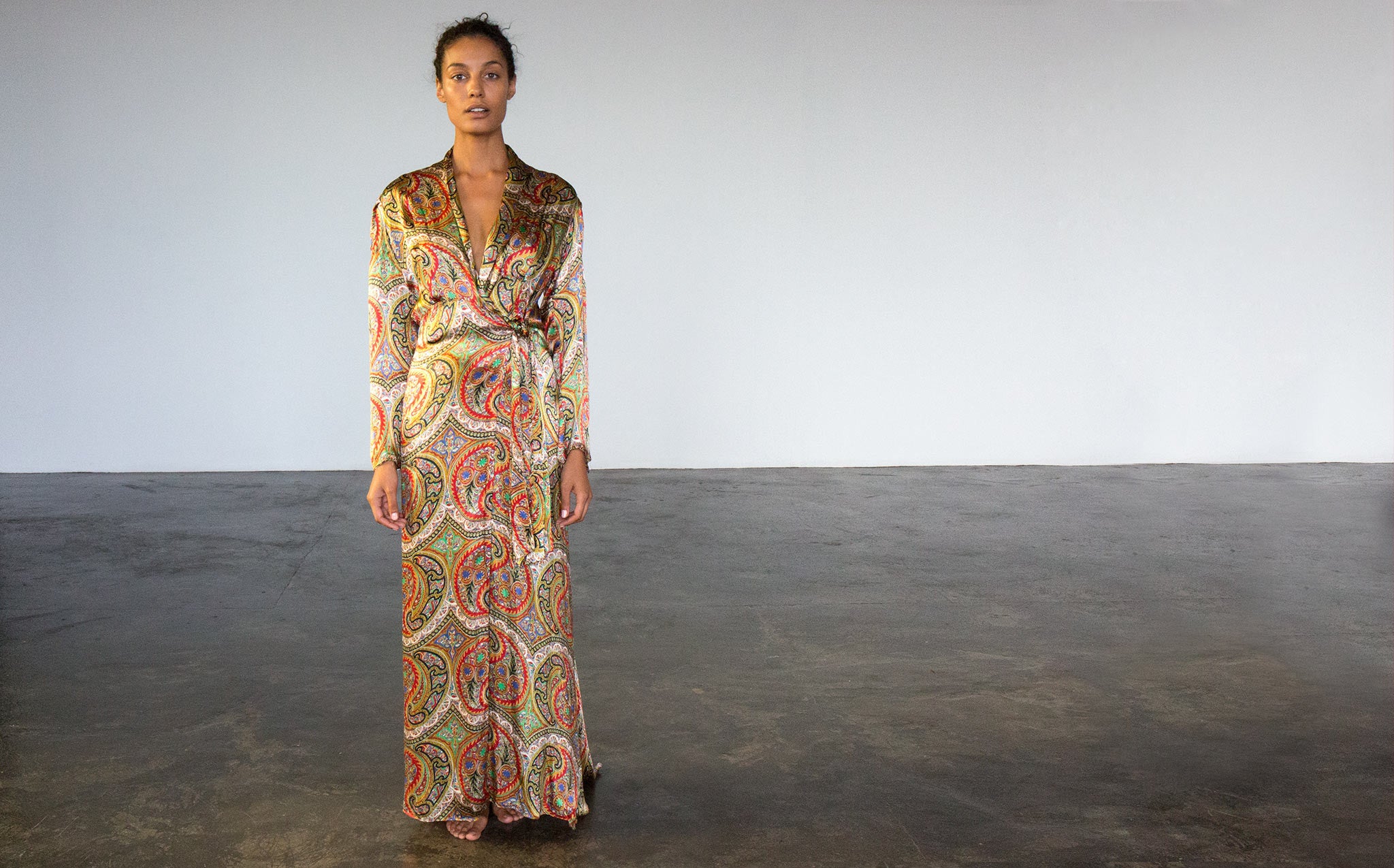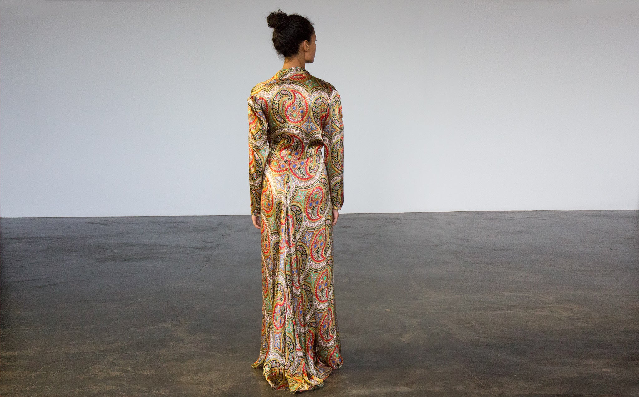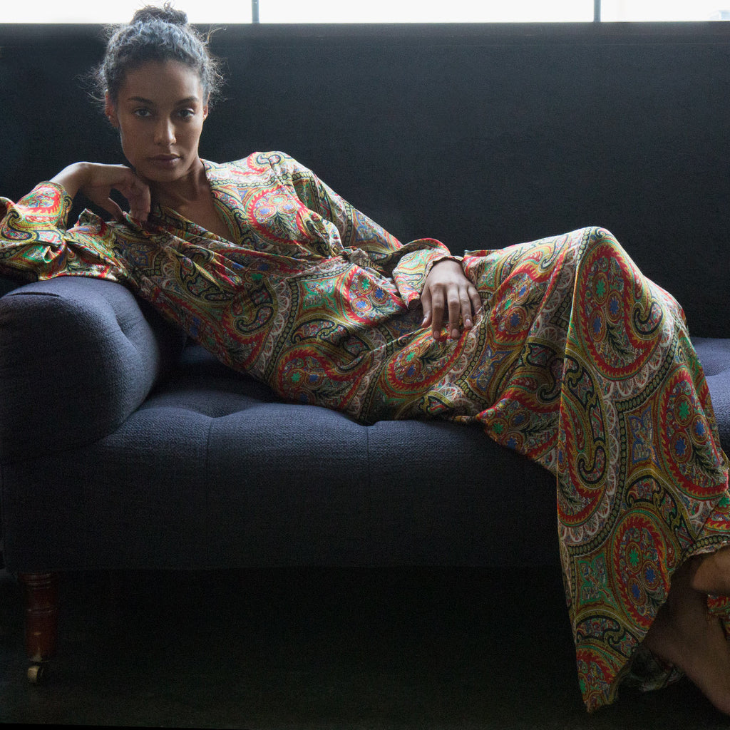 Vintage, sleek satin evening robe, epitomizing glamorous femininity and bygone era loungewear. Incredible and compelling with a bold paisley print and slight train at the back.